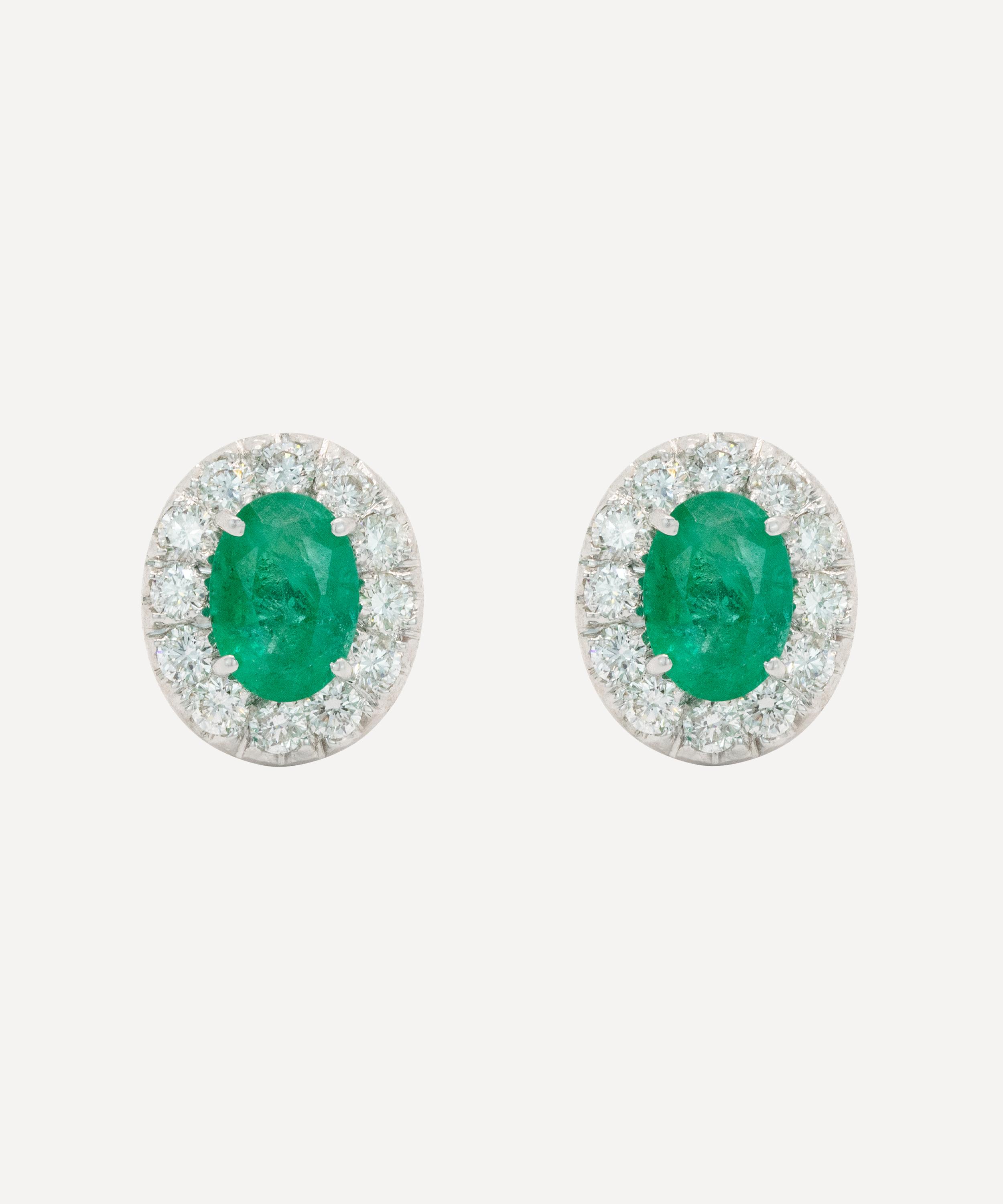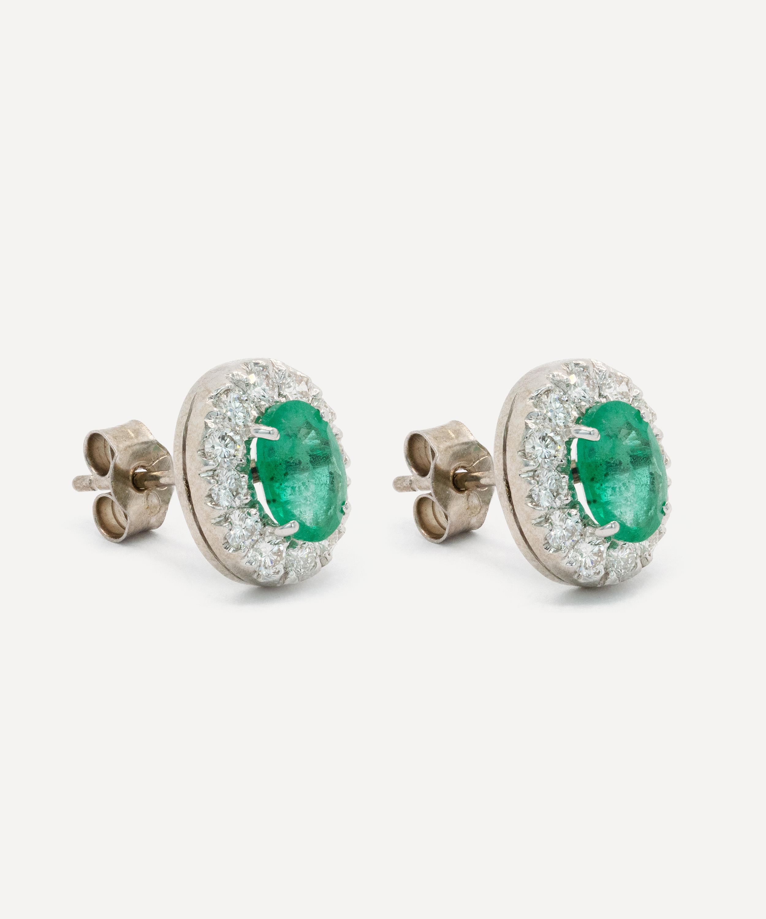 Add a touch of glamour and sophistication to any occasion with this modern pair of stud earrings from antique purveyor Kojis. Crafted from solid 18ct white gold, each earring features an oval cut emerald surrounded by twelve round, brilliant cut diamonds arranged in an elegant halo cluster, enhancing the vibrant colour of the emerald.