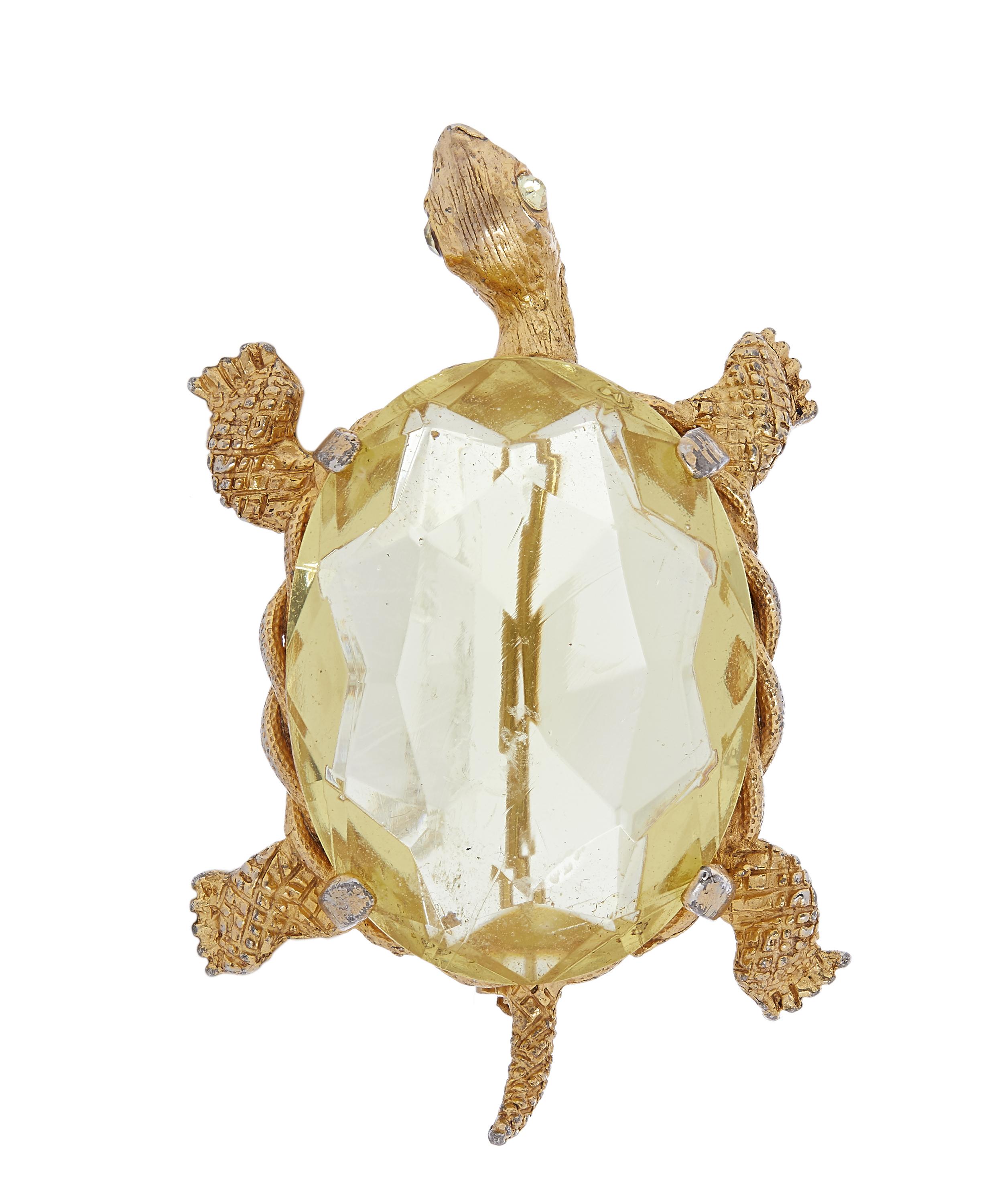 Crafted in the USA from polished gilt metal, this vintage Jeanne brooch showcases a sculptural turtle design that dates back to the late 1940s. A large, oval cut faux citrine forms the shell, while two smaller faux citrines embellish the eyes and finely textured detailing features across the body, bringing the design to life. Complete with a Jeanne authenticity plaque, this light-hearted piece is guaranteed to inject a lavish sense of glamour into your next special occasion look – the perfect addition to a maximalist jewellery curation.