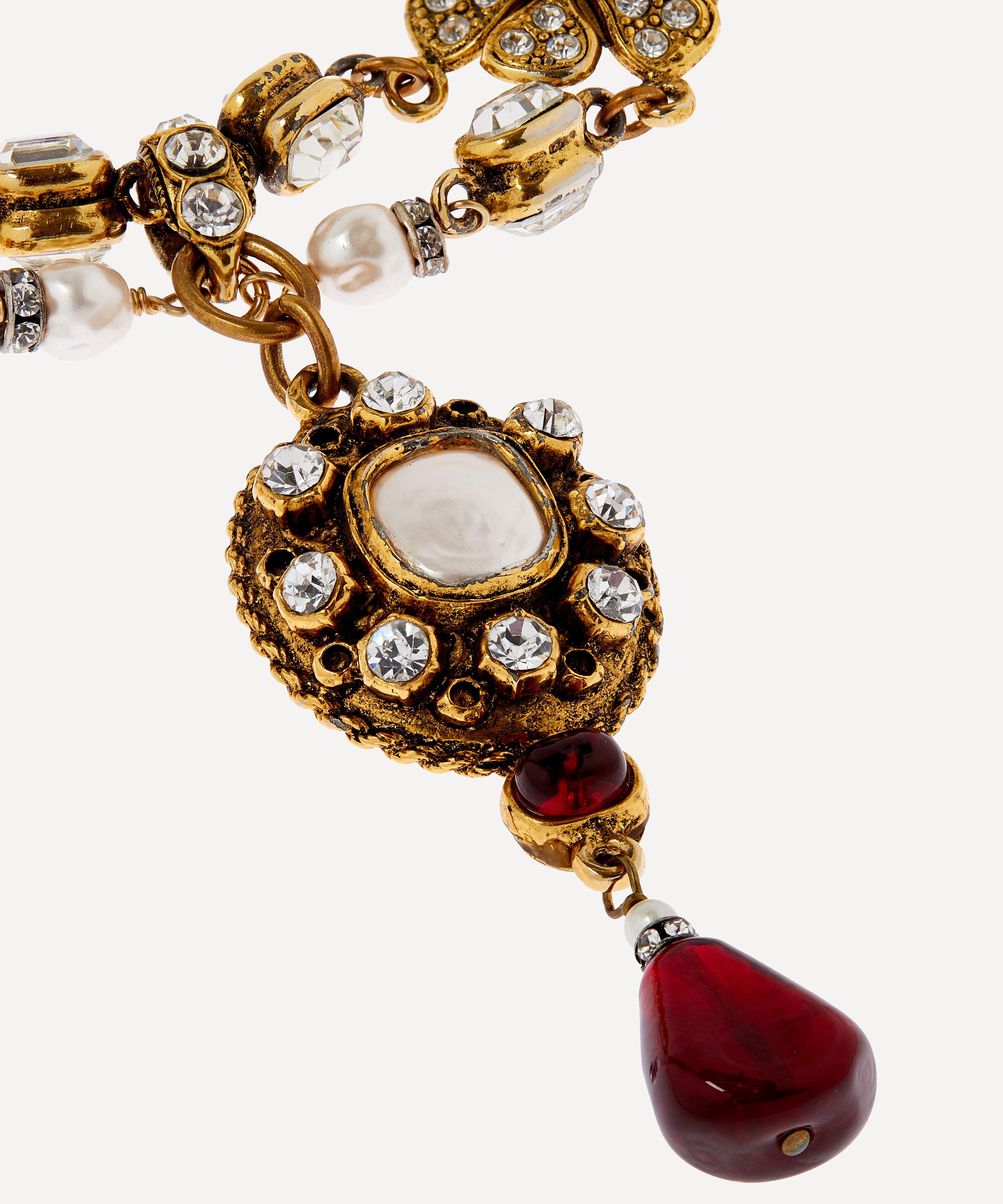 Boasting a true collector’s item, this sought after vintage necklace is a rare piece from Chanel, hand-soured by Dress Box. This stunning costume necklace has been hand-made in collaboration with Gripoix – a Parisian atelier known for creating jewellery out of glass. Characterised by a dual-stranded figure and cushioned oval gilt pendant, it’s adorned with faux pearls, faux round-cut diamonds, faux cabochon-cut rubies, and a faux ruby teardrop.