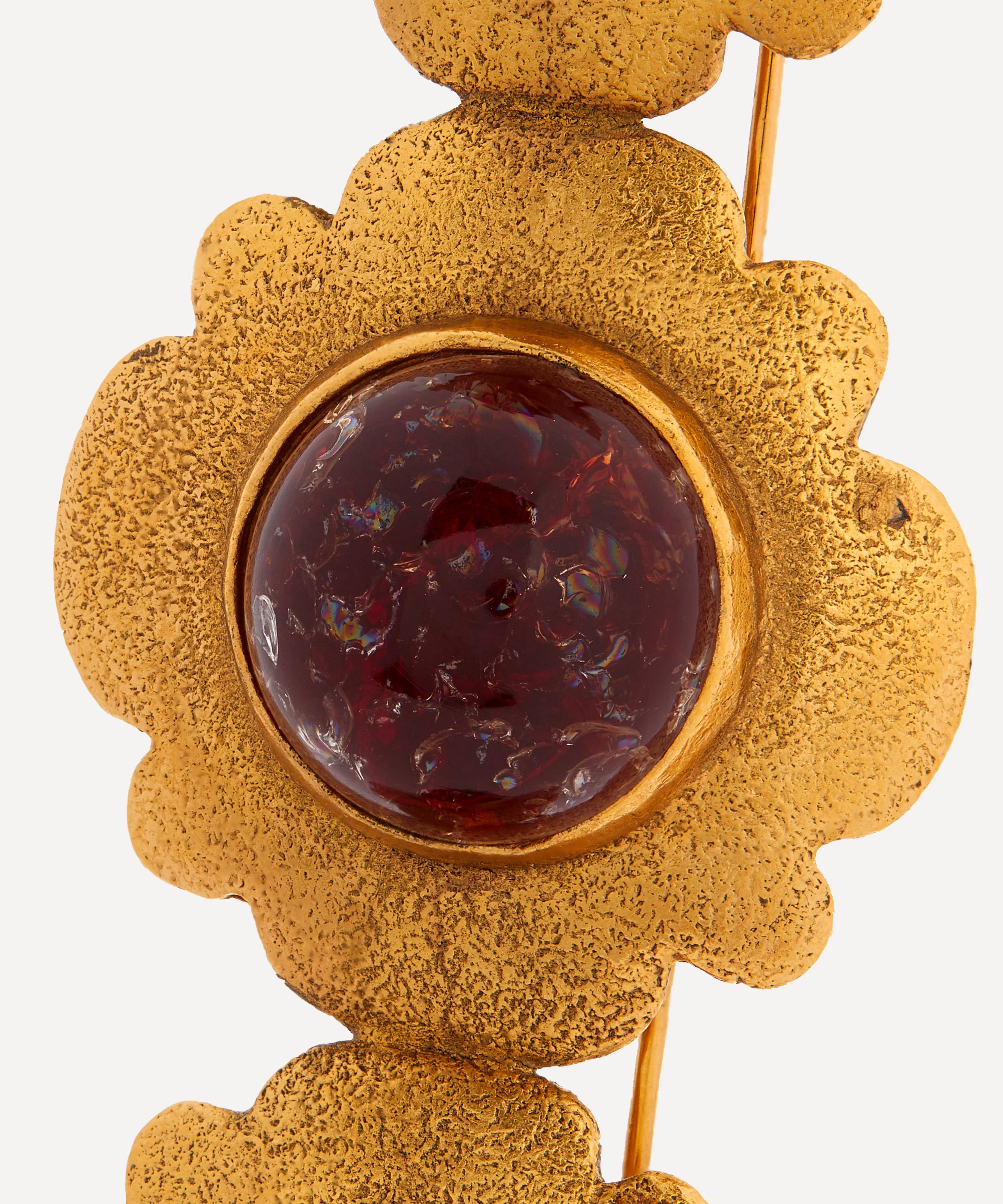 Boasting a true collector’s item, this sought after vintage brooch is a rare piece from Chanel, hand-soured by Dress Box. This costume brooch features a gently hammered gilt with dual-sized stylised camellias – a iconic symbol eponymous of the brand. Further characterised by cabochon-cut faux sapphire, ruby, and opal pistils, surrounded by stencil petals, it’s complete with a self-pin fastening – style it on the lapels of a blazer for a touch of vintage charm.