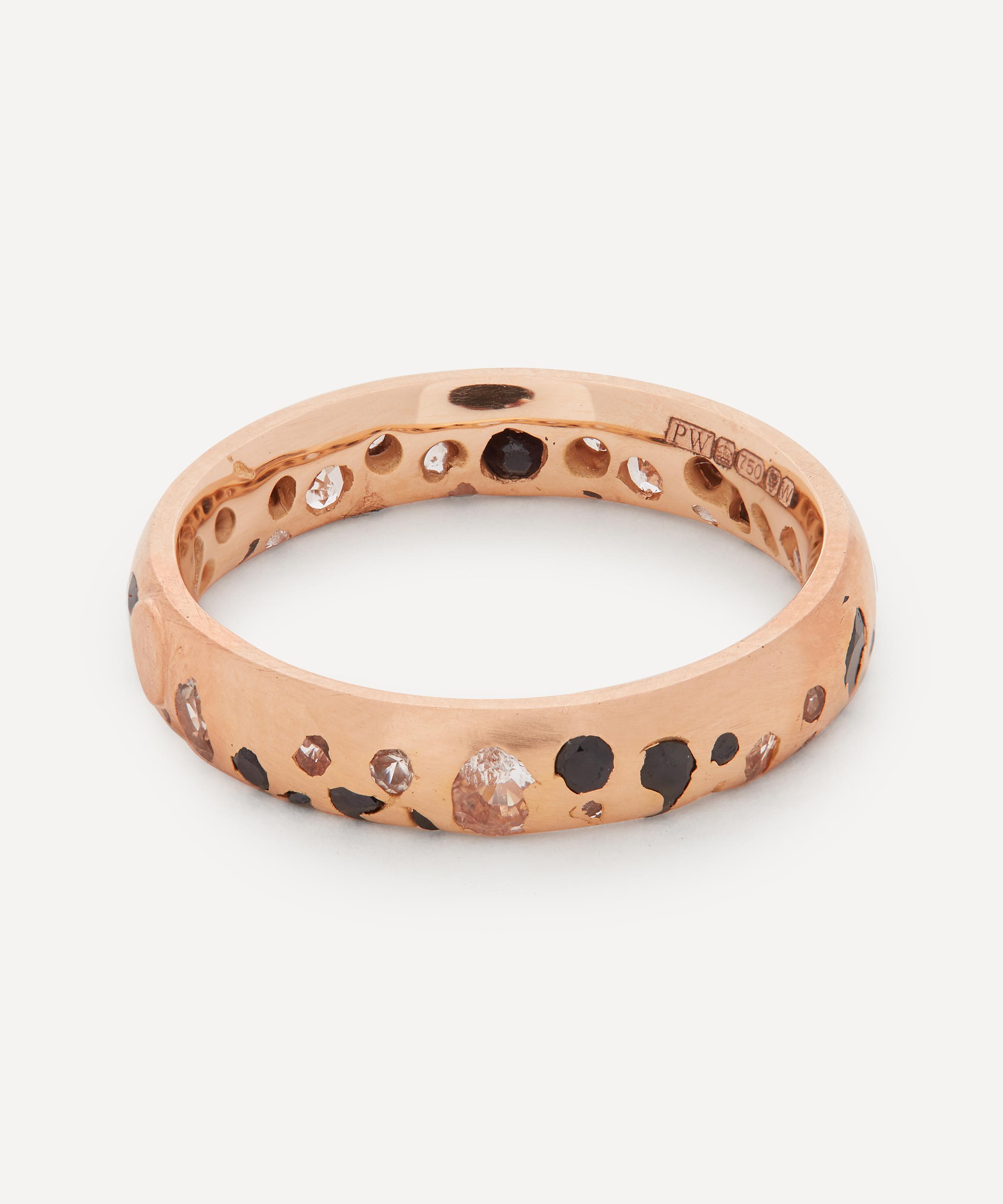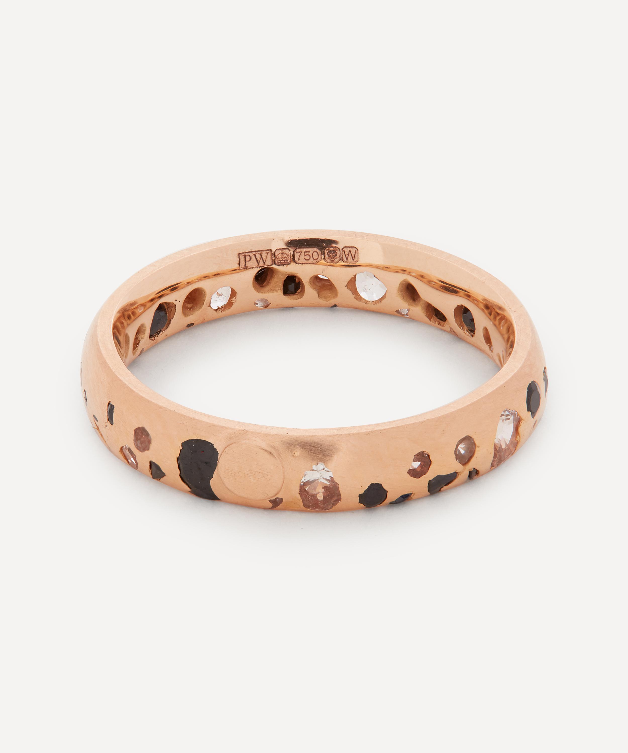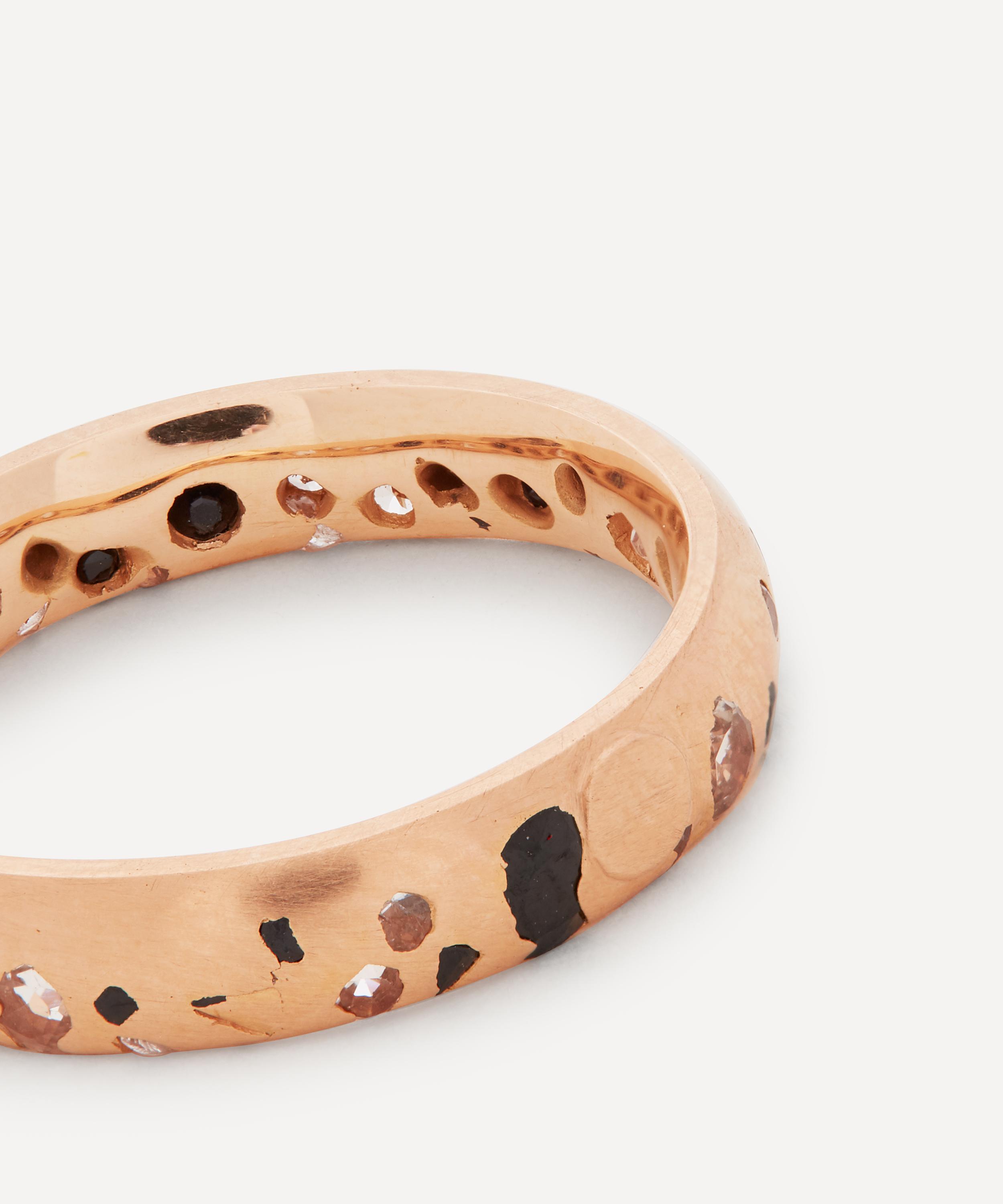 Crafted from solid 20 carat rose gold, this ring features a narrow band encrusted with a glittering assortment of mismatched black and white sapphires - all jumbled together like confetti. The designer's unconventional casting method means every piece is one of a kind - each stone is 'cast-not-set' into molten gold for a delightfully unpredictable, organic finish. Try stacking several contrasting Confetti rings together for a kaleidoscopic evening curation.