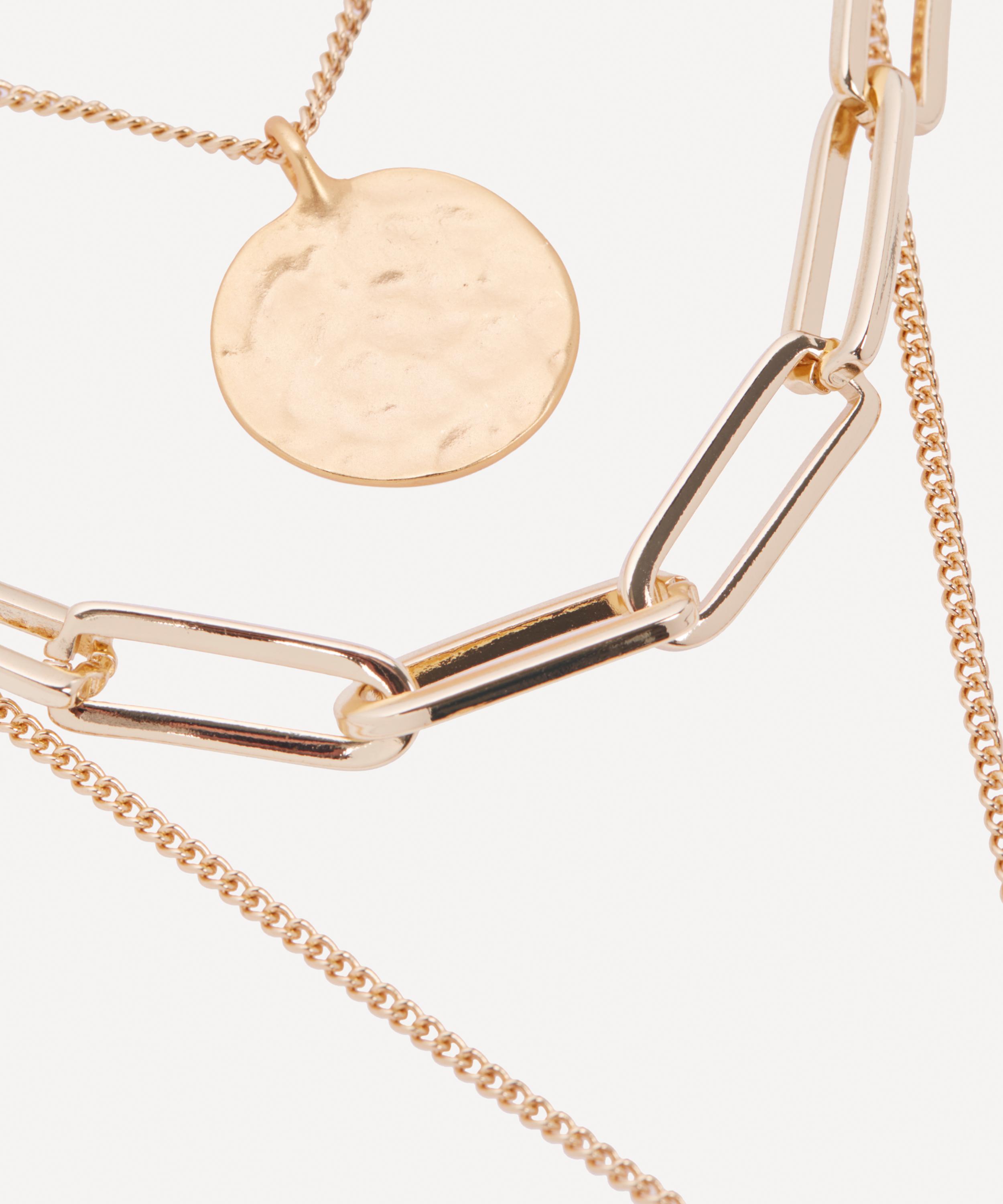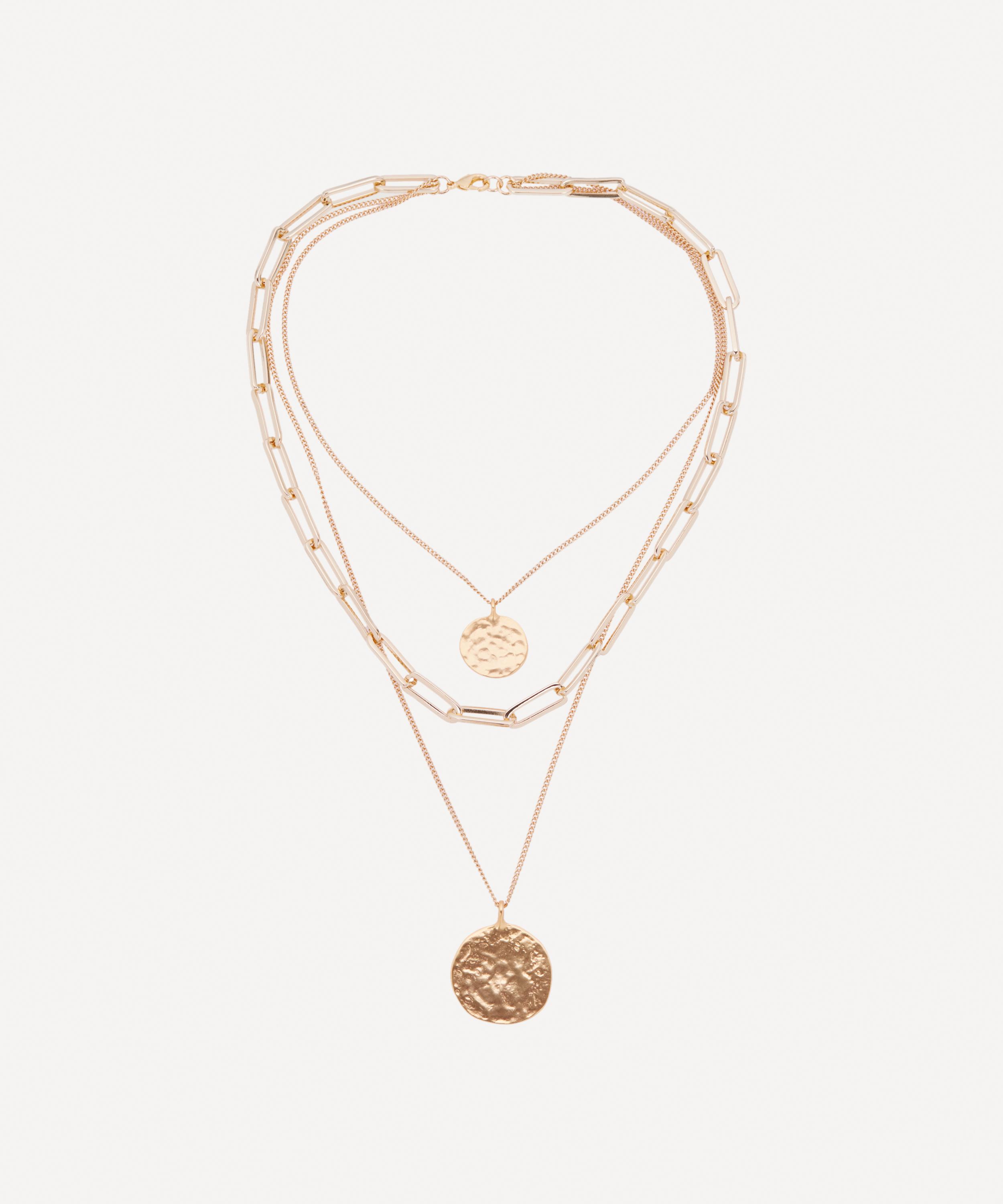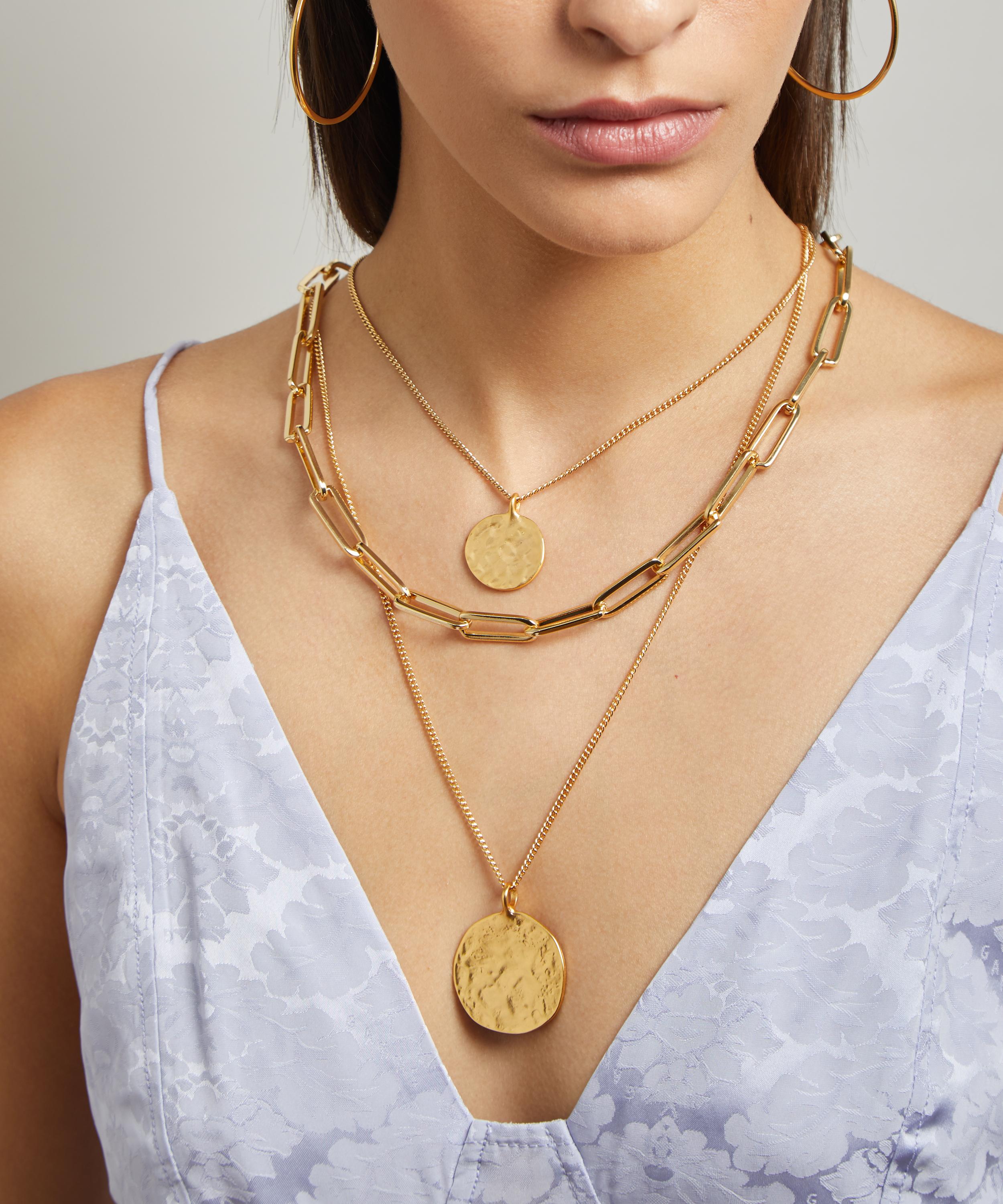 Exemplifying the extravagant opulence and effortless elegance that have defined the label for almost 60 years, this necklace is characterised by contrasting chains in a 3-row layer. Adorned with two, gently hammered coin pendants, suspended from fine chains and paired with a contemporary paperclip chain, it offers an effortless, trend-led finish – perfect to elevate your everyday attire.