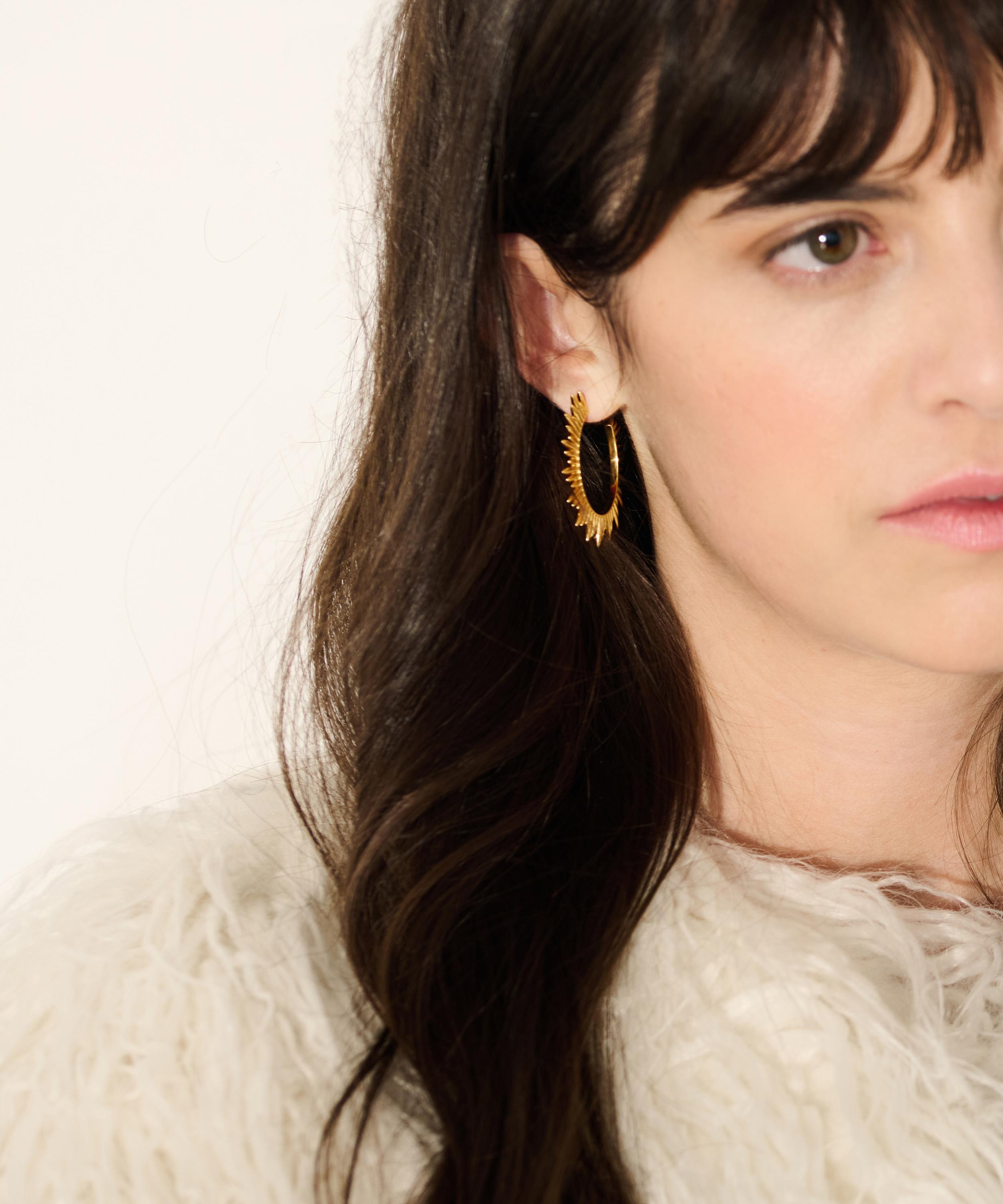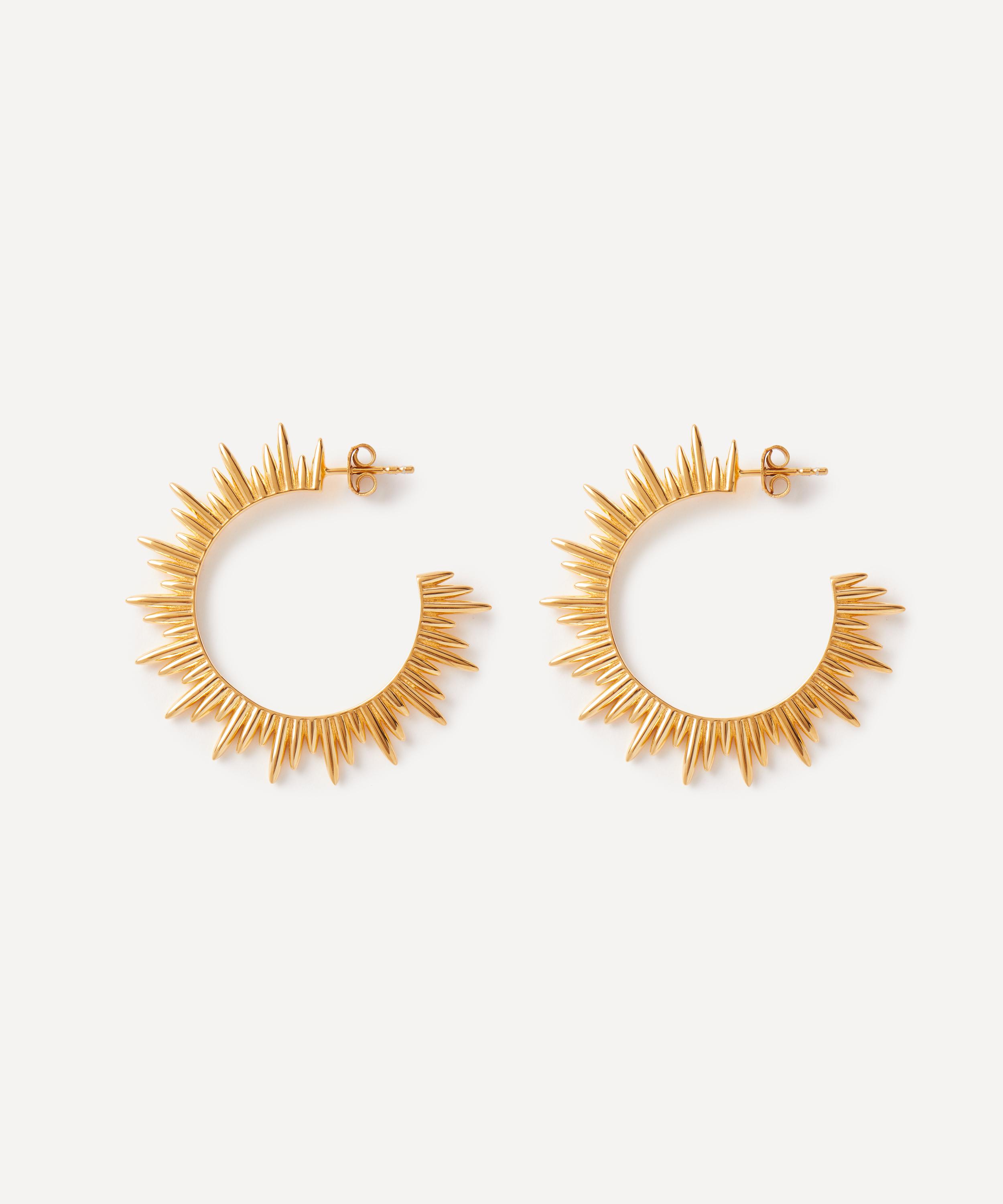 The Electric Goddess Statement hoop earrings are part of Rachel Jackson’s Electric Goddess collection – a mesmerising compilation of glowing, Art Deco-inspired sun motifs. Crafted from 22ct gold-plated silver, each earring features a half hoop silhouette with bursting sun detailing. Style it with the matching necklace and bracelet for a coordinated curation.