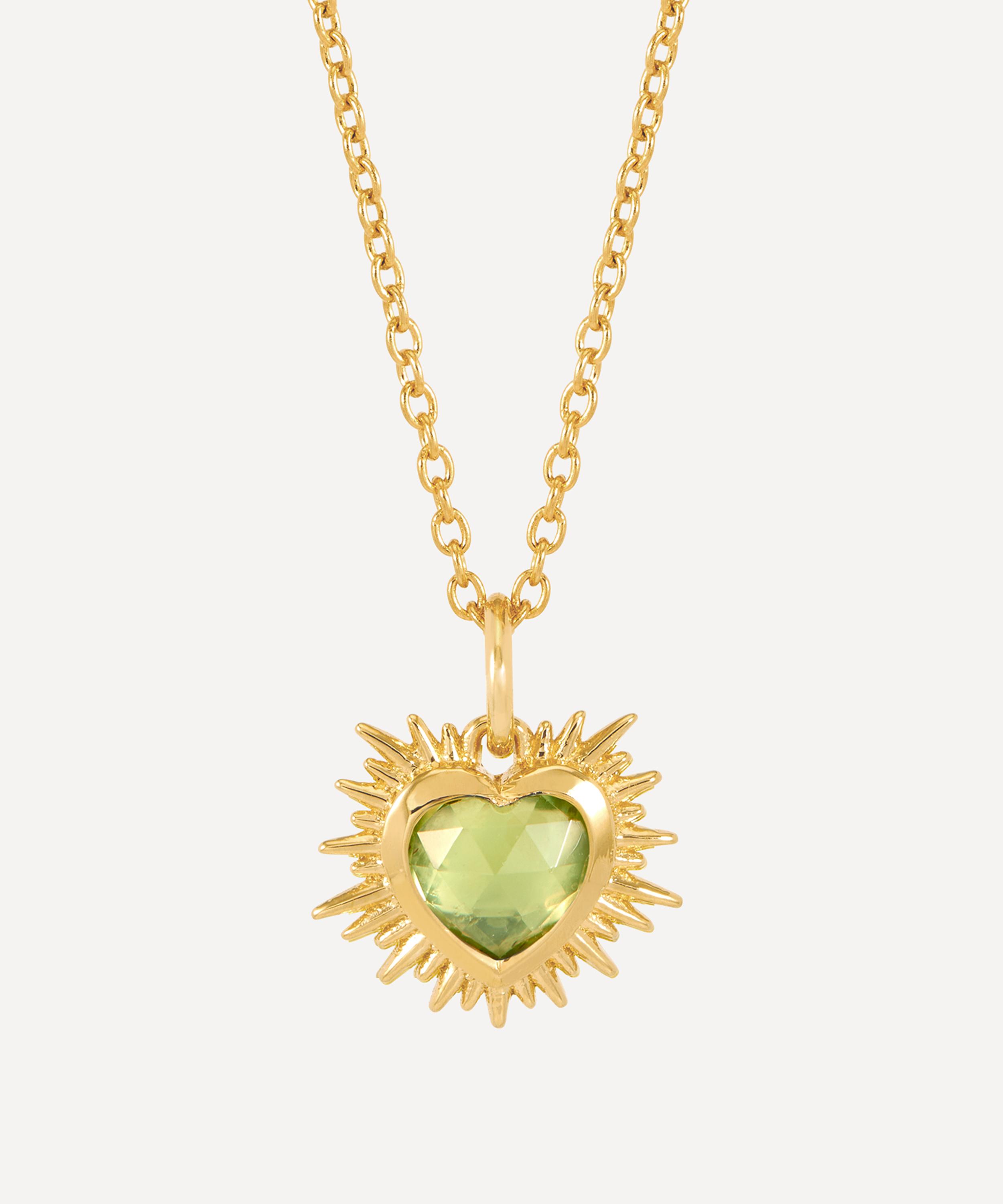 Crafted from 22ct gold-plated silver, it features a classic rolo chain and a bursting heart pendant adorned with the collection’s signature Art Deco rays and a hand-carved peridot – an August birthstone, thought to bring the wearer balance and clarity. Style it solo, or team it with other pieces from the brand for a head-turning edit.