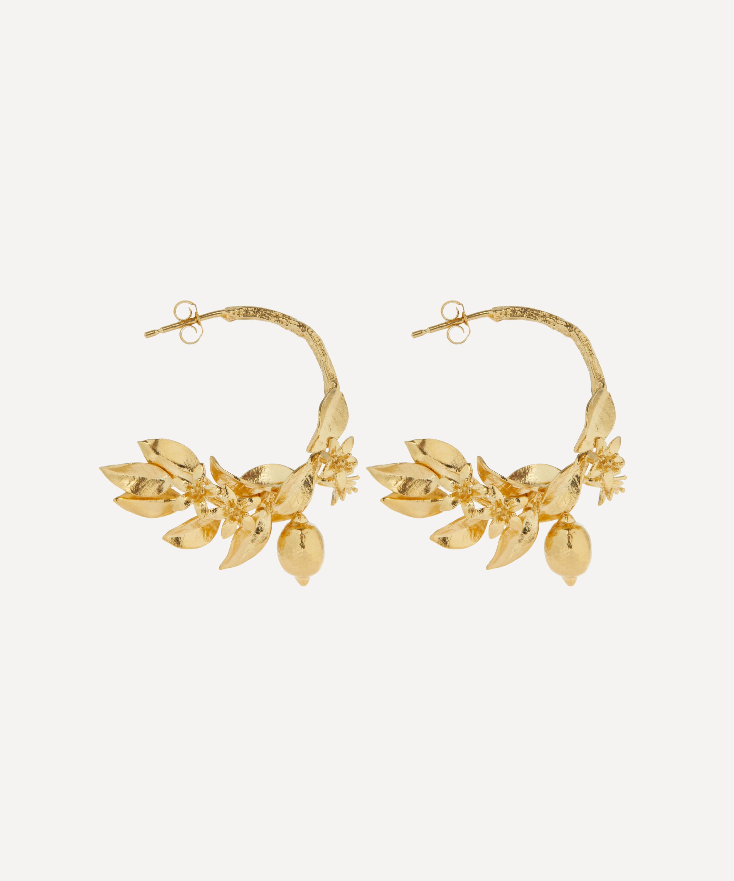 The Lemon Blossom Branch hoop earrings are part of Alex Monroe’s La Dolce Vita collection – a fun and fruity series that evoke carefree Mediterranean glamour and memories of never-ending summer days. Crafted in 22ct gold-plated silver, each earring is characterised by a textured hoop, reminiscent of a branch, adorned with sculpted blossoms, ripe lemons, and leaves. Style them alongside other pieces from the collection, or let them shine on their own.
