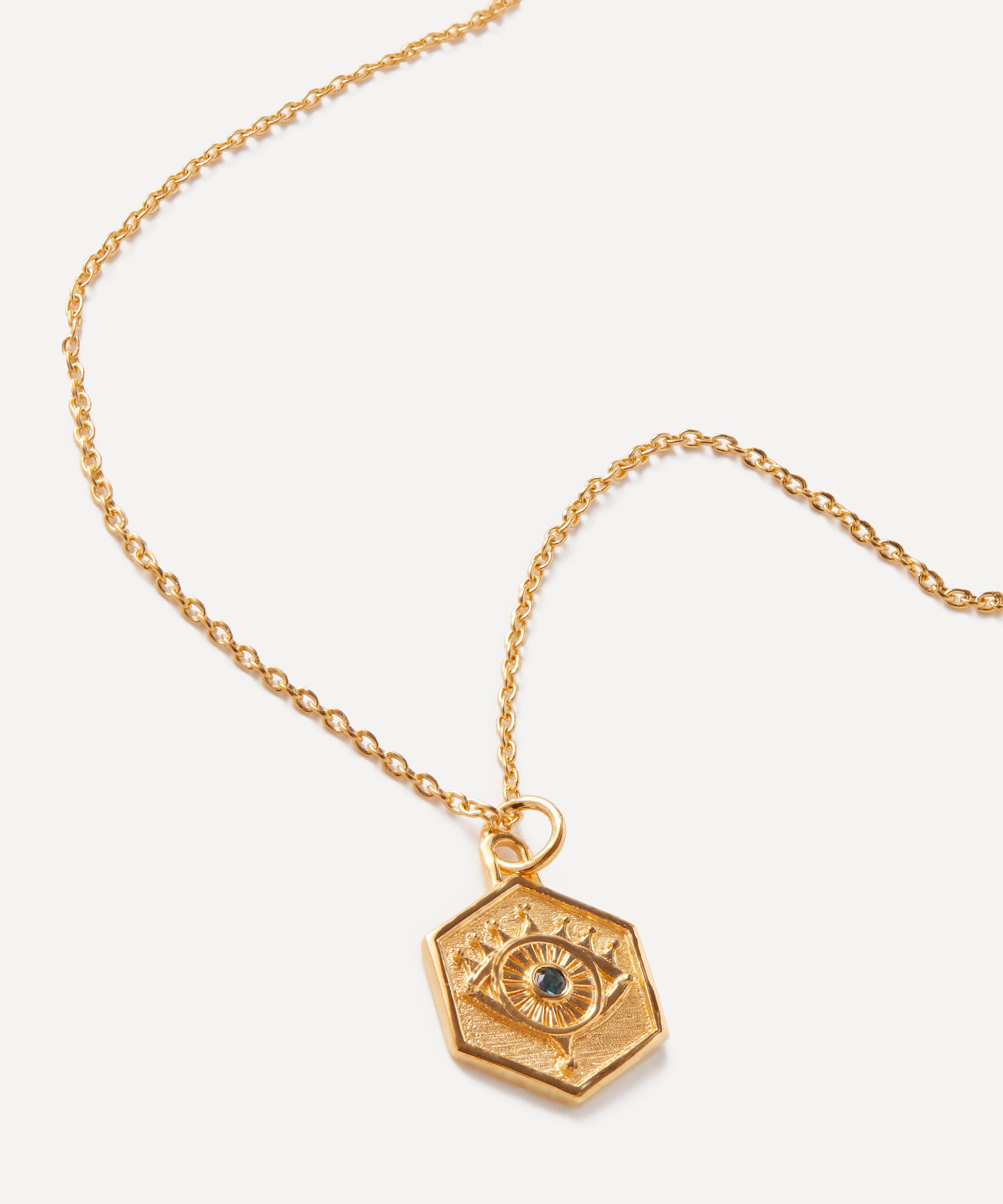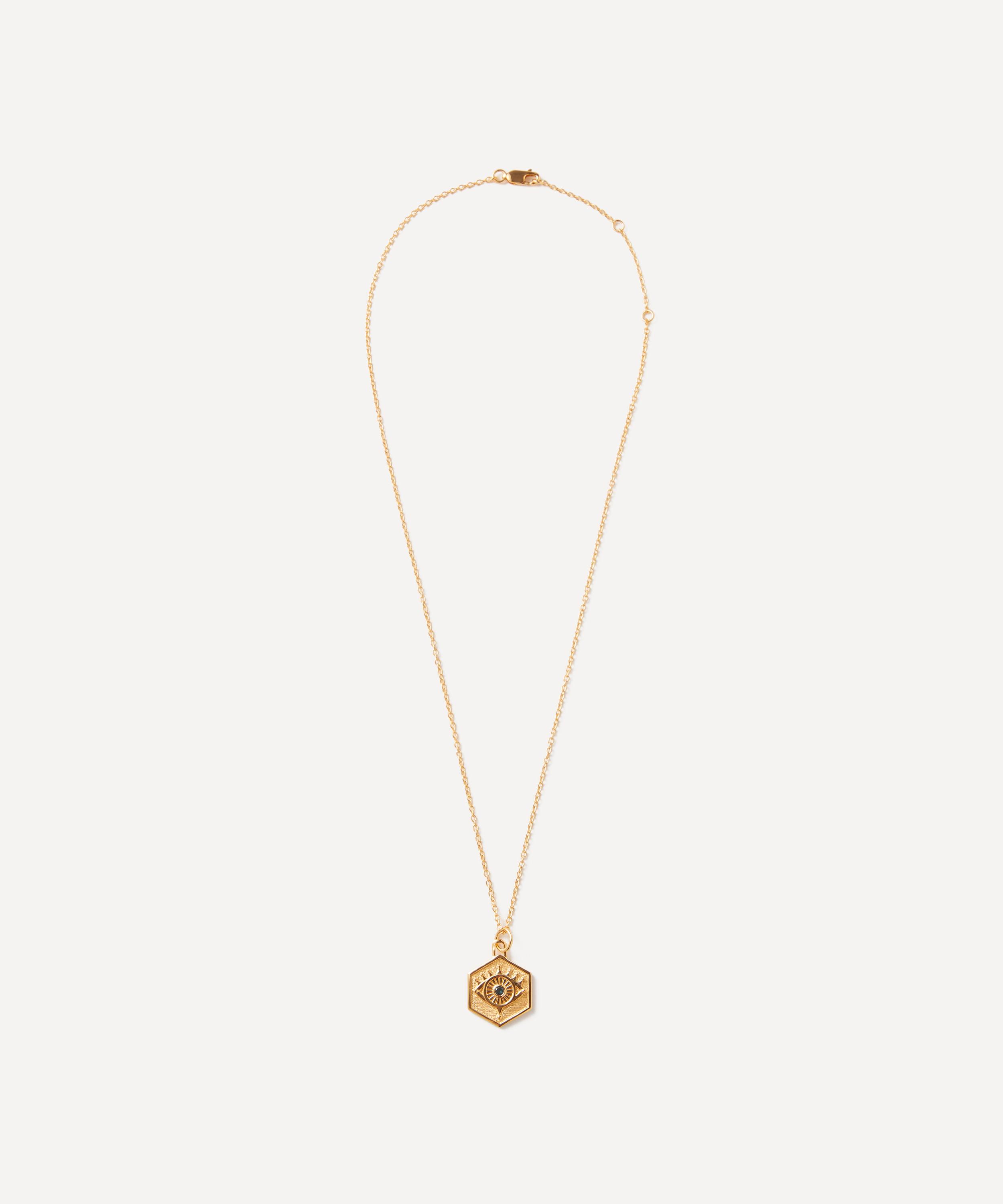 Elevate your ensemble and ward off negative energy with Rachel Jackson’s Protective Evil Eye pendant necklace. Crafted from 22ct gold-plated silver, it features a classic rolo chain and hexagon-shaped pendant adorned with a London blue topaz set evil eye motif – used for centuries as a protective amulet. Perfect for every day, style it solo or as part of a stack.