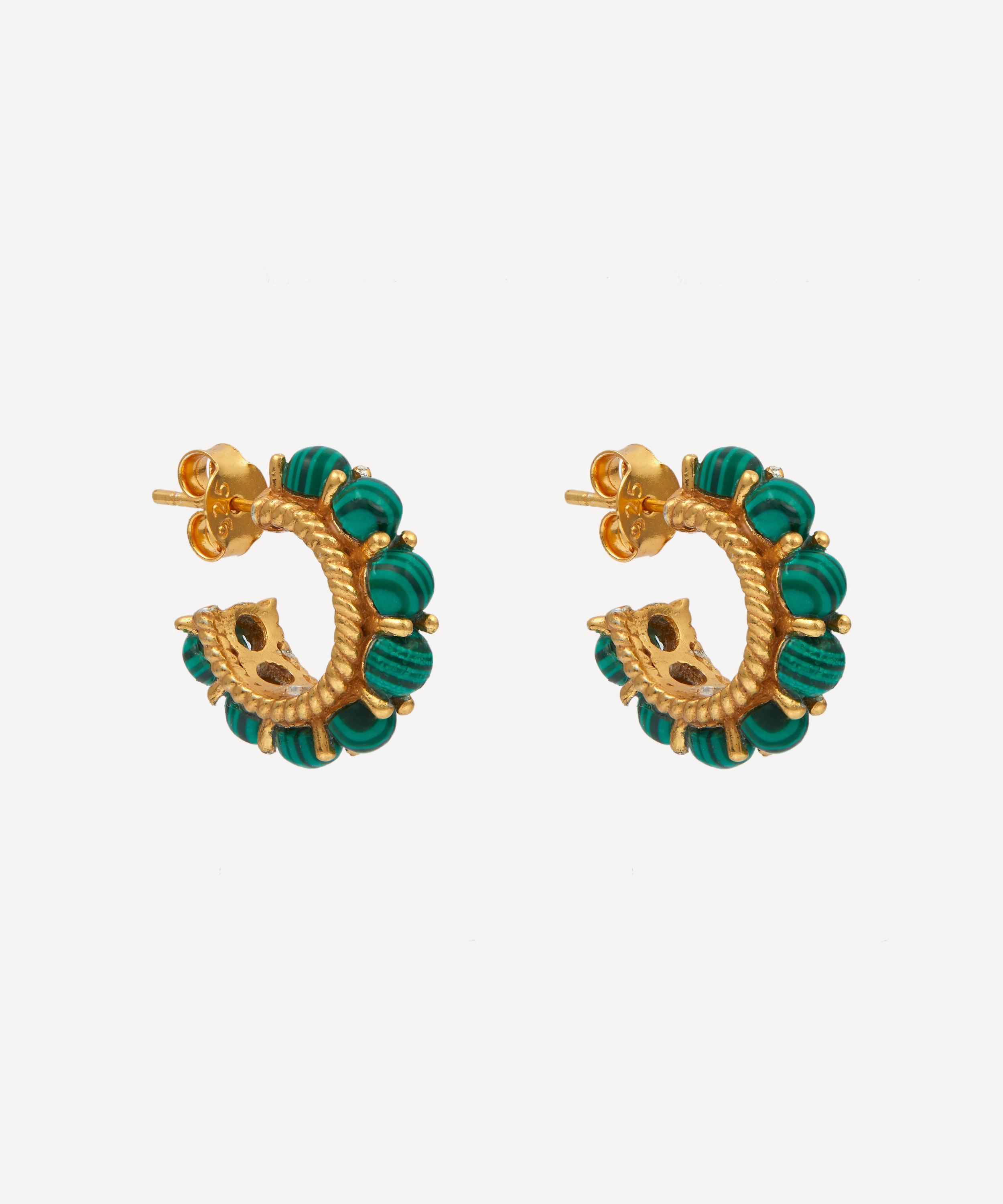 Crafted from 22 carat gold-plated sterling silver, each of these earrings feature an open hoop silhouette, elegantly formed of green malachite stones fitted in a four-prong setting with braided details at either side. Available in a range of colours, the contemporary design is perfect for day-to-night dressing - style them solo for an elevated everyday look, or wear them with a minimal chain necklace and an array of mismatched gold studs for an elegant evening-ready approach.