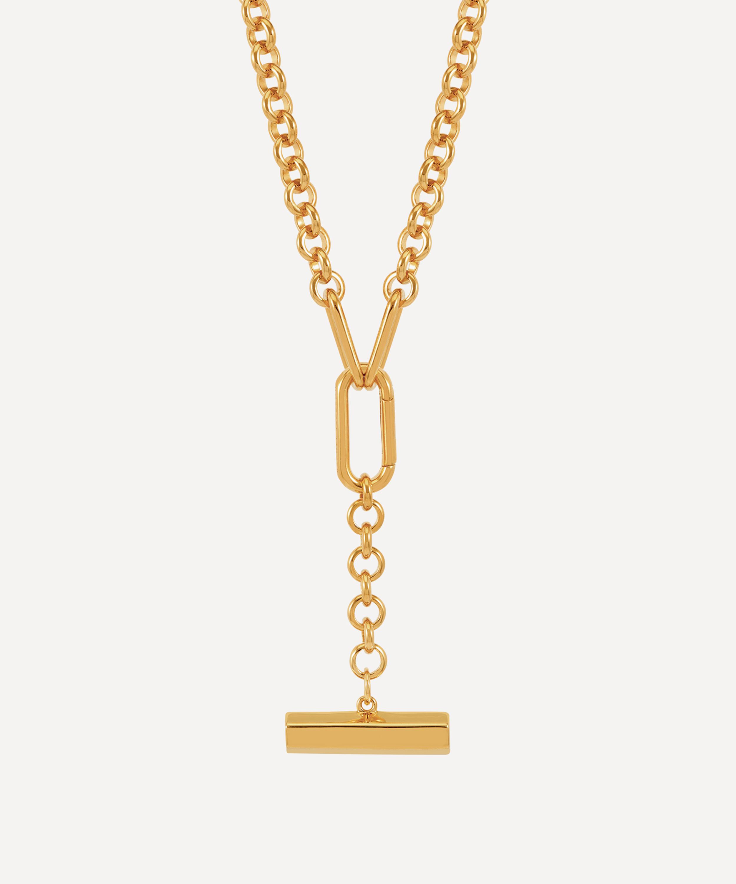 Crafted from 22ct gold-plated silver, it features a chunky rolo chain adorned with a hexagon-shaped T-bar drop and stylised hardware clasp. Offering a powerful statement look, style it with coordinating pieces from the collection for a cosmic curation out of this world.