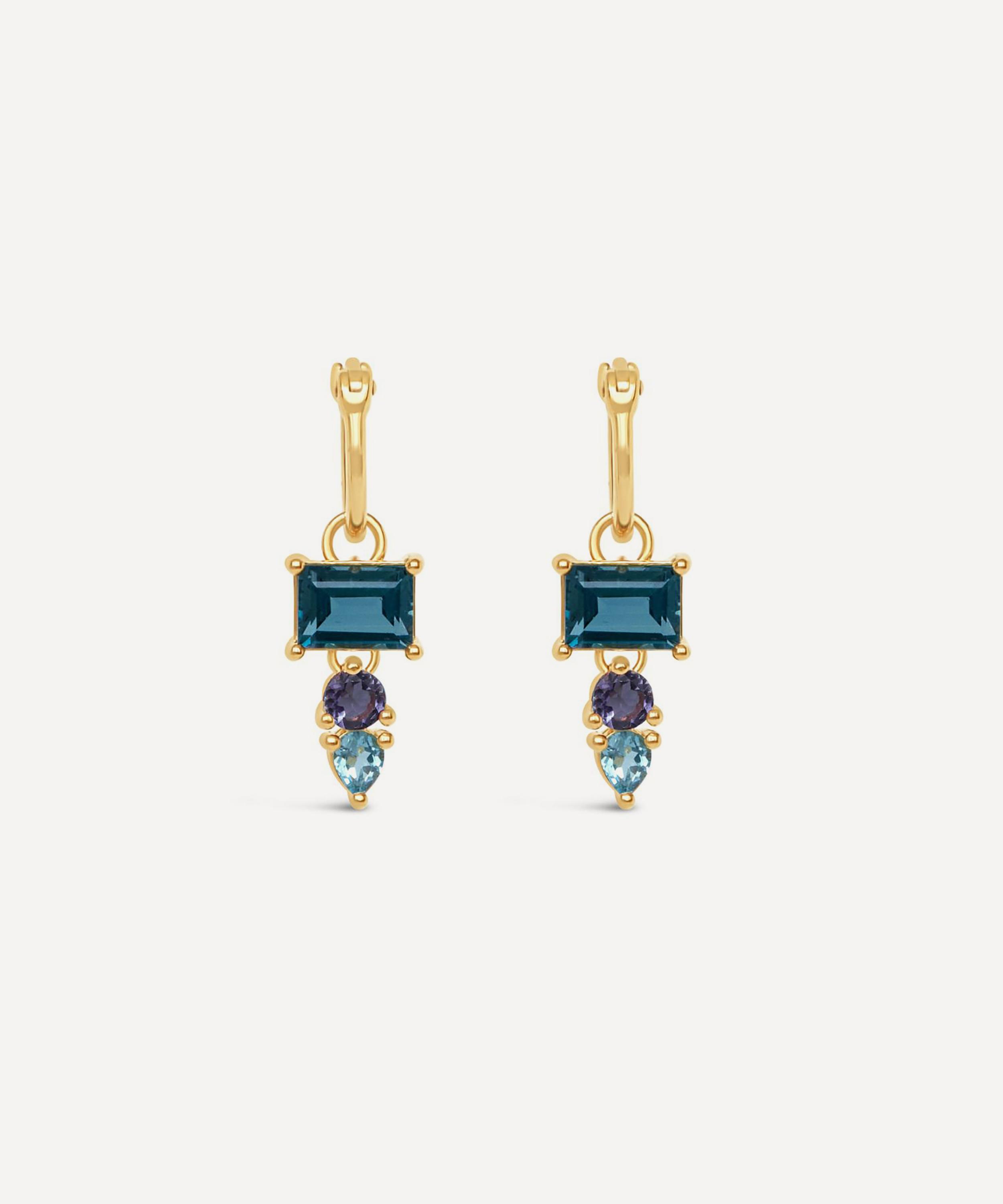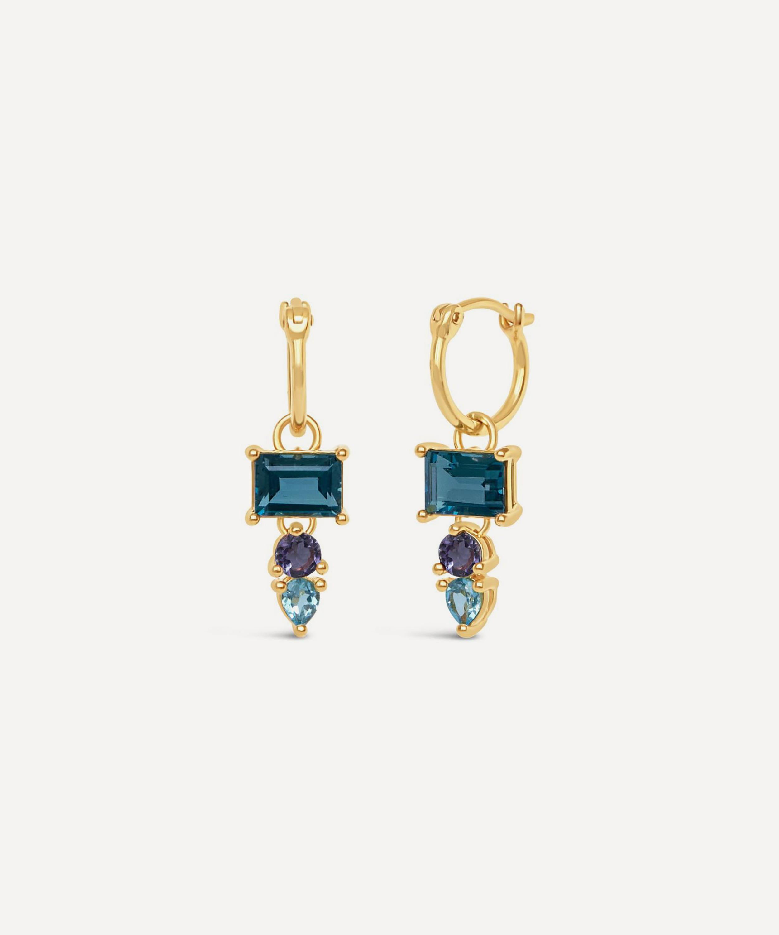 Infuse your look with the colourful decadence of these drop earrings from Dinny Hall’s Gem-Set collection – a modern approach to Art Deco glamour. Crafted from sterling silver plated in 22ct gold vermeil, each earring features a small, polished hoop set with a contrasting trio of gemstones, composed of an emerald cut London blue topaz, a round cut iolite and a pear cut Swiss blue topaz. Style solo, or layer with other earrings to create a unique stack.