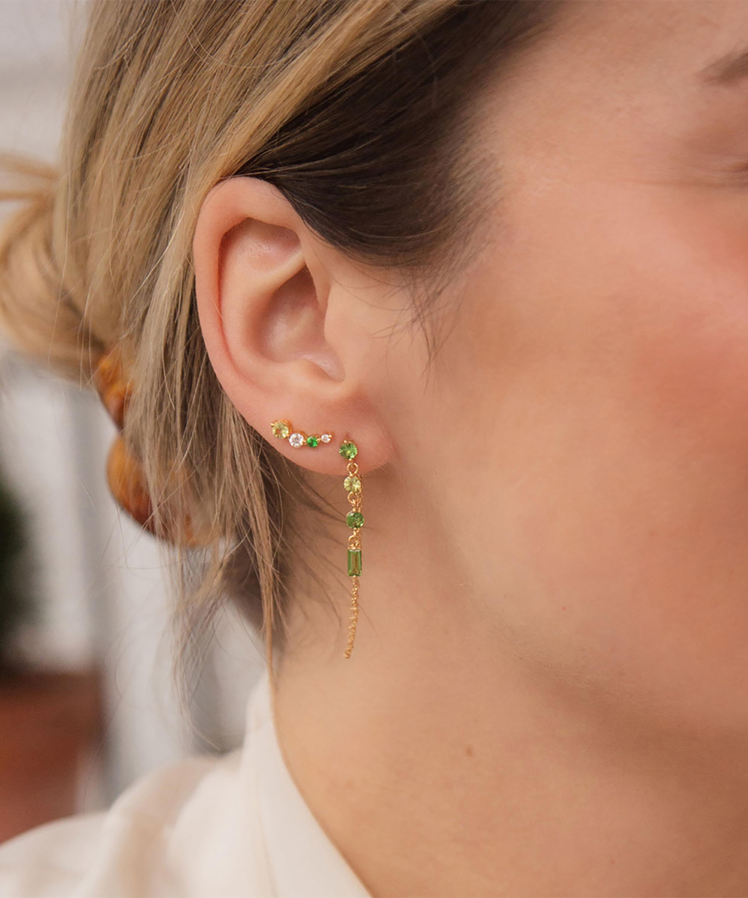 A play on the rhyme 'sugar and spice and all things nice', every piece in Dinny Hall's Shuga collection is dusted with a sprinkling of precious diamonds, coloured gems, or lustrous pearls. Crafted from sterling silver plated in 22ct gold vermeil, these earrings feature a delicate chain drop adorned with a mix of peridot and tsavorite stones. Gift them to a loved one as a thoughtful keepsake or incorporate this pair into your own everyday stack for a dazzling pop of colour.