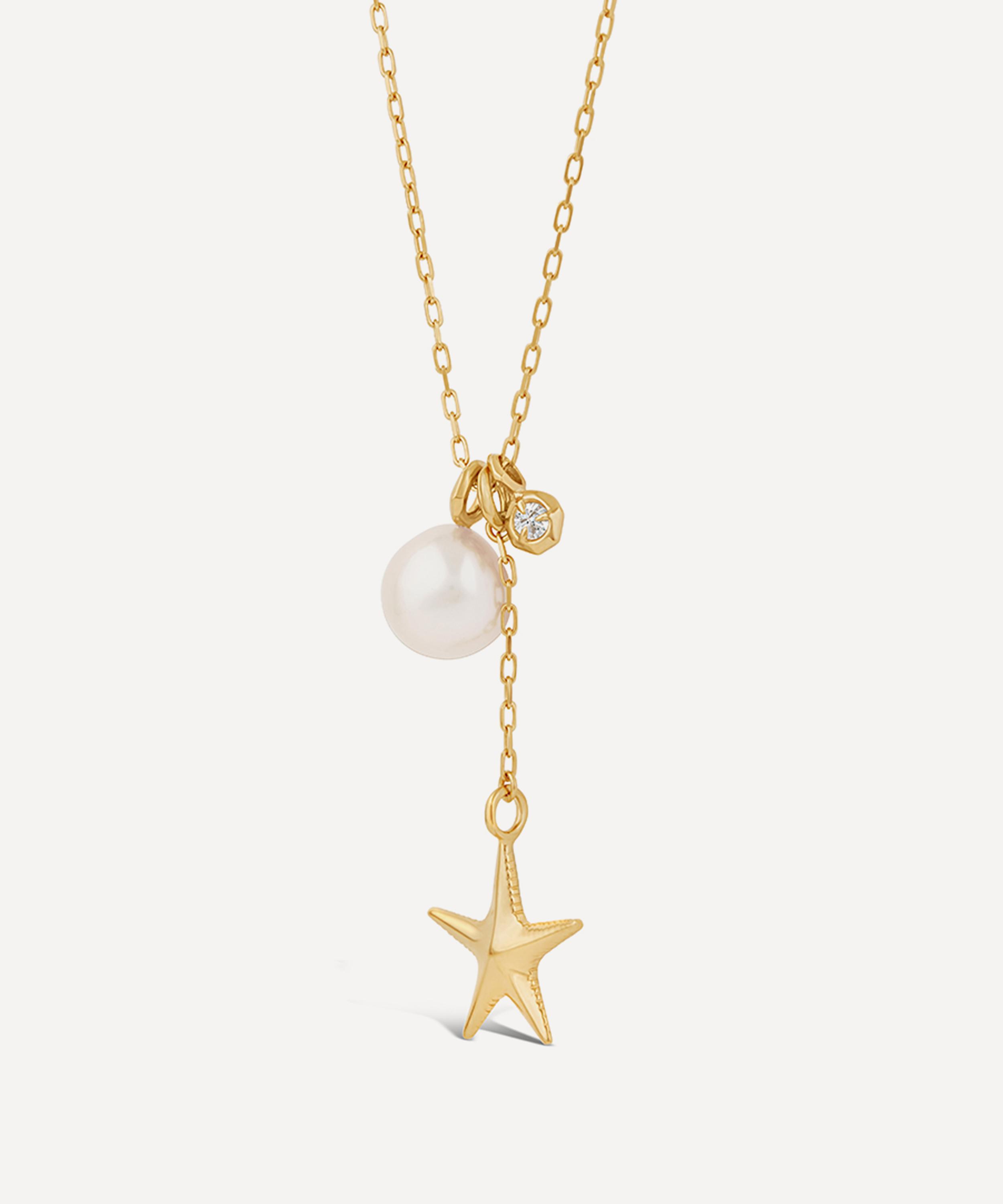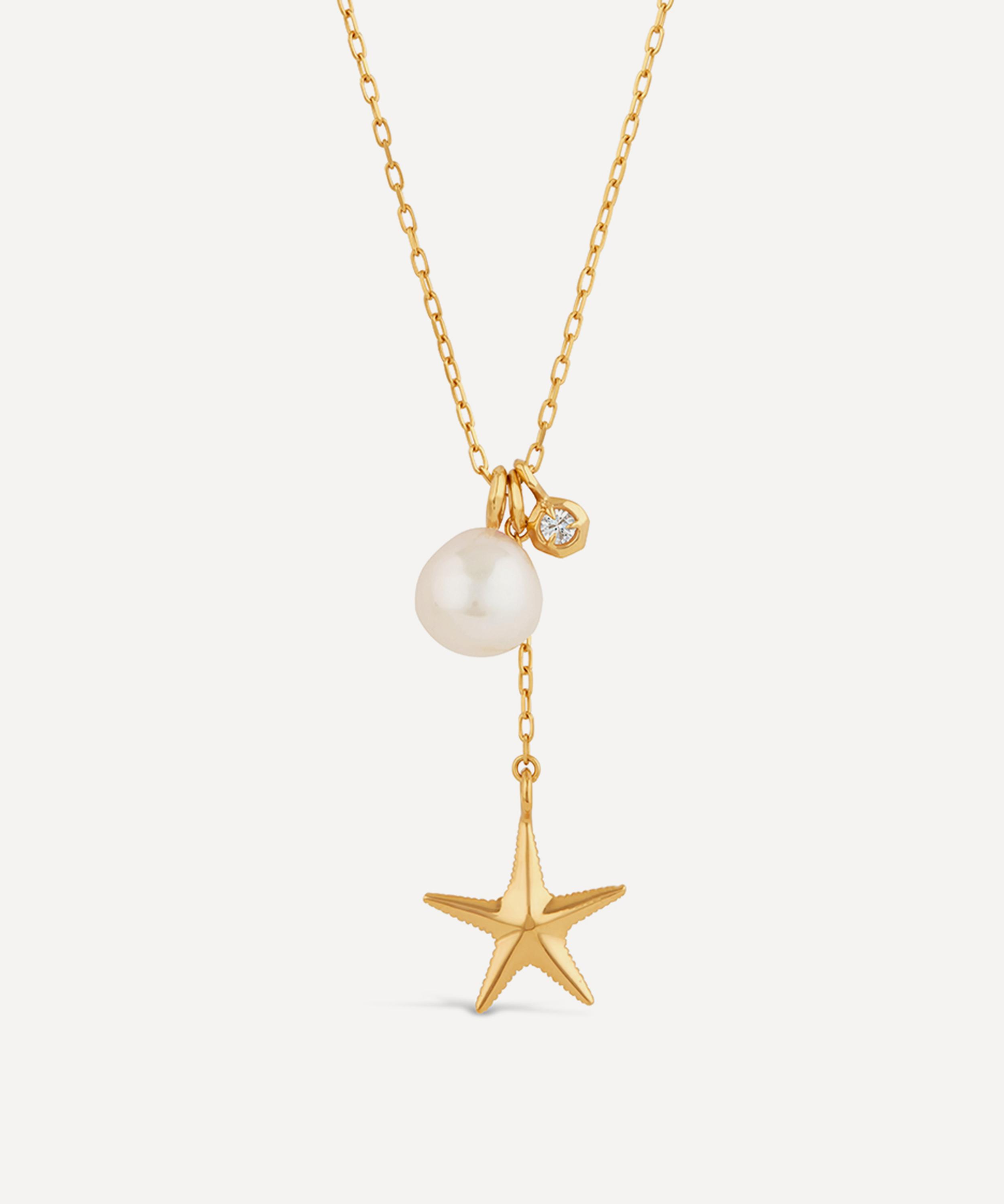 Inspired by Thalassa, goddess of the sea, this cluster pendant necklace from Dinny Hall celebrates the mystical depths of the sea – a collection of pieces expertly crafted to appear worn away by the passing tides. Hand-crafted from sterling silver plated in 22ct gold vermeil, this cluster features a lustrous freshwater baroque pearl, a white sapphire pendant in a faceted setting, and a chain-suspended starfish with textured detailing. Perfect for everyday wear, style it by itself or layer it with other necklaces from the collection.