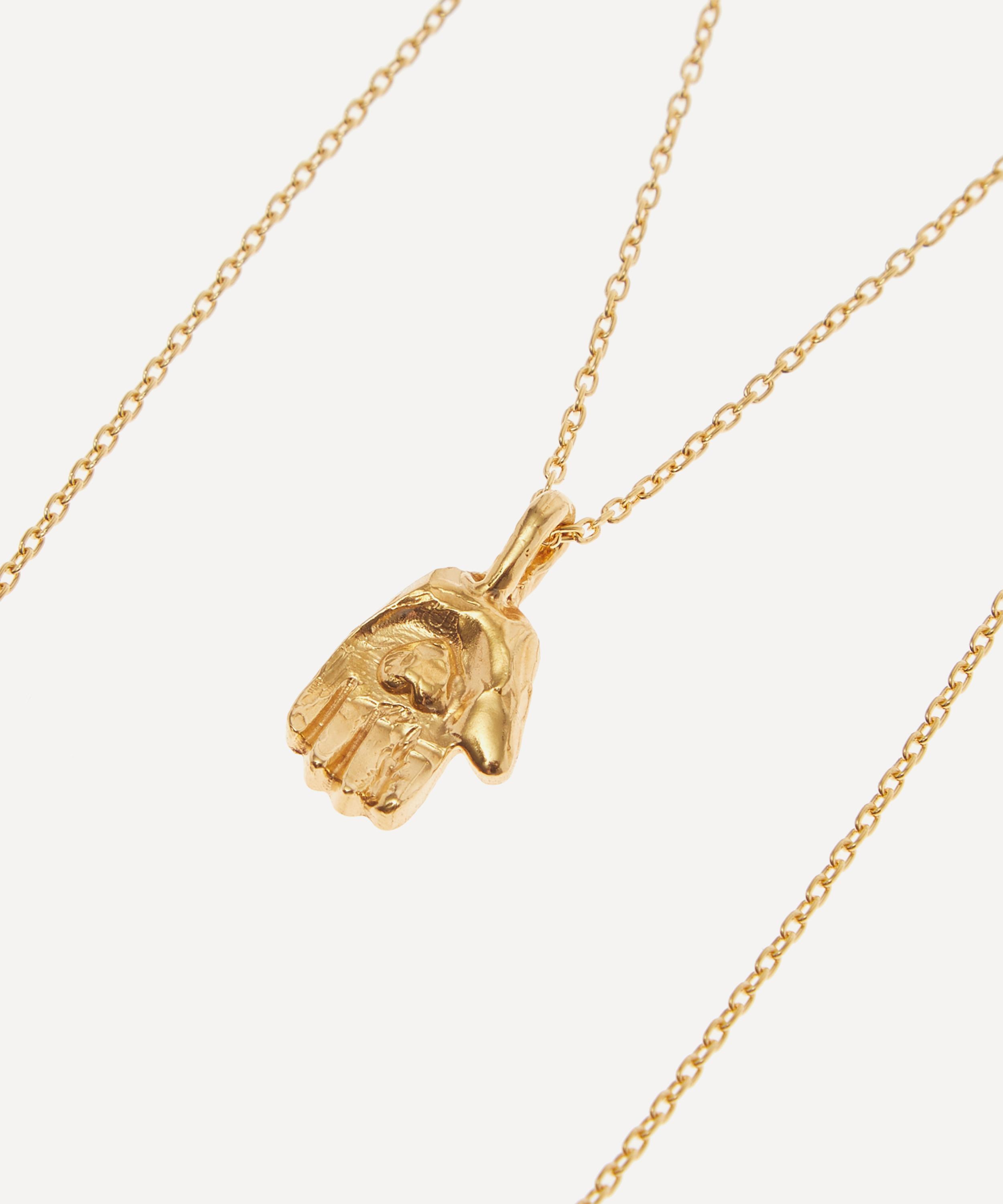 Drawing inspiration from love stories in which they unfold and change over time, this collection showcases a handful of spiritual designs that celebrate the beauty of human imperfection. Crafted from 24 carat gold-plated bronze, this necklace features a slightly battered amulet pendant in the shape of a hand, attached to a delicate and adjustable chain. Gift it to a loved one as a precious modern heirloom, or layer it with several other fragmented amulets from the collection for a talismanic evening look.