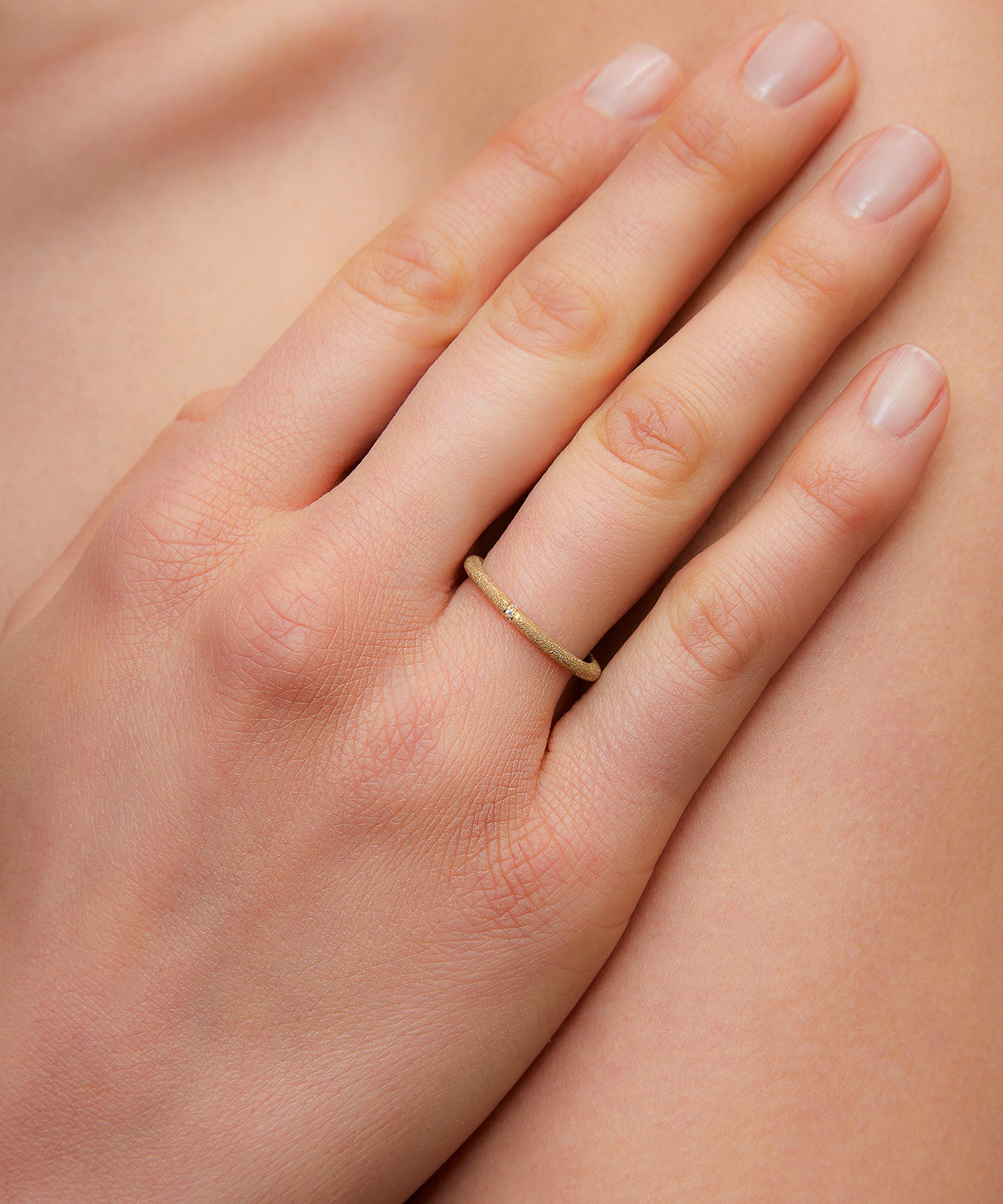 Delve into a world of vintage classics and tie your whole look together with this stacking ring from Yvonne Léon. Crafted from 9ct gold, the designer beautifully unites vintage charm with a modern reinvention in this piece – featuring a textured band embellished with three, tiny diamonds at the centre. Style solo for subtle, minimal elegance, or incorporate it into a ring stack for a more contemporary look.