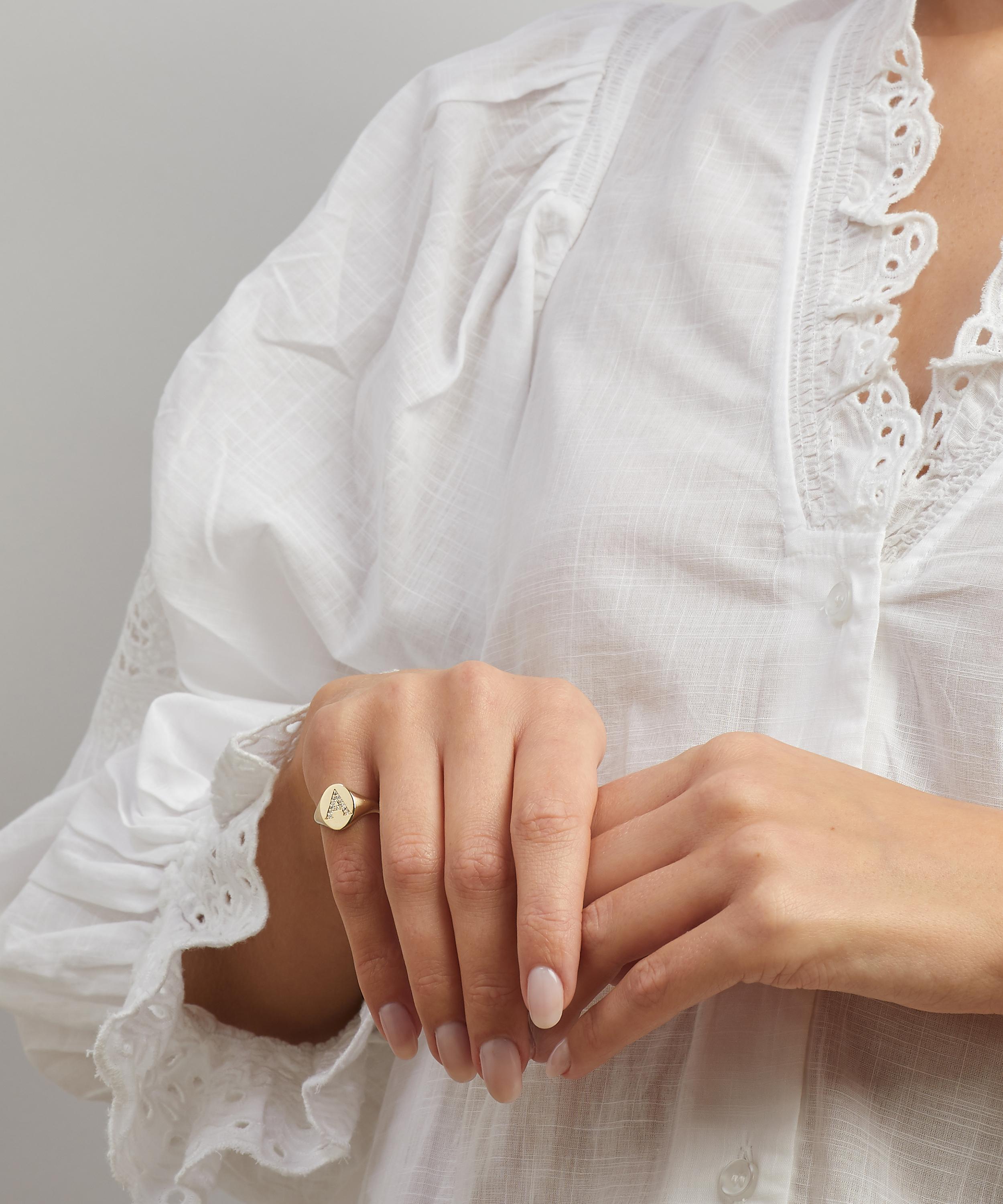 The signet ring is customisable with a single letter initial formed from shimmering lab-grown diamonds, in a celebratory modern reimagining of our iconic emporium’s distinctive Arts and Crafts typography. Engraved on the inside with our branded Liberty logo, each signet ring is small batch crafted by hand in Italy – a modern heirloom that pays tribute to Liberty’s collector spirit.