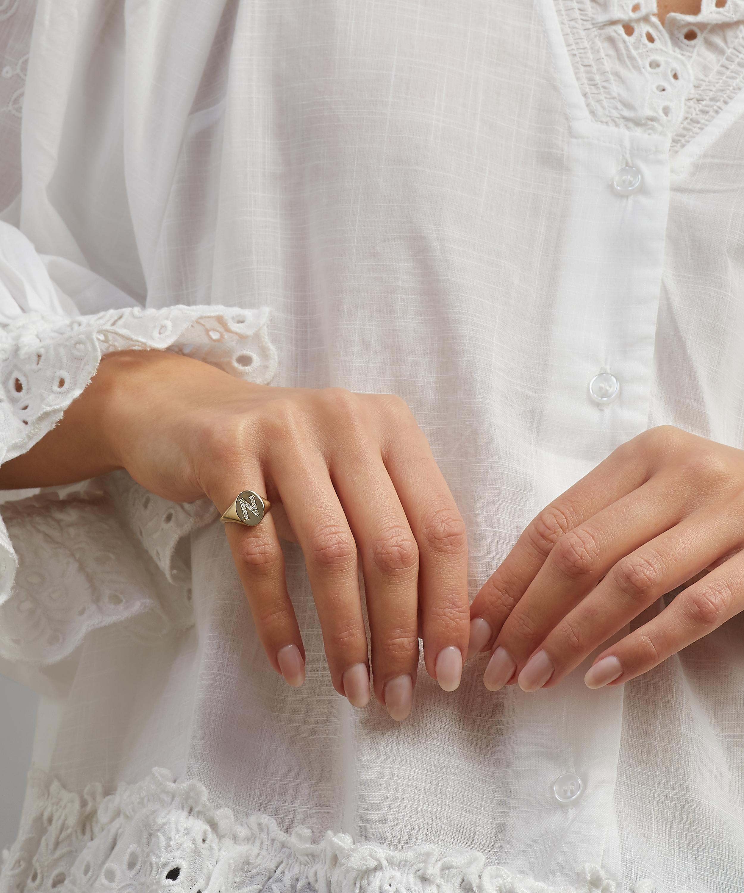 The signet ring is customisable with a single letter initial formed from shimmering lab-grown diamonds, in a celebratory modern reimagining of our iconic emporium’s distinctive Arts and Crafts typography. Engraved on the inside with our branded Liberty logo, each signet ring is small batch crafted by hand in Italy – a modern heirloom that pays tribute to Liberty’s collector spirit.