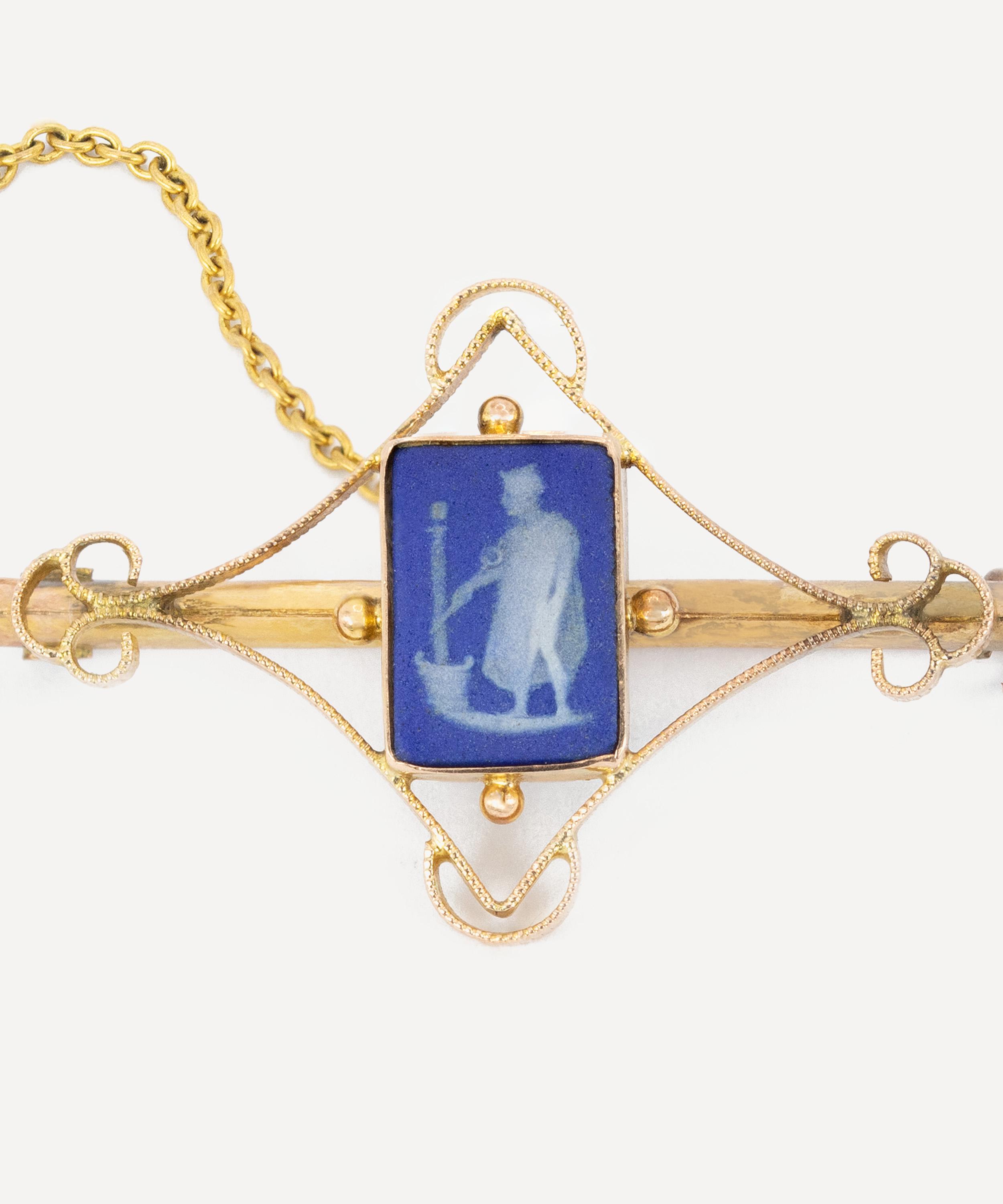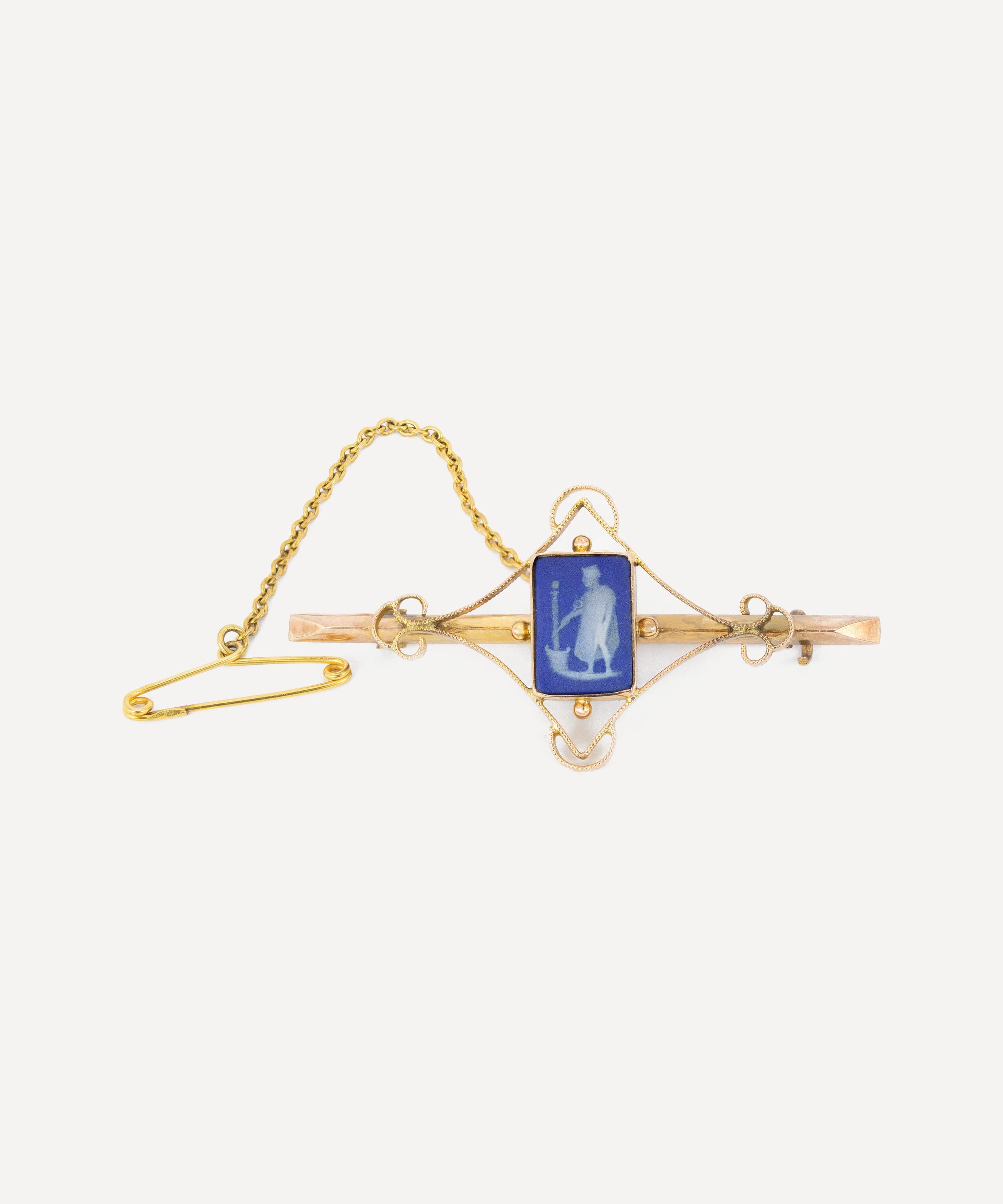 Brimming with character, this antique brooch from Kojis is a one-of-a-kind statement piece. Crafted from 9ct gold, it features a blue jasperware Wedgwood, depicting a figure dressed in robes. The ceramic is surrounded by diamond-shaped gold work with a milgraine finish on top of a gold bar. Wear it alone or team it with several other artisanal brooches and pins for a maximalist take on traditional formalwear.