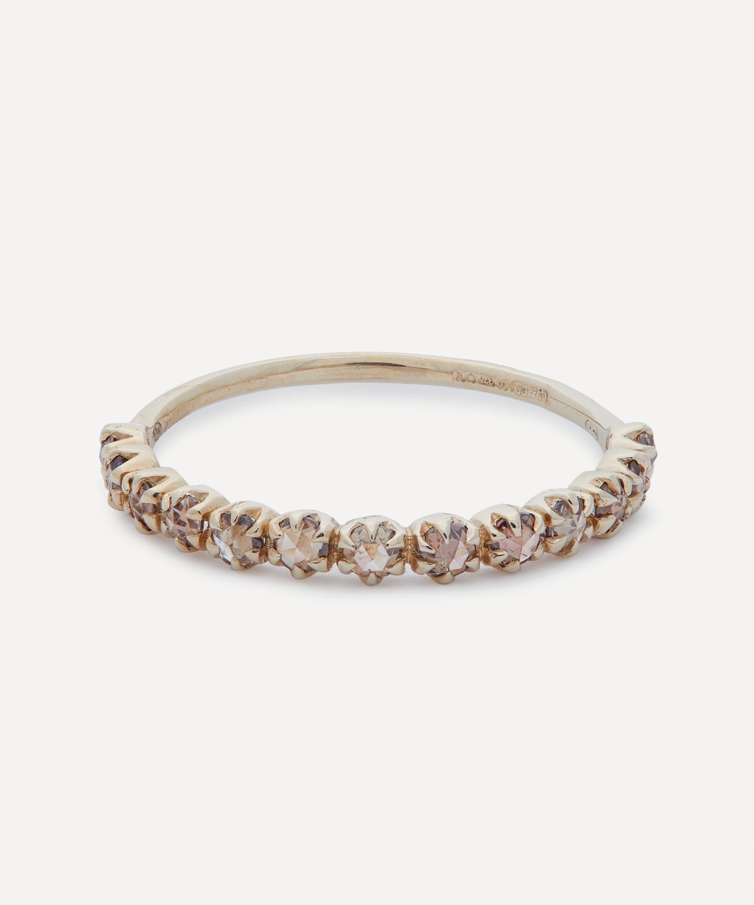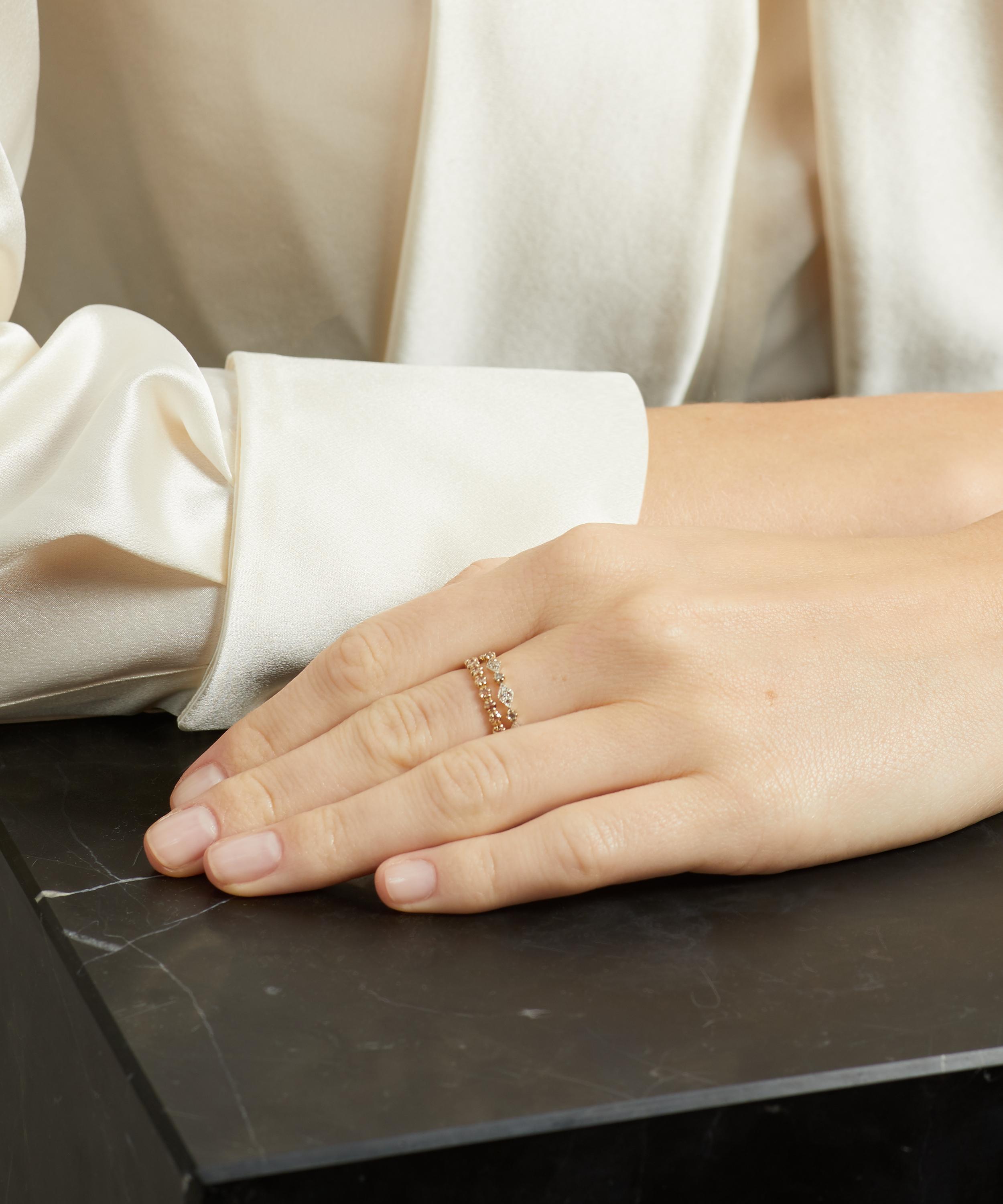 Pascale Monvoisin’s Ava No 2 diamond eternity ring beautifully illustrates the French designer’s signature fusion of precious, natural and perfectly ordinary materials. This ring features a welded band with sparkling diamonds encased in melted gold settings.