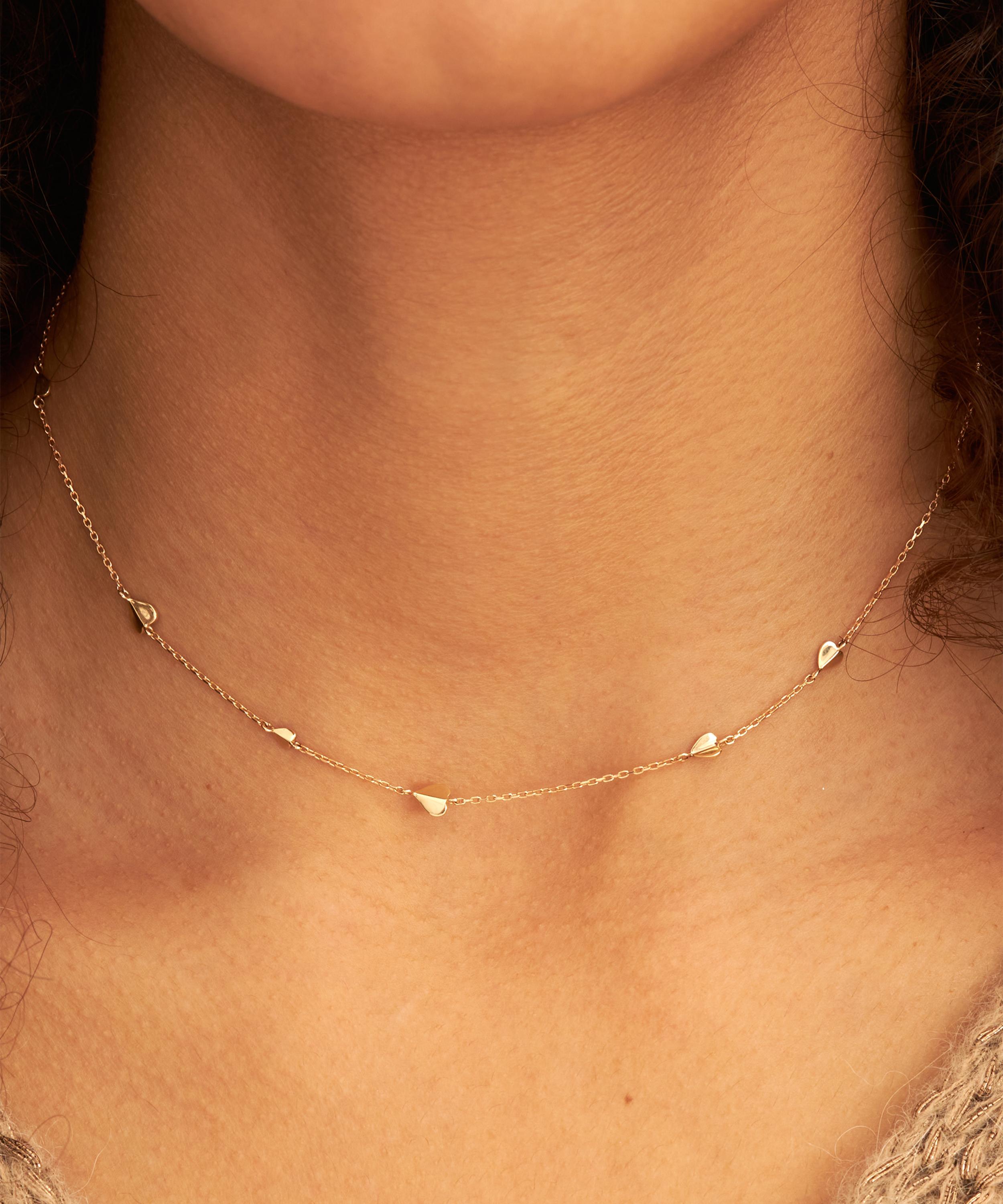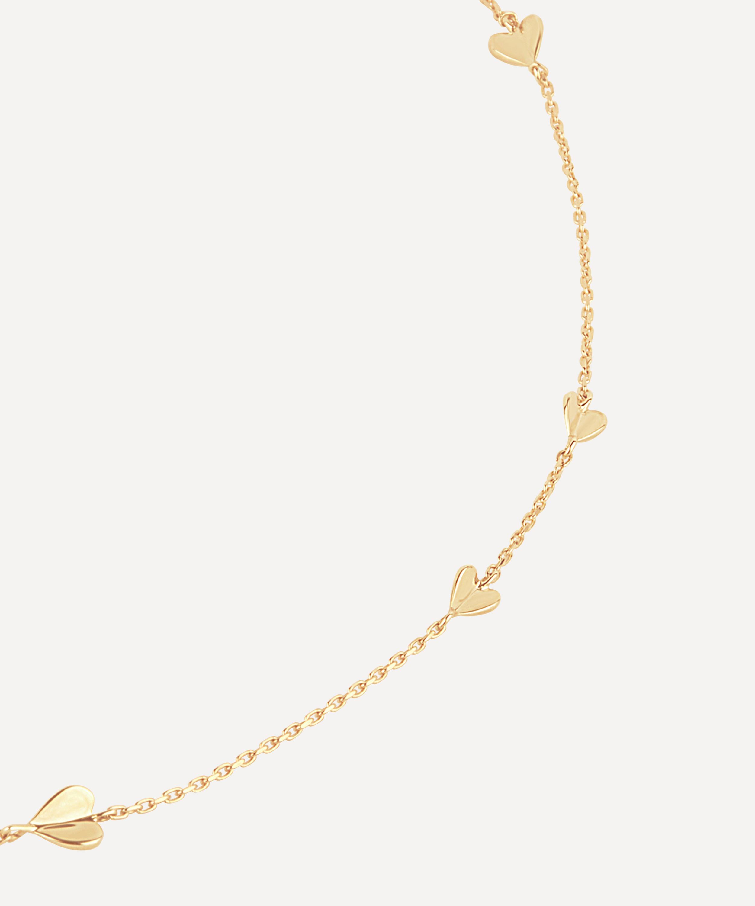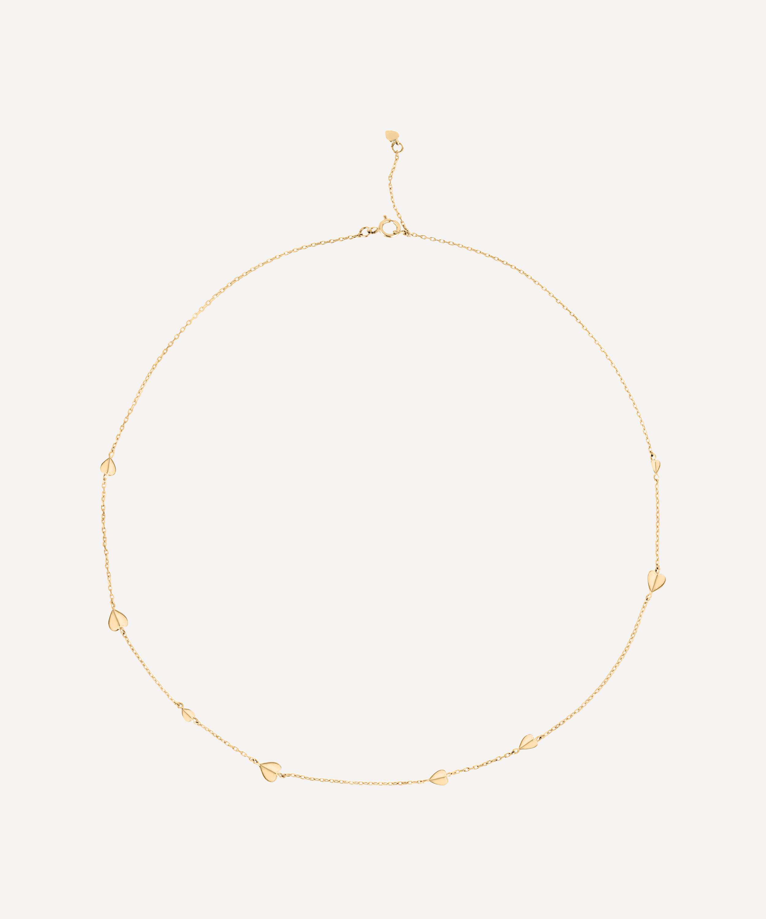 Presented on a short, diamond cut faceted trace chain, this understated necklace features eight tiny, perfectly formed heart charms - each with a folded silhouette that's reminiscent of origami. Designed to slot seamlessly into your everyday jewellery line-up, mix and match this piece with other coordinating Bijou styles for an effortlessly elegant curation that's perfect for both day and night dressing.
