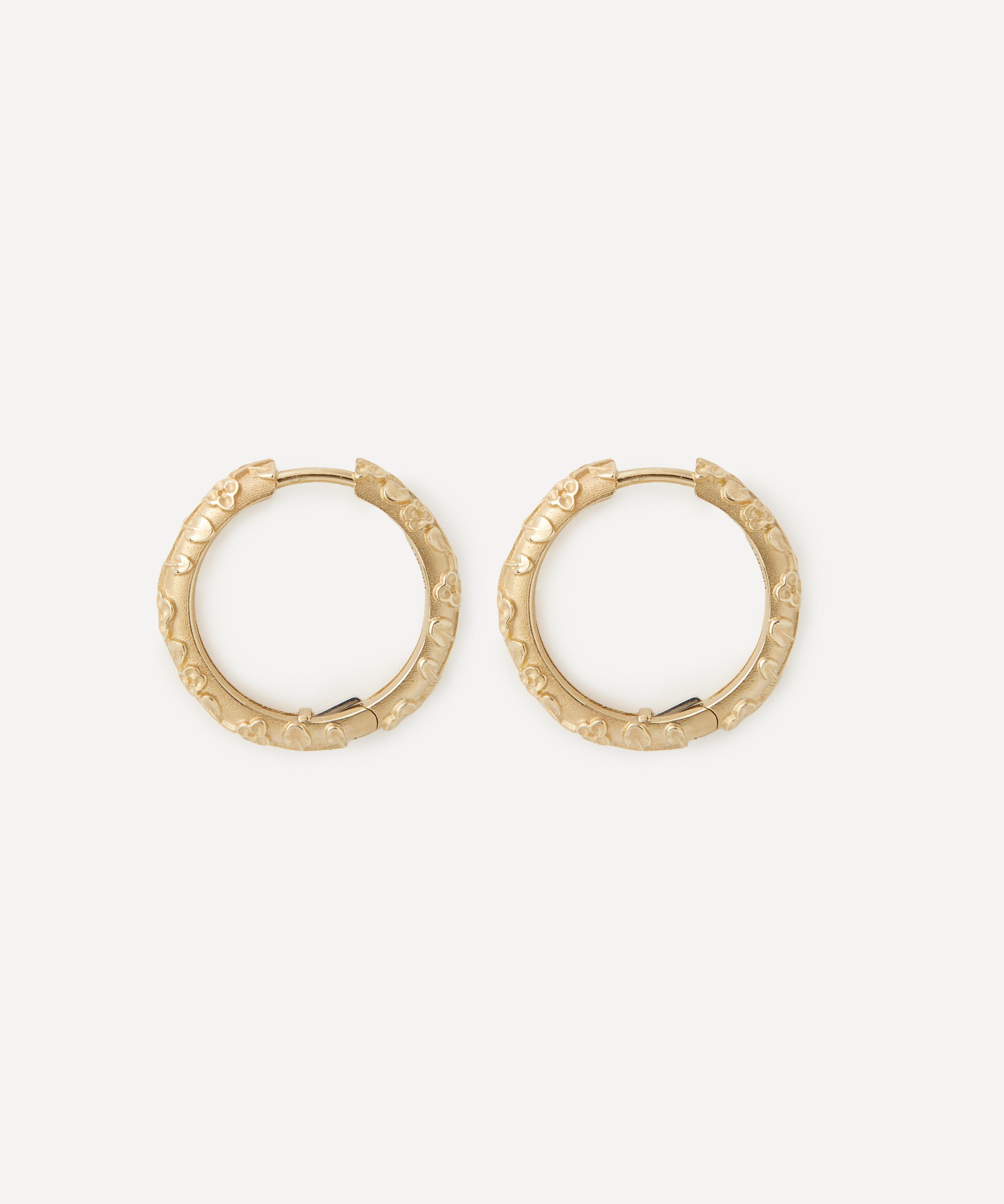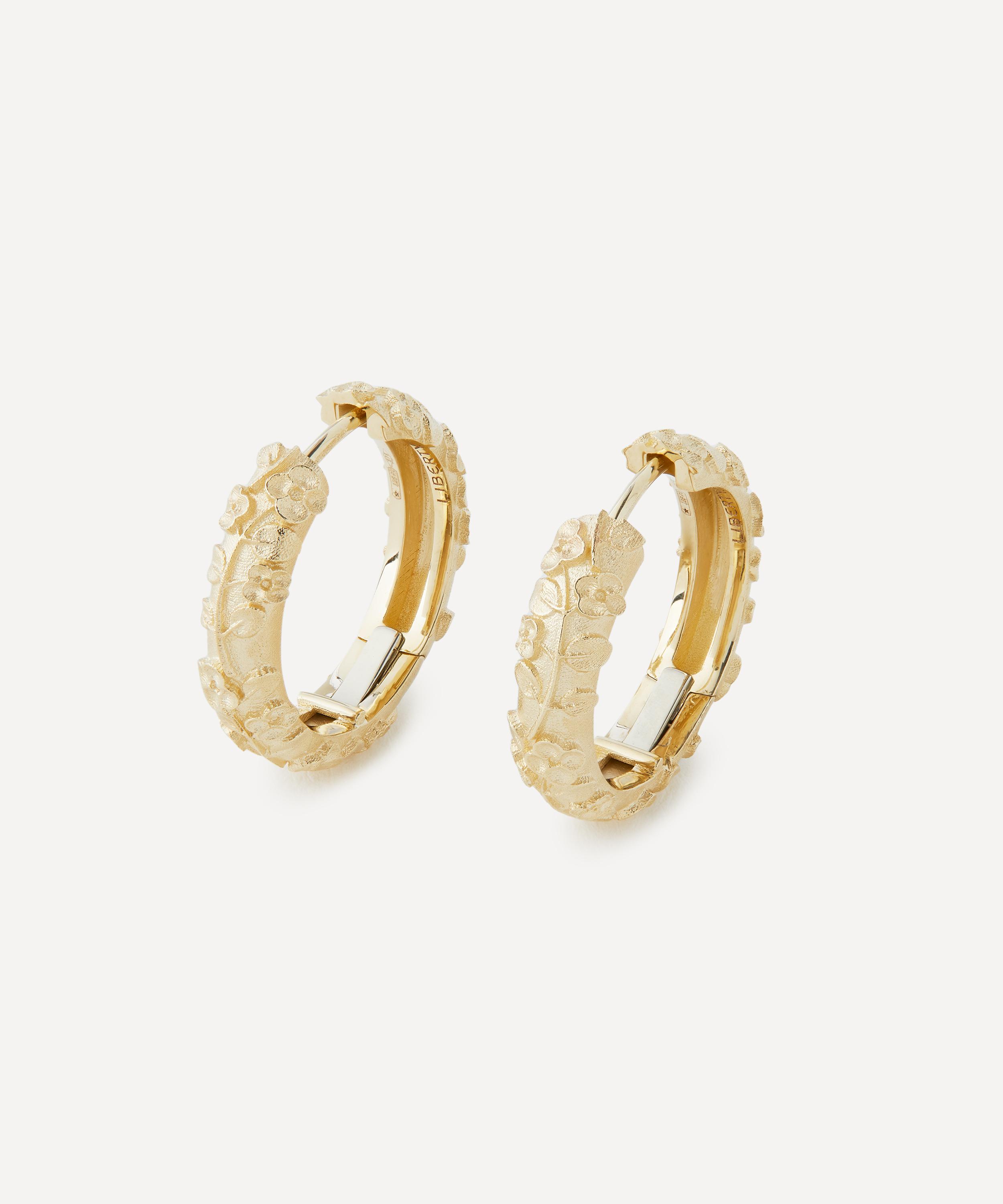Liberty’s Blossom collection is a celebration of the vibrant floral motifs of the Arts & Crafts movement and the intricate wooden carvings of Tudor architecture. These hoop earrings feature an artfully engraved design of trailing gold florals that recall Japanese cherry blossoms, and the floral carvings dotted throughout Liberty’s iconic flagship store. Mix and match with other contrasting metals and finishes from the Blossom collection to create an enchanting wearable garden of precious gold and silver.