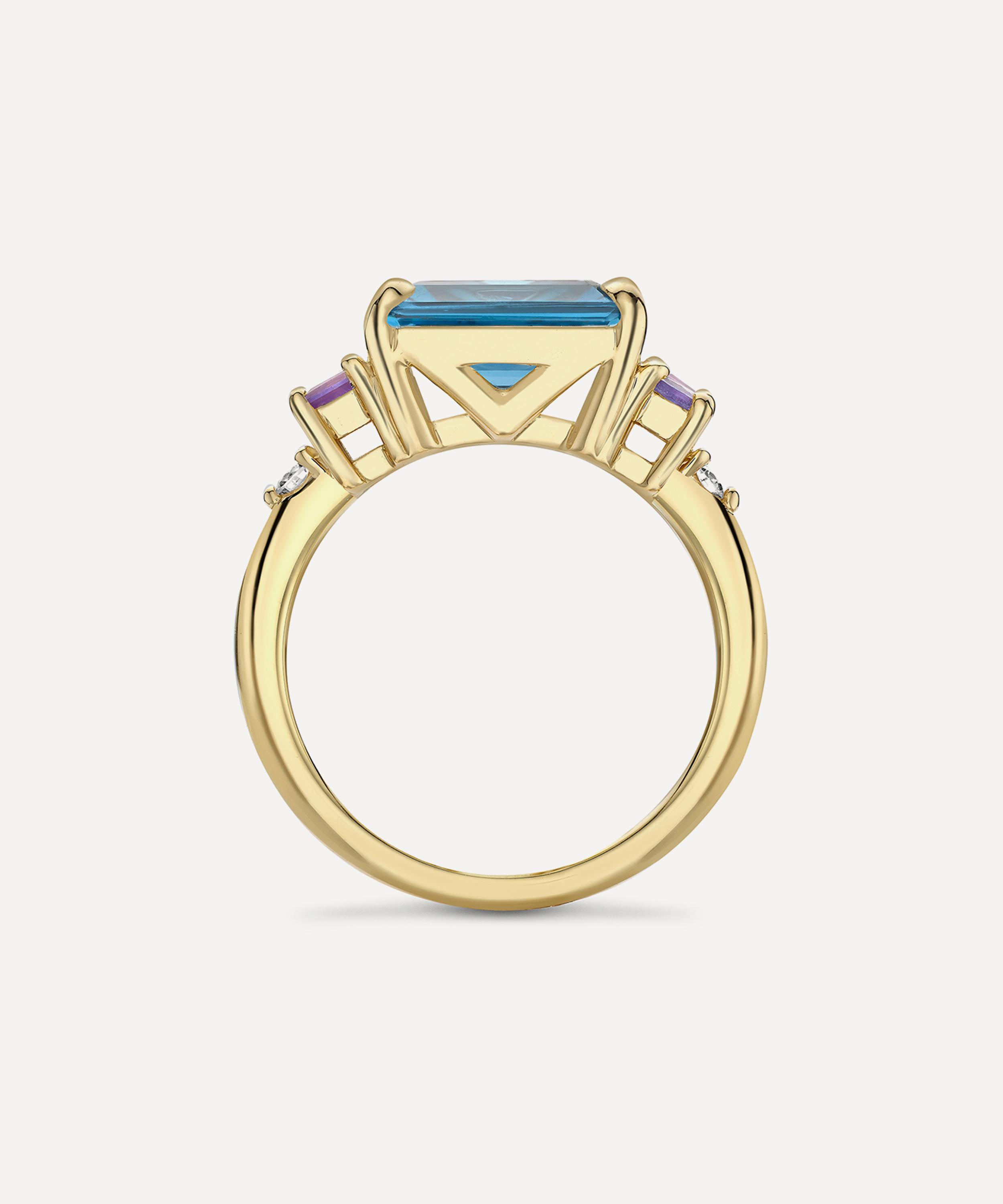 Look effortlessly striking and accelerate the impact of your outfit with the Art Deco-inspired Charli cocktail ring from Dinny Hall. Handcrafted from 9ct gold, it features an octagon-cut topaz at the centre, beautifully elevated by tanzanite, amethyst, and lab-created diamonds – together creating an intriguing colour mix of blue and purple hues. Style it solo or stacked.