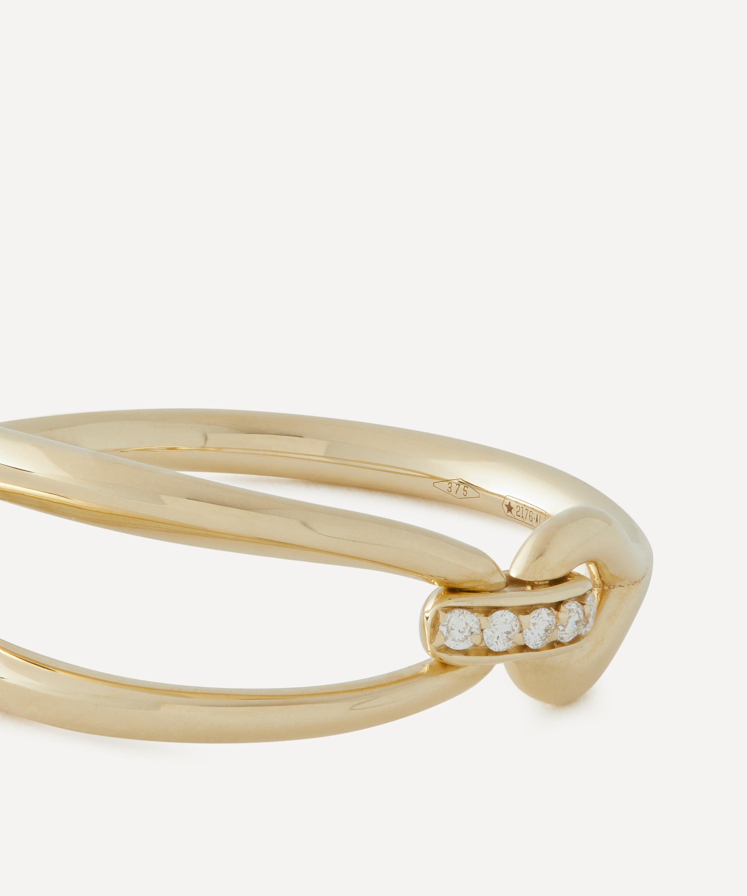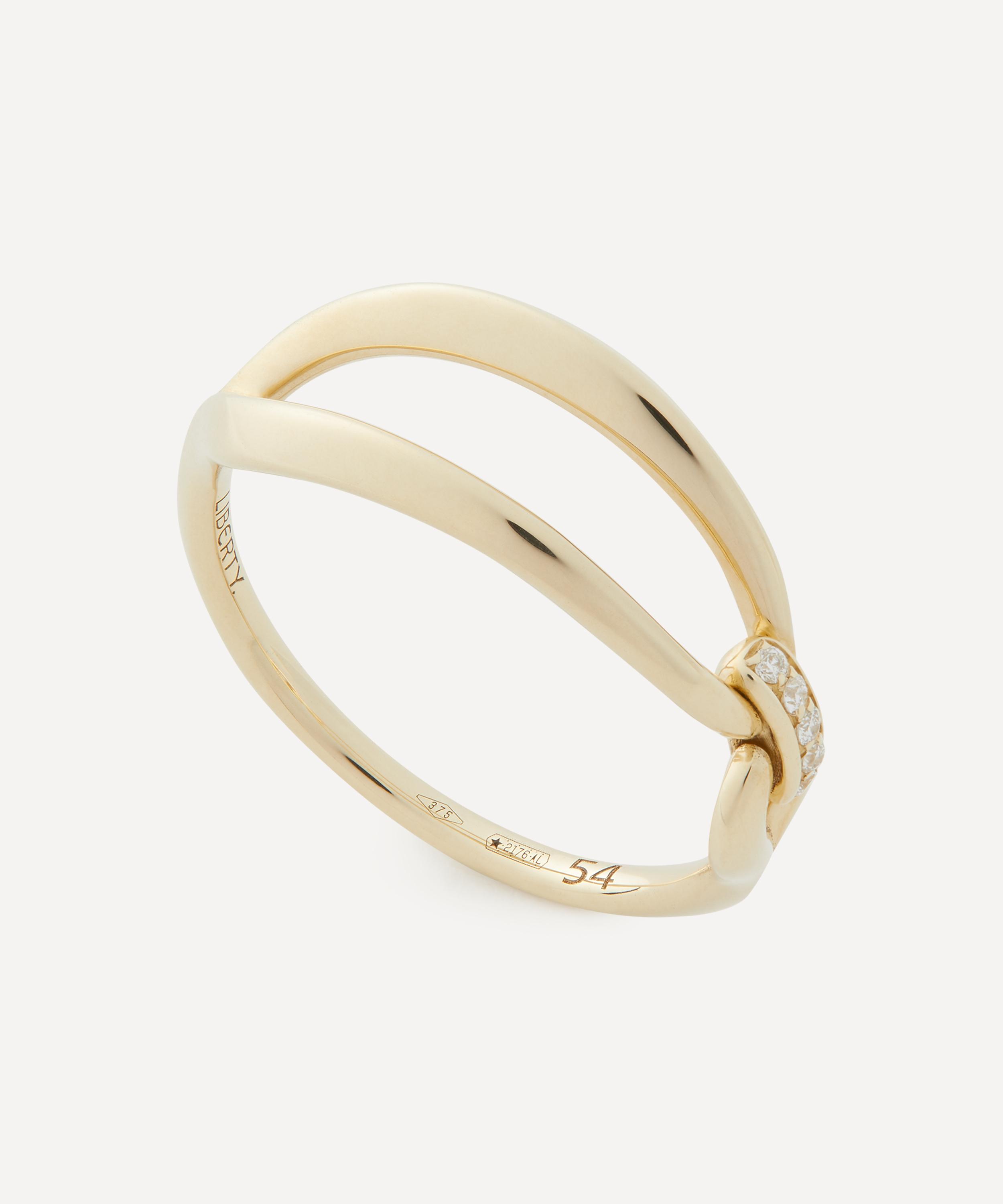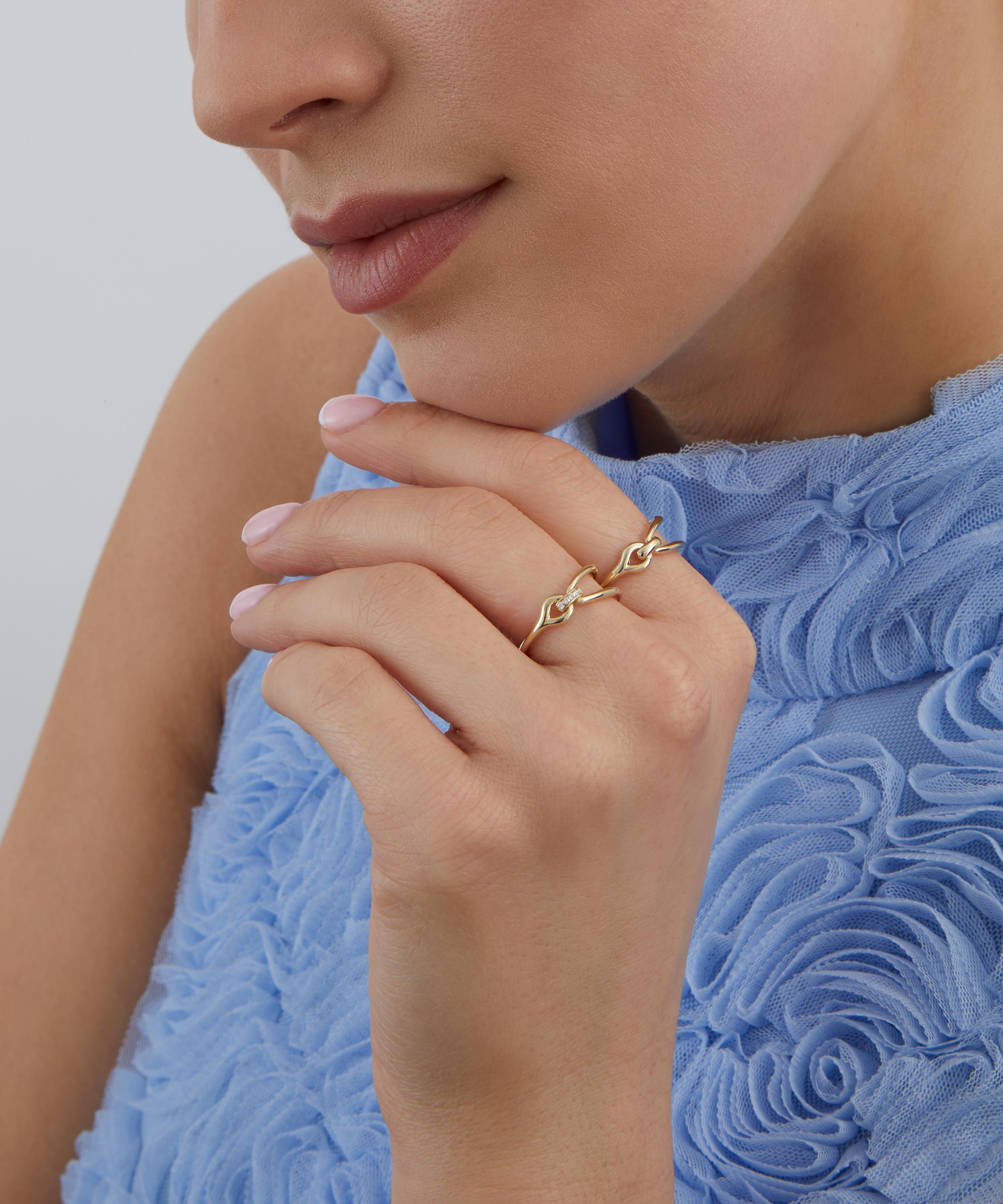 Celebrate love and deep connection in its purest form with this symbolic ring from Liberty’s Link collection – a token of love, unity and the invisible thread that ties hearts together. Drawing inspiration from our Liberty archive, it combines minimalist and modern aesthetics with a sleek band and diamond-encrusted knot detail handmade in 9ct gold for a clean, timeless appeal. Perfect for declaring your special bond with a partner, friend or a loved one, it can be worn on its own or layered with the second plain Link Ring from the collection. Together, these rings form a perfect pair, just like two hearts linked by love.