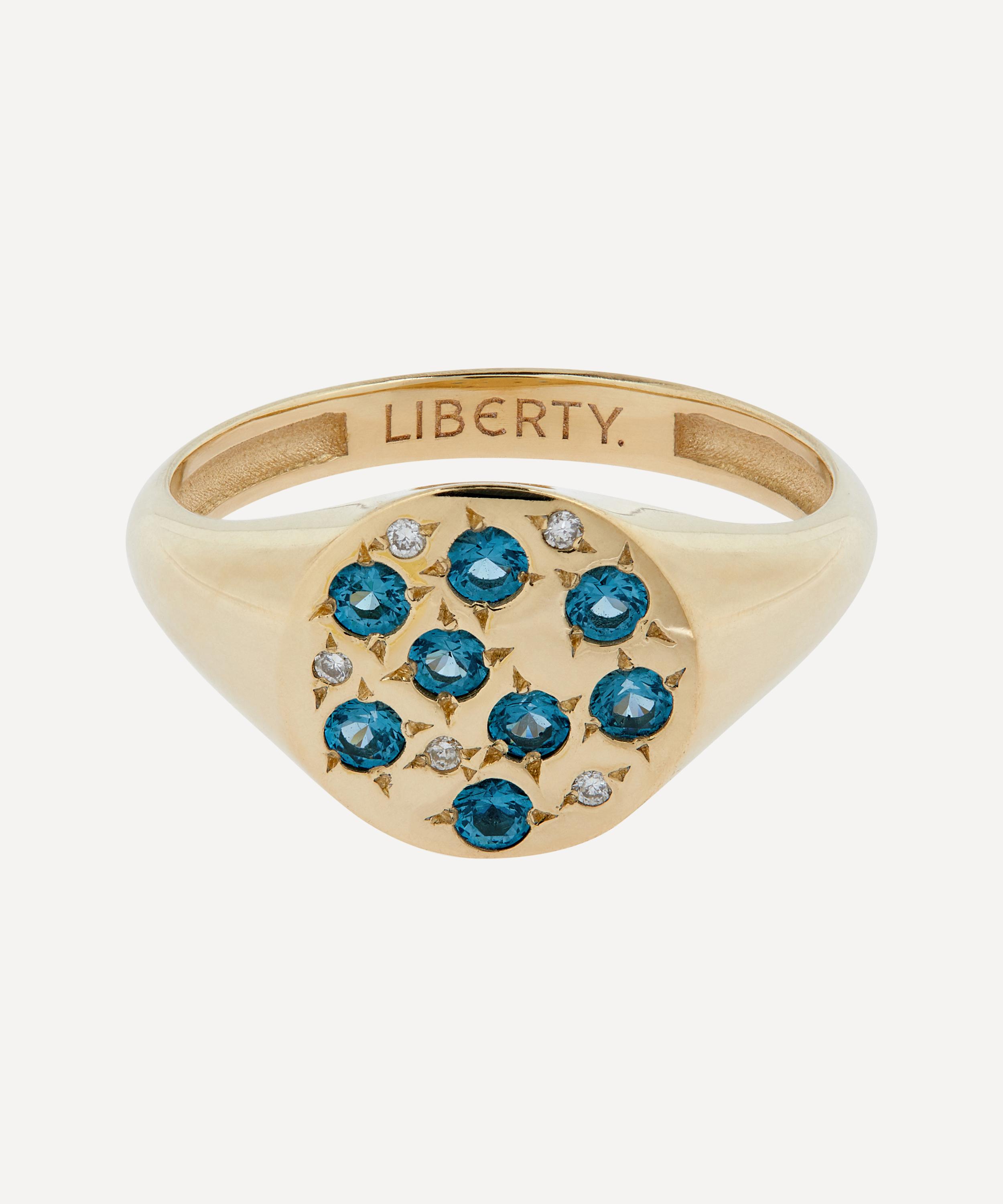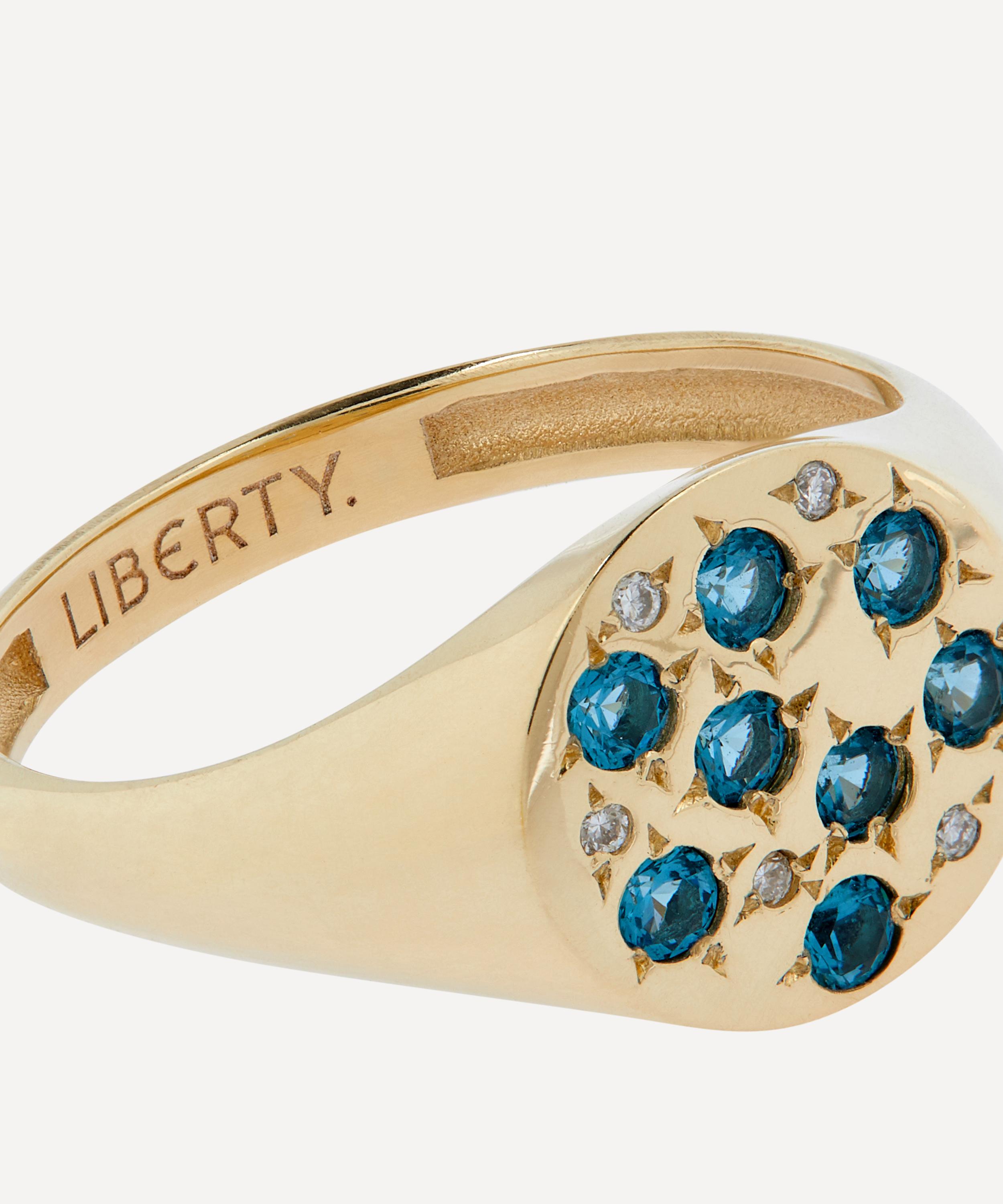 A modern heirloom that pays tribute to Liberty’s collector spirit, this statement Equinox signet ring is complete with lab-grown blue London topaz stones.