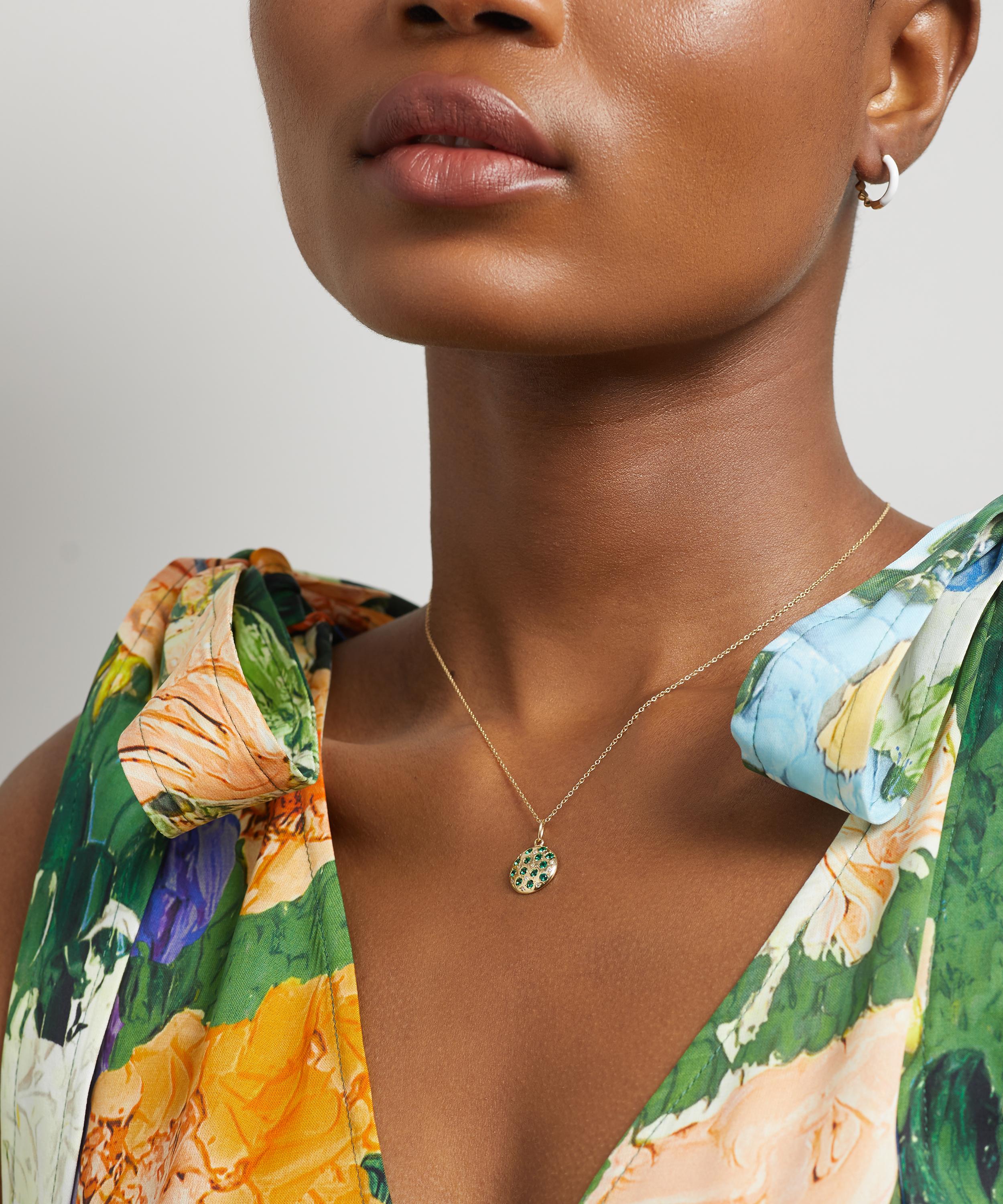 A modern heirloom that pays tribute to Liberty’s collector spirit, this statement Equinox pendant is complete with lab-grown tsavorite stones.