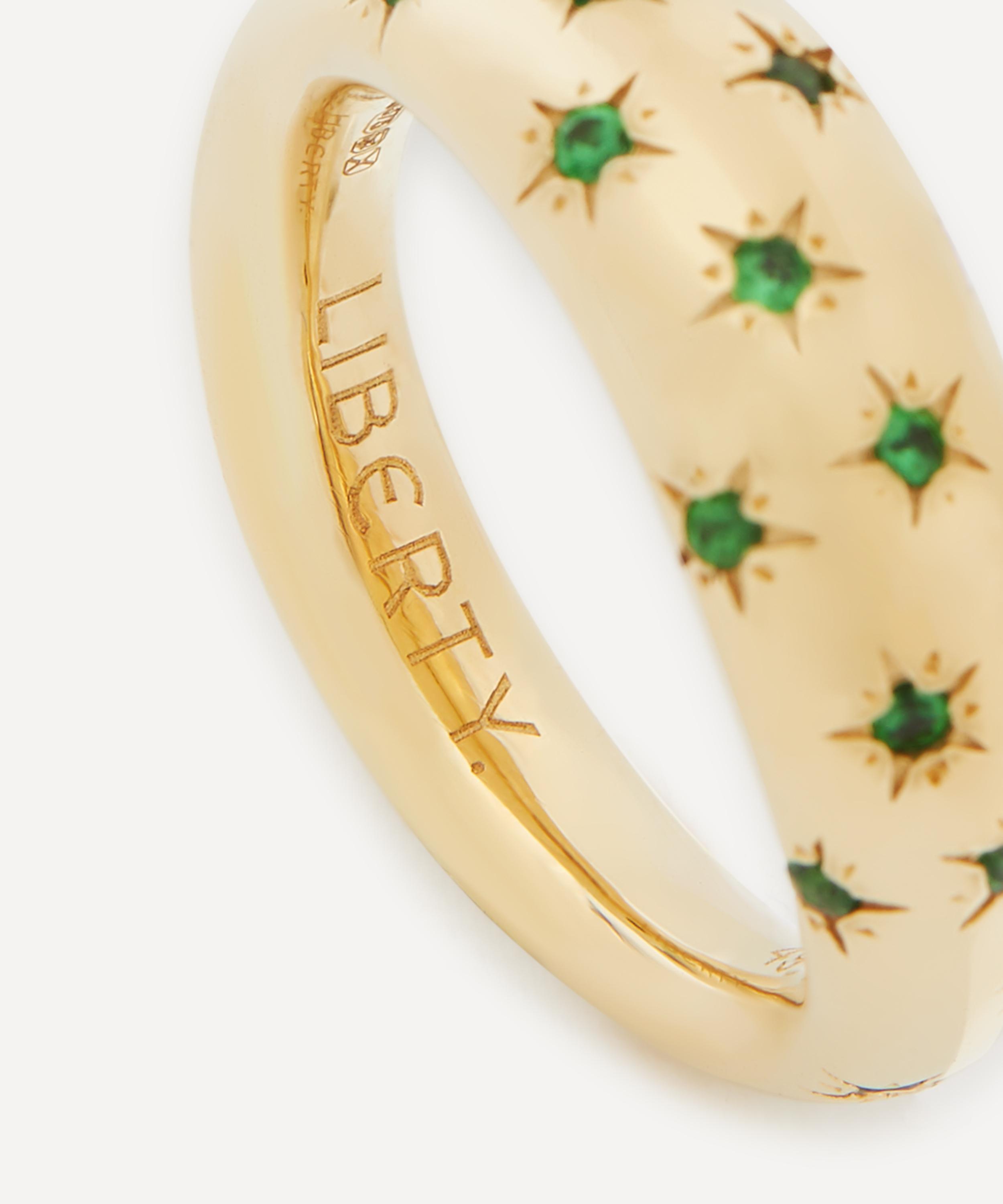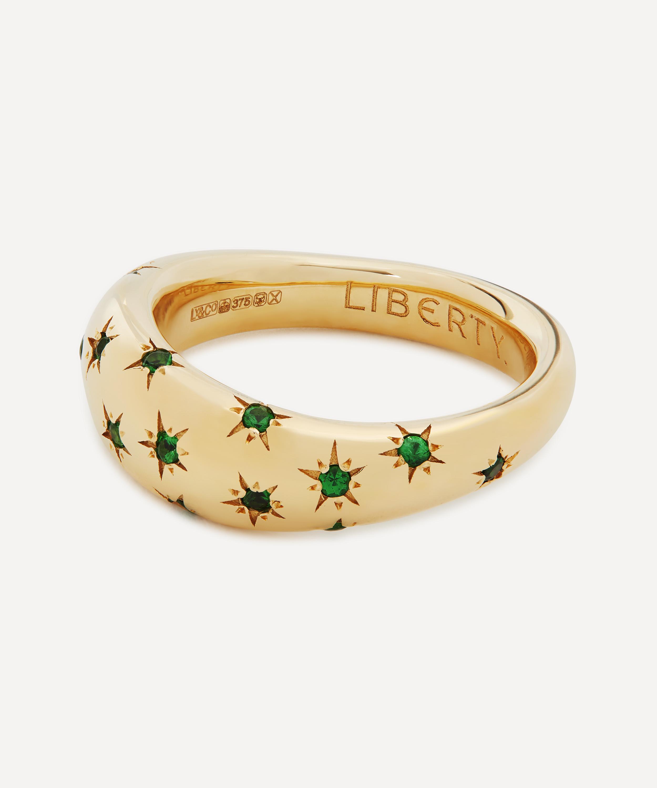 The Ianthe Star ring by Liberty is crafted by hand in Italy from 9 carat gold, and set with delicately spaced tsavorite stones – a twinklingly modern homage to Liberty’s Art Nouveau heritage.