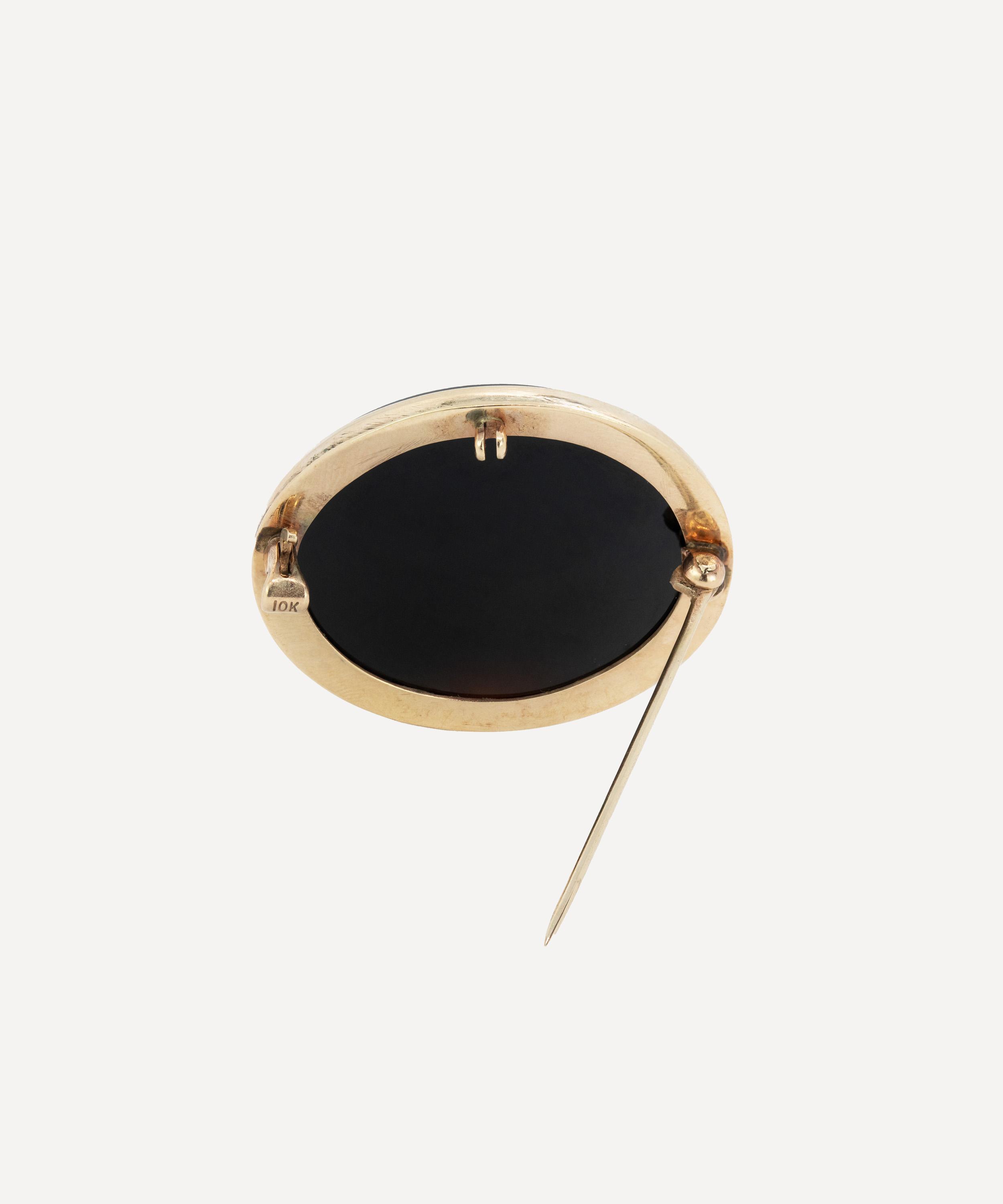 Crafted from 9ct gold, it features a vintage onyx cameo depicting a finely carved horse-riding steeplechase scene. The carving shows white figures against a contrasting black background while the pin and safety hook fastening make for easy styling it on the lapels of your favourite blazer or blouse. Try teaming it with several other artisanal brooches and pins for a maximalist take on traditional formalwear.