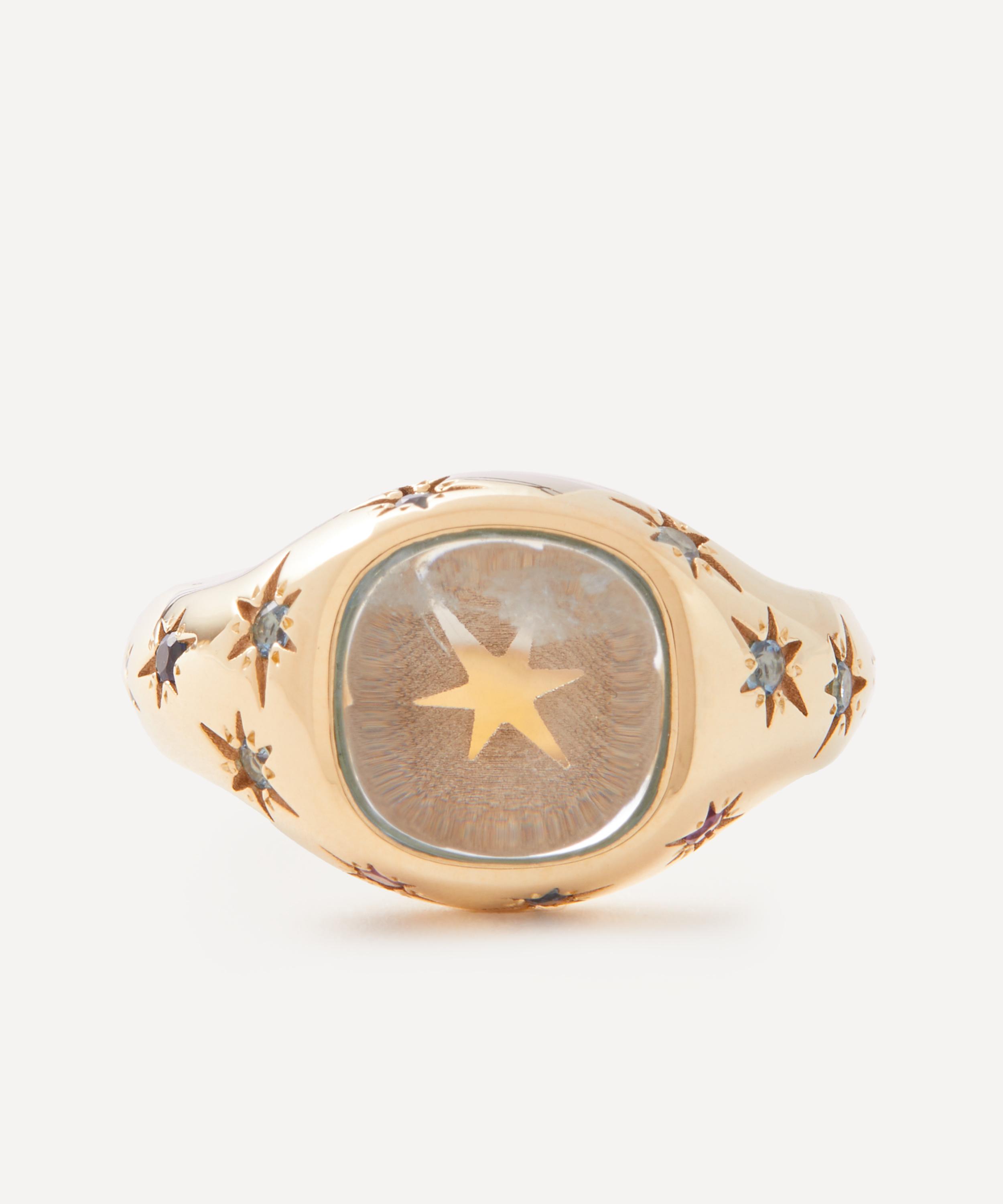 Translating print details and vintage shapes into luxuriously jewelled textures, the Ianthe Star cocktail ring captures our studio’s historic passion for artists and artisans. Decorated with an aquamarine centre stone accented with sapphire set stars on the sides, this twinkling modern heirloom pays tribute to Liberty’s collector spirit.