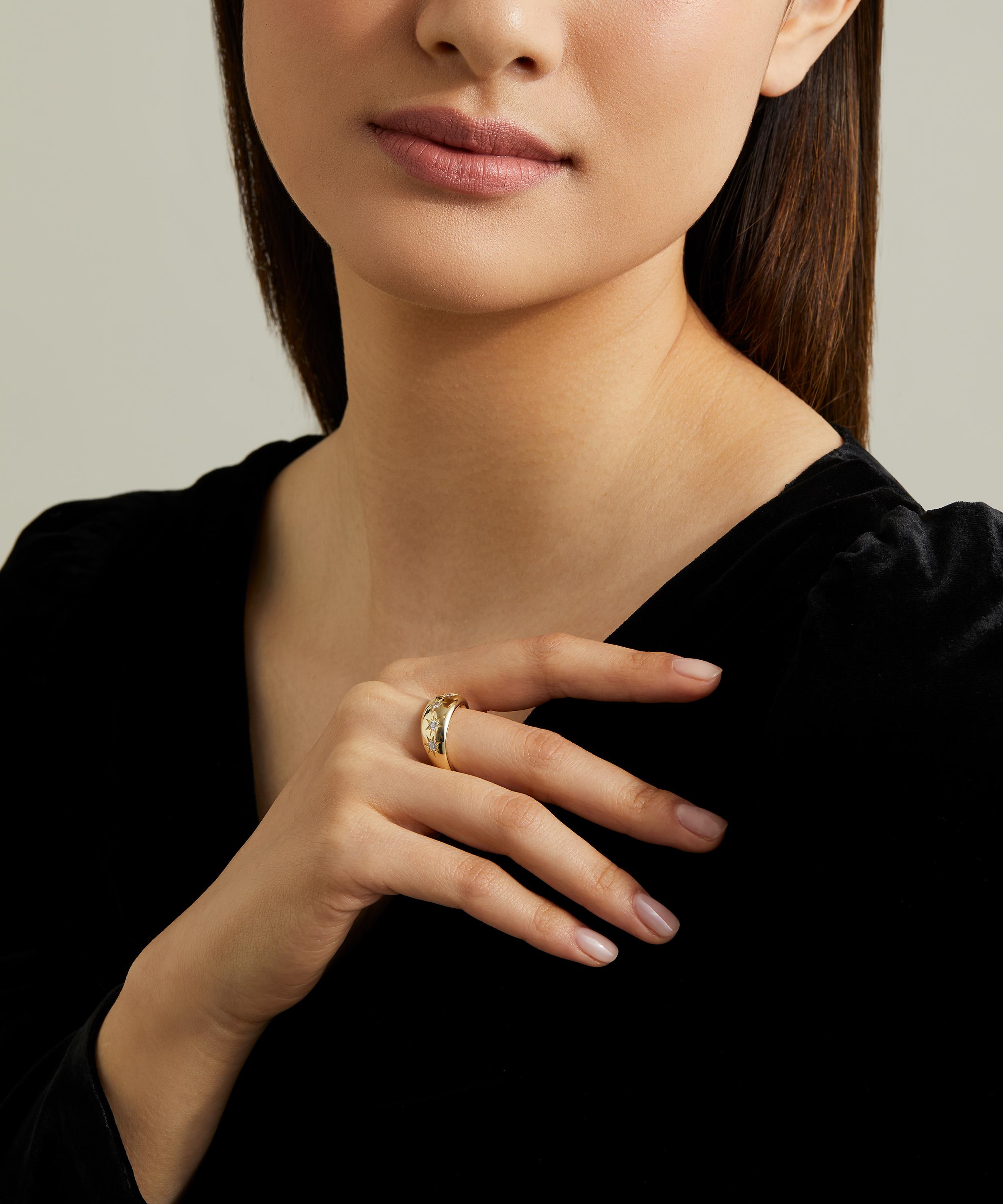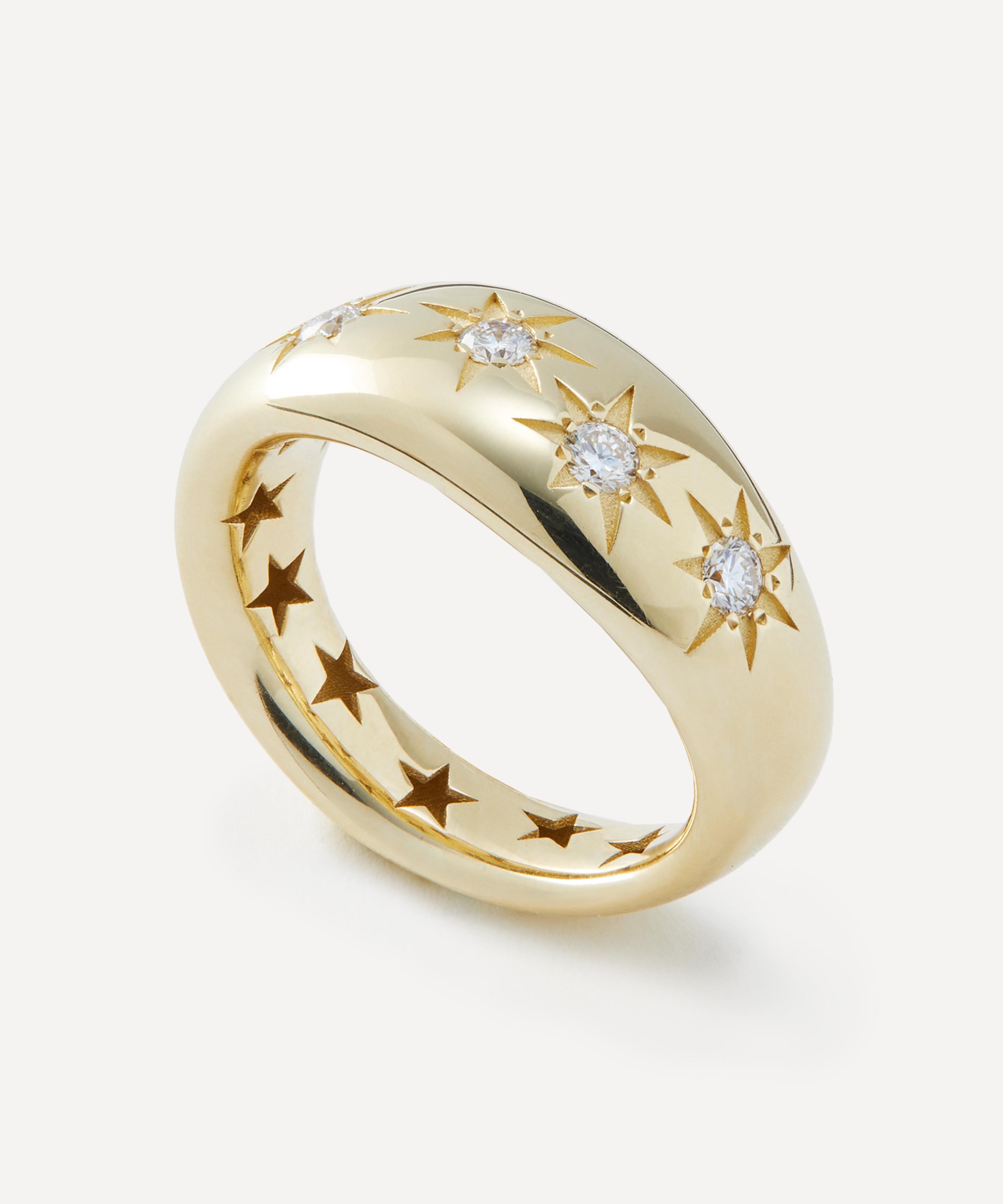 Translating print details and vintage shapes into luxuriously jewelled textures, the Ianthe Star Luxury band ring captures our studio’s historic passion for artists and artisans. Crafted from 9ct gold, it features a sleek, polished band skilfully decorated with five star set diamond accents – boasting a twinkling modern heirloom that pays tribute to Liberty’s collector spirit.