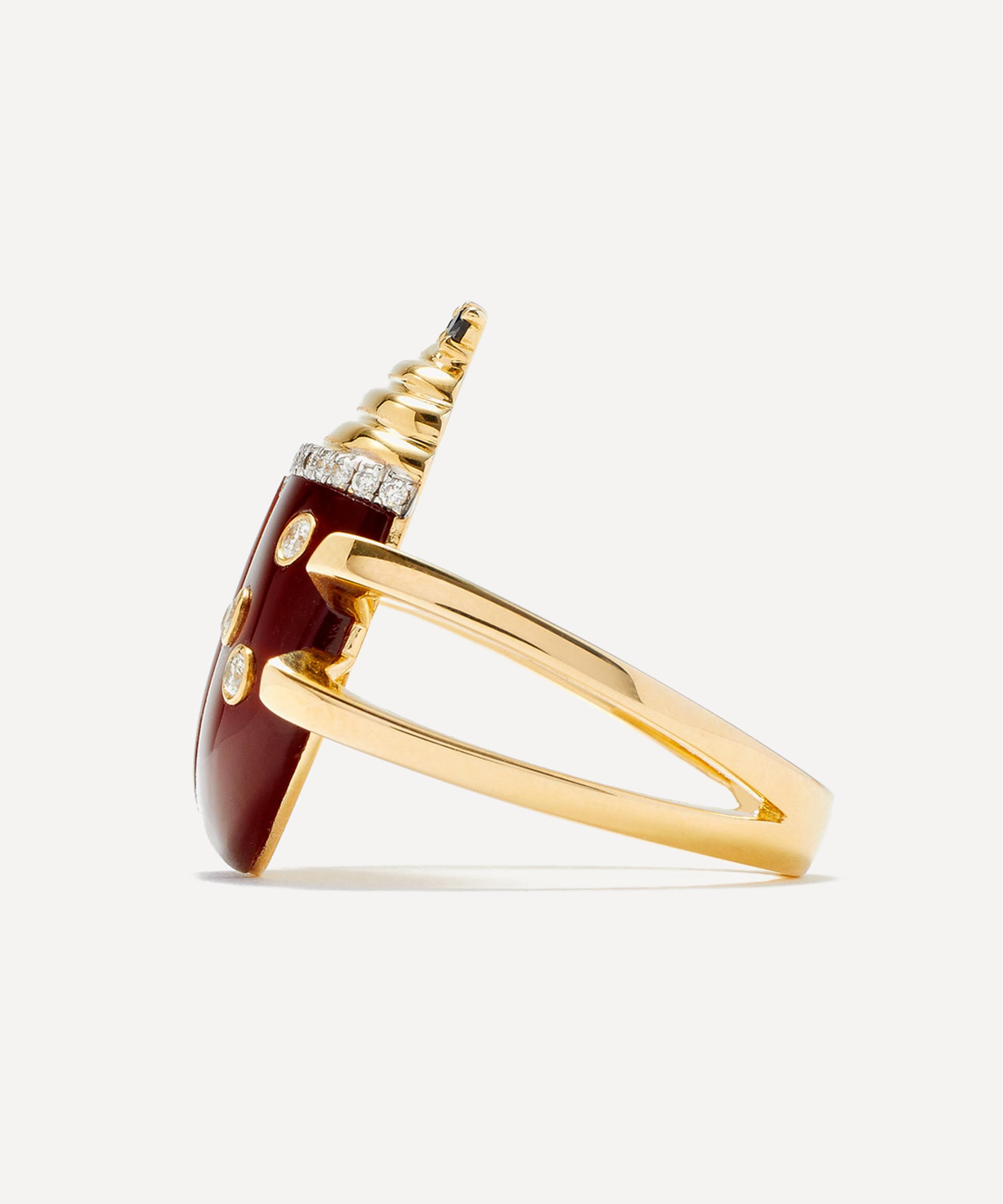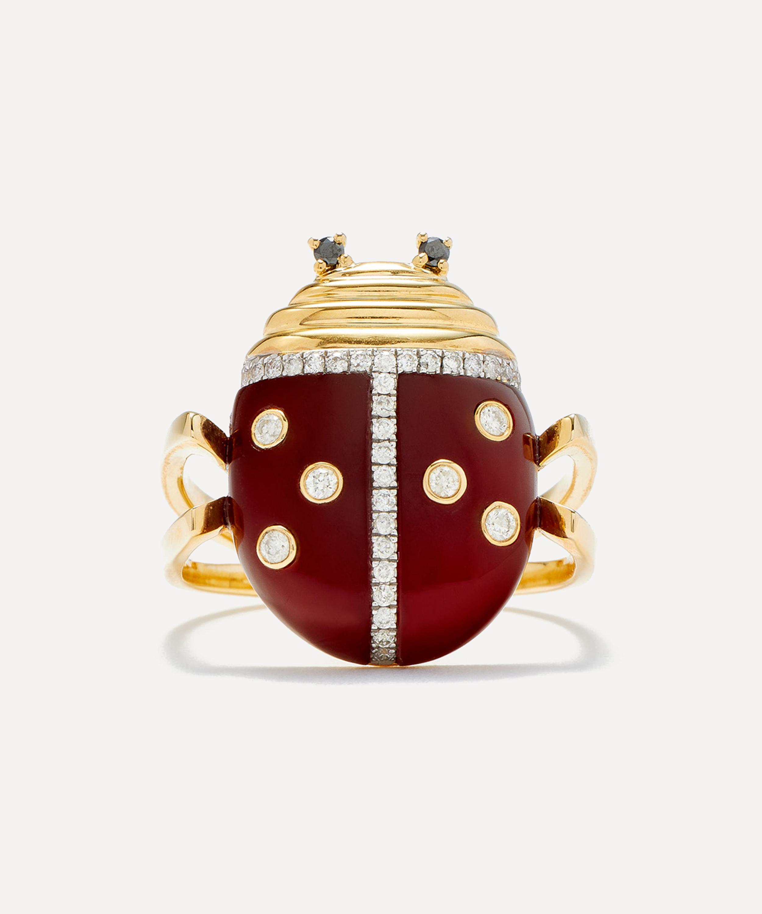 Delve into a world of vintage classics and tie your whole look together with this ring from Yvonne Léon. Crafted from 9ct gold, the designer beautifully unites vintage charm with a modern reinvention in this piece – featuring a sweet ladybug design composed of red agate with grey and black diamonds. Wear it on its own, incorporate it into a stack, or mix and match with other pieces from the brand.