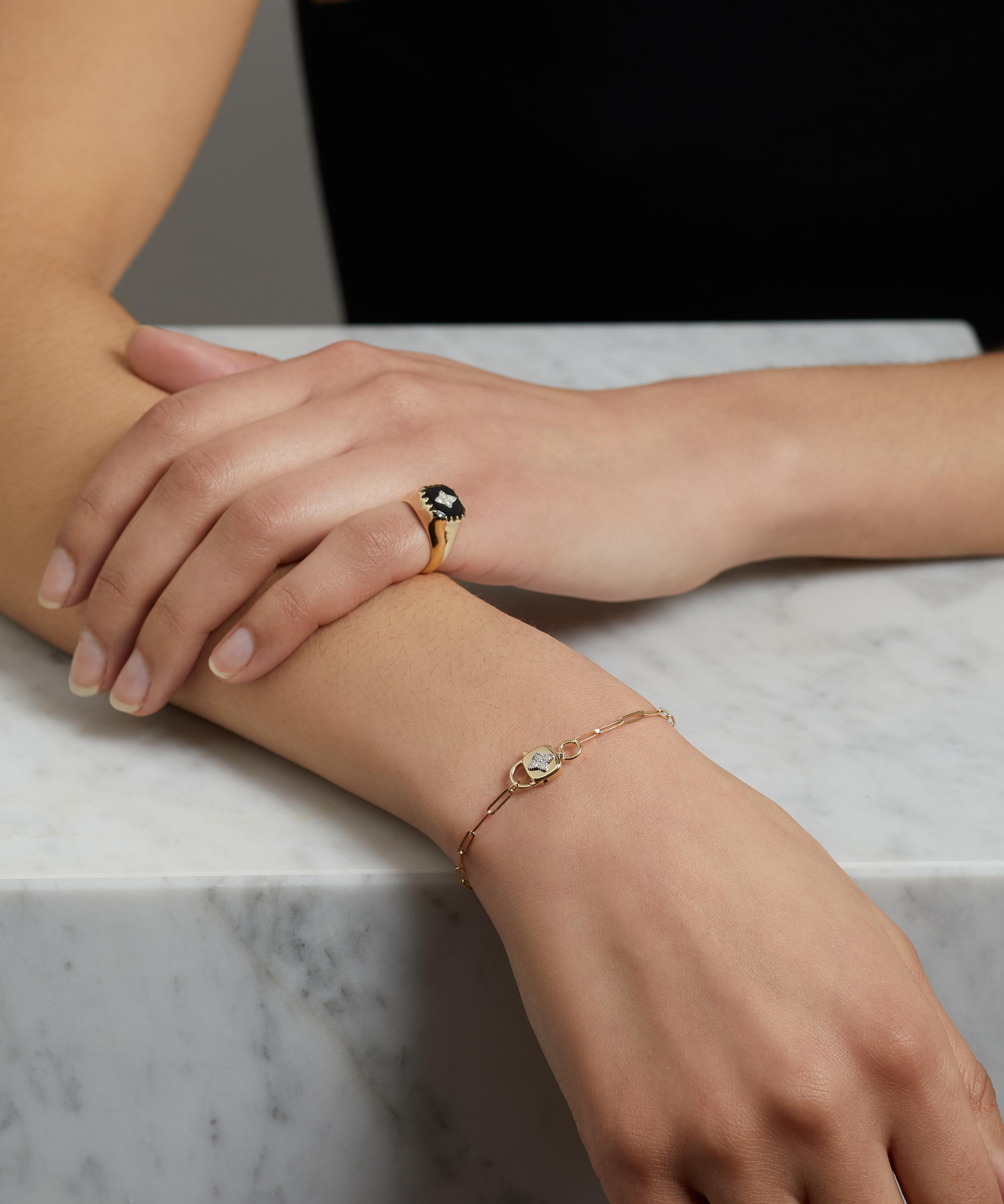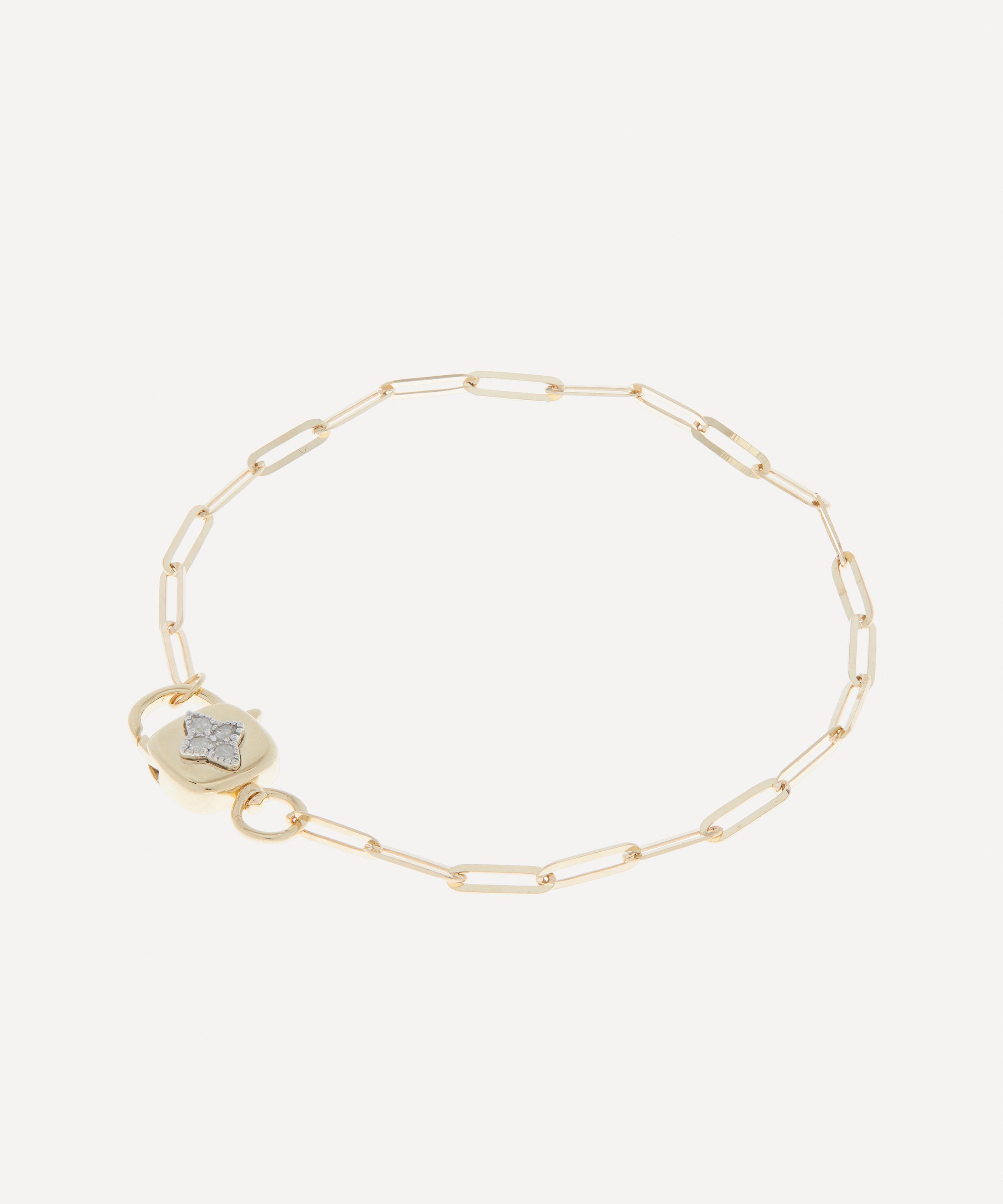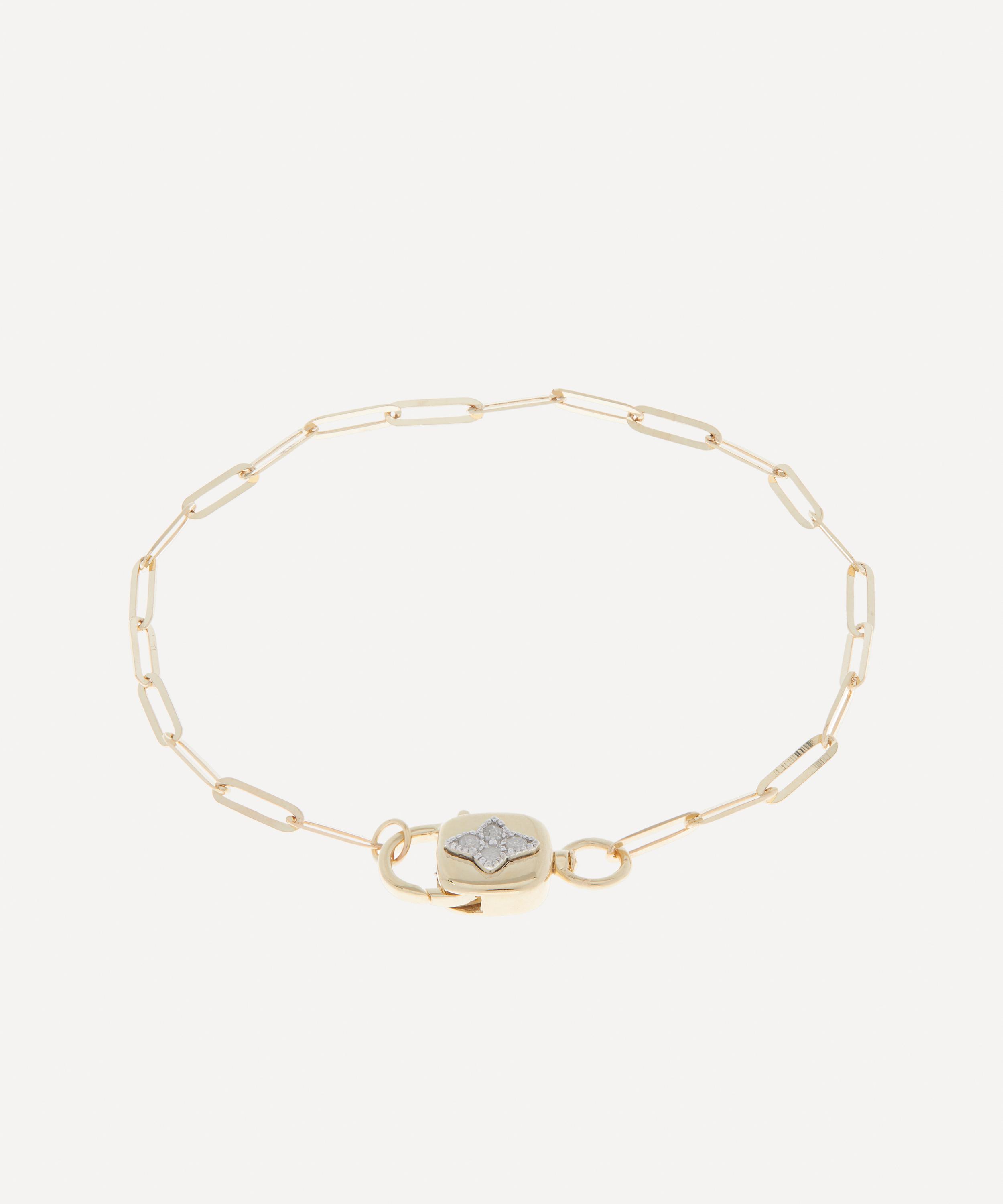 Pascale Monvoisin's Louise chain bracelet beautifully illustrates the French designer's signature fusion of precious, natural, and perfectly ordinary materials. Crafted in 9ct gold, this bracelet is characterised by long paperclip links and a large lobster clasp adorned with a 9ct white gold setting and tiny, sparkling diamonds.