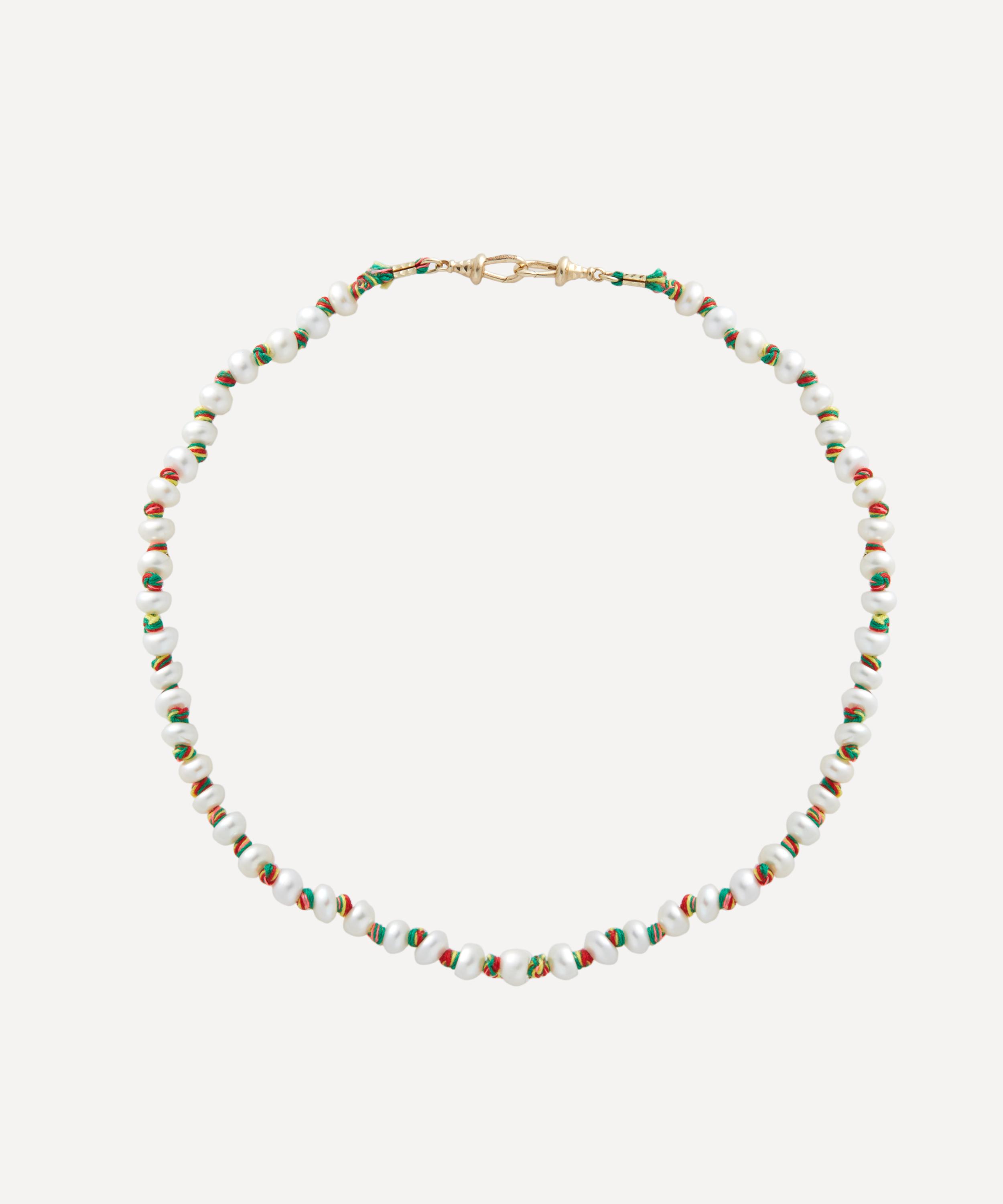 Crafted in India, this necklace features a hand-woven, multi-coloured mauli link, interspersed with small, freshwater pearls. Complete with a gold handcuff finish at each end to be embellished with a pendant of your choice, it makes for the perfect stand-out piece in your jewellery line-up. Wear it on its own by simply attaching one cuff to the other, or pair it with one of the brand’s symbolic barrel pendants for a bedazzling curation that is personal to you.