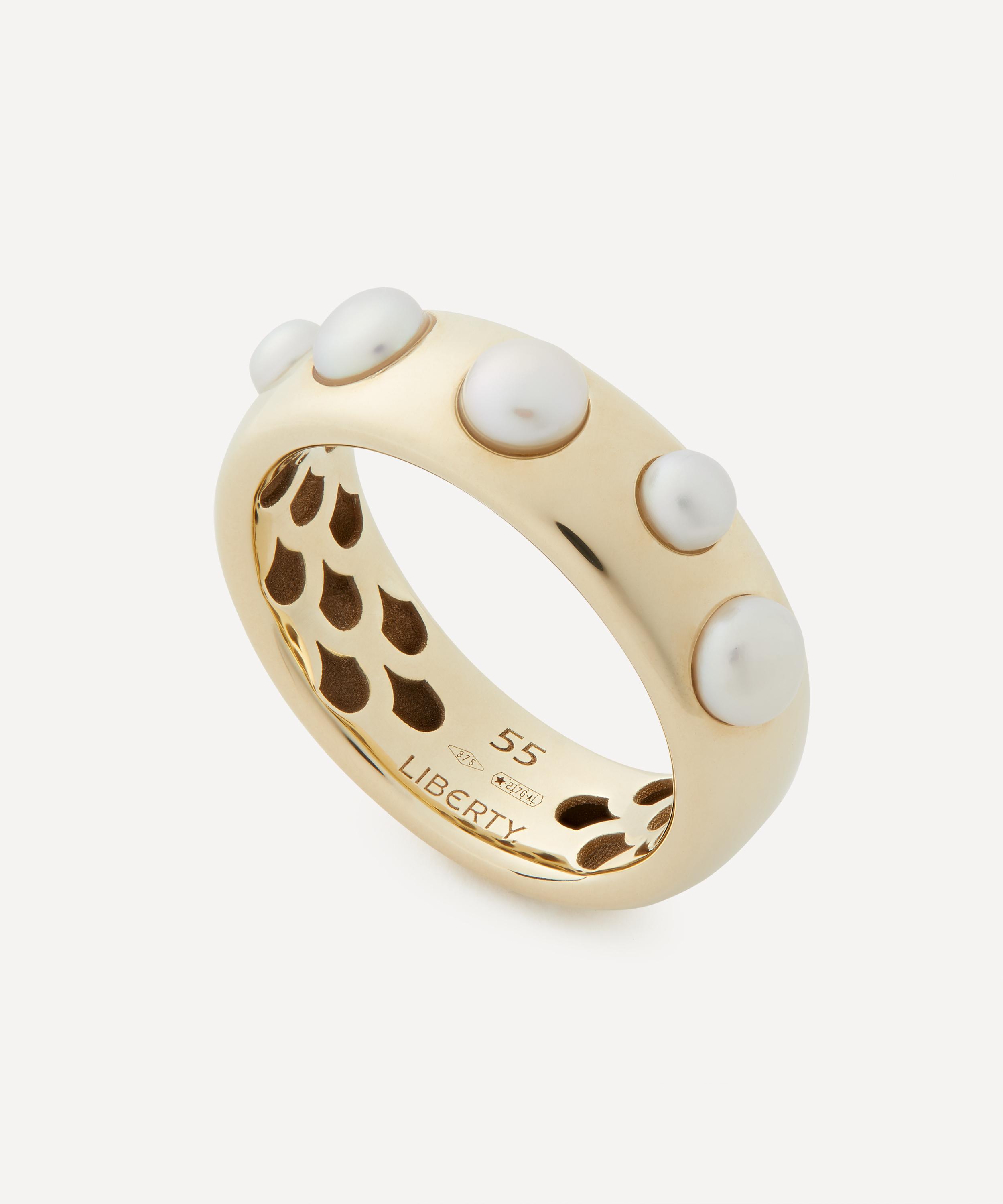Challenging conventional jewellery design, this ring is expertly handcrafted in Italy from solid 9ct gold, featuring small freshwater pearls nestled within a wide band – each pearl represents a fragment of moonlight captured amidst the swirling shadows, a magical interplay of light and dark. Designed as a declaration of individuality, strength and fluidity, it can be styled on its own, or paired with the coordinating Moon Shadow Medium Band Ring and Creole Hoops for a bit of understated luxury.