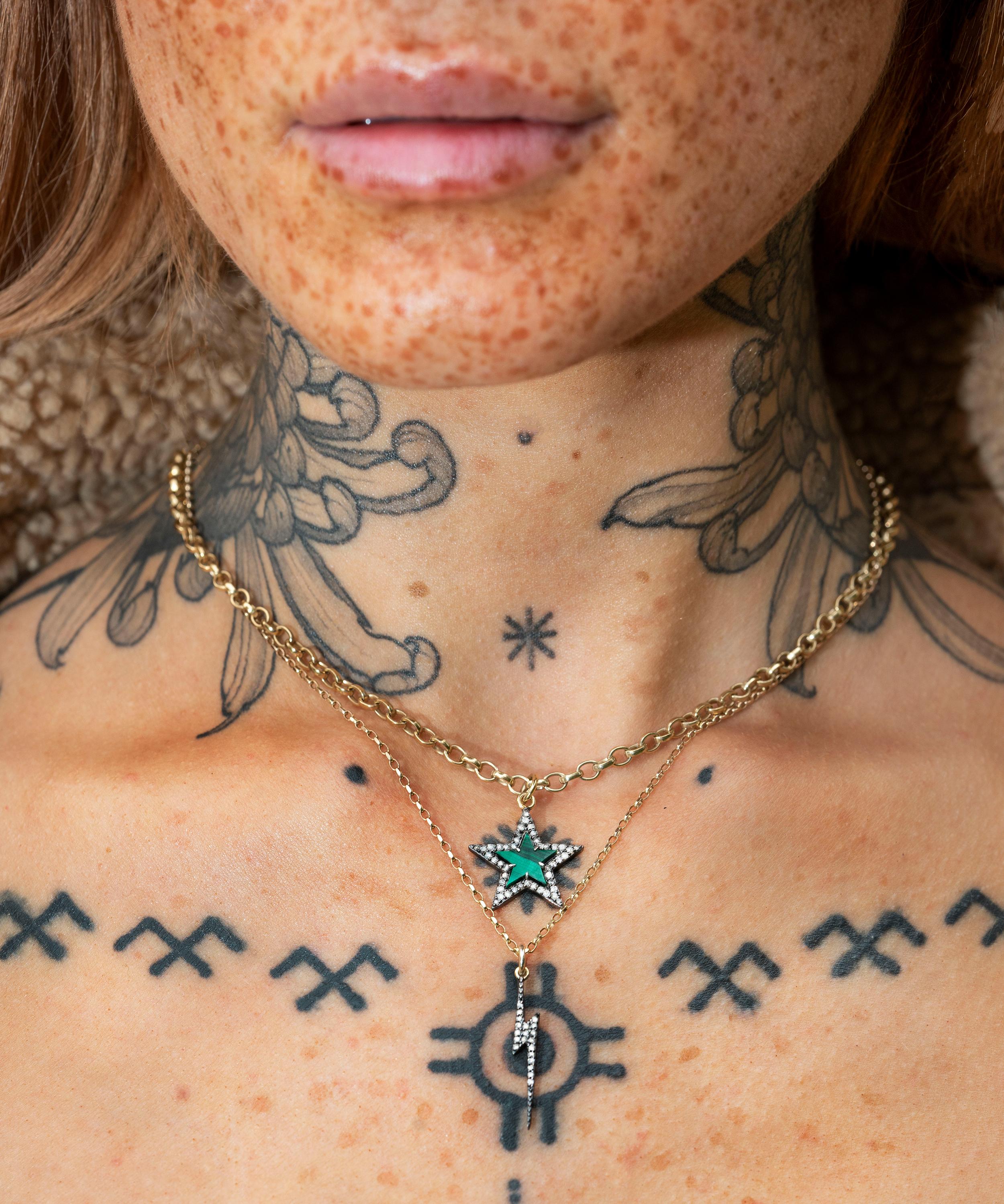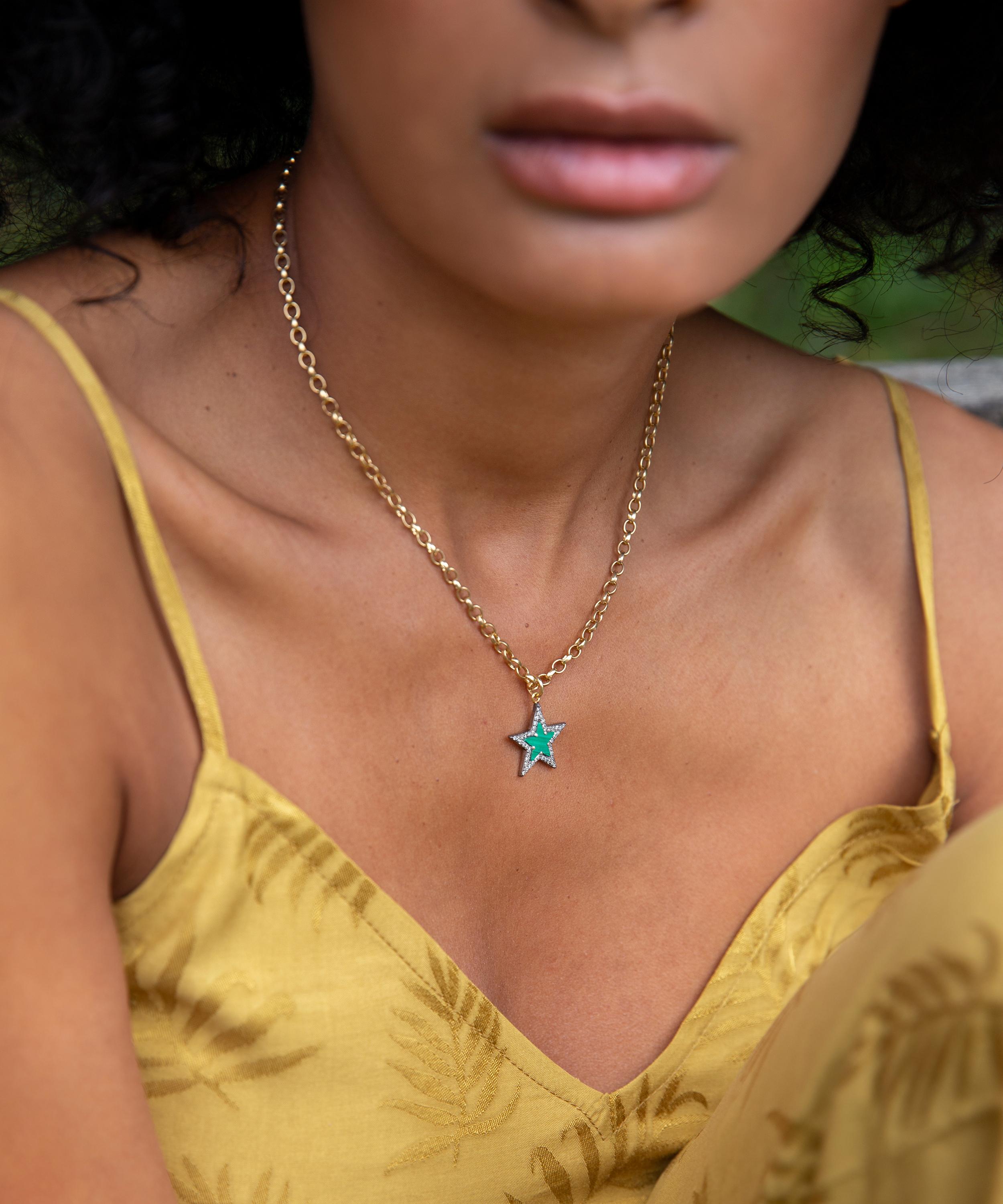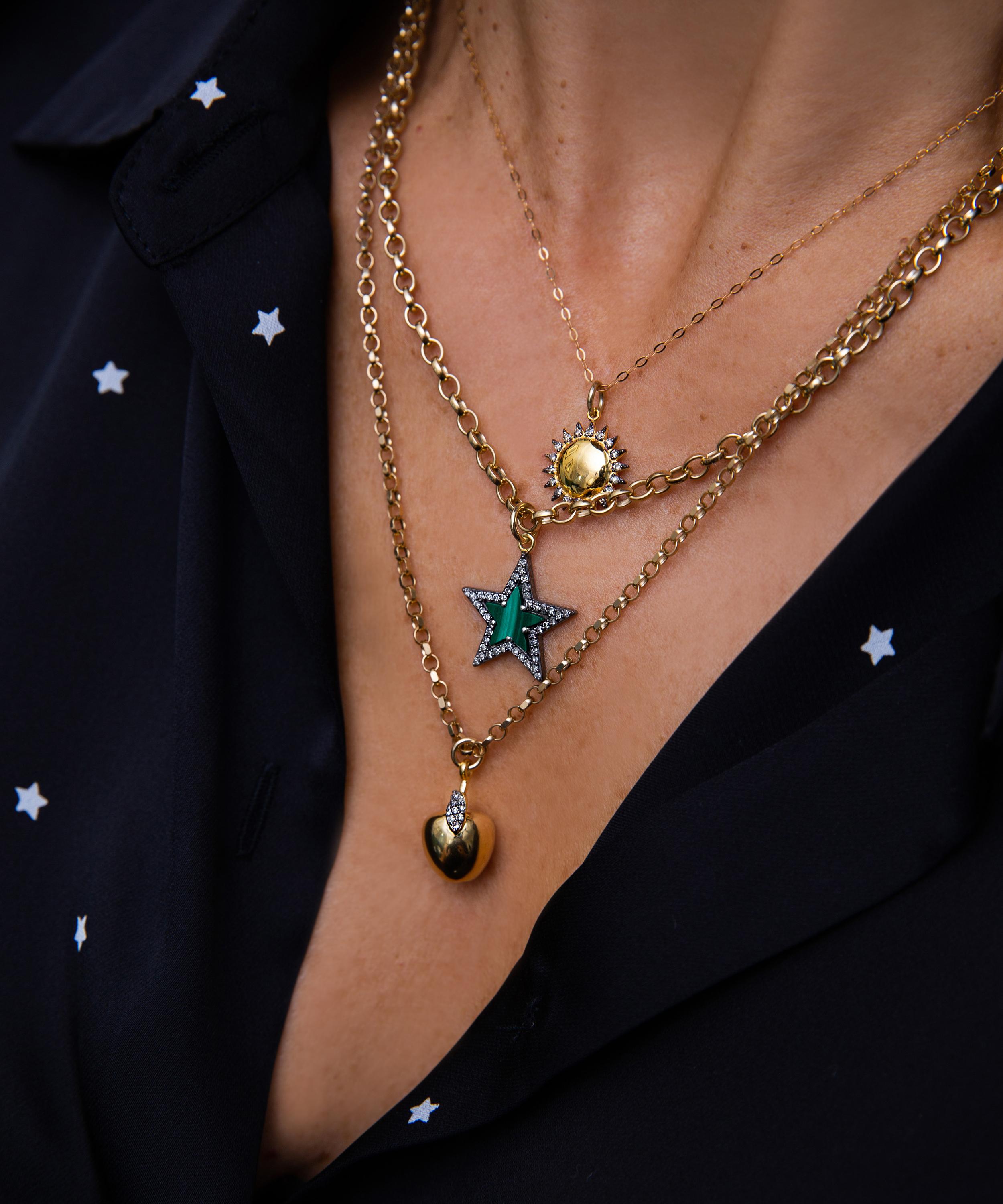 A crowd-pleasing favourite, this pioneering necklace features a star-shaped pendant adorned with a green malachite stone in the centre – exuding the calming presence found in nature. The gem is elegantly framed with an outline of white pave’ diamonds, amplifying the opulent sheen emanating from the stone. Suspended from a gold-plated belcher chain, you can wear this piece alone as a stylish keepsake, or layer it with similar styles for your own custom curation.