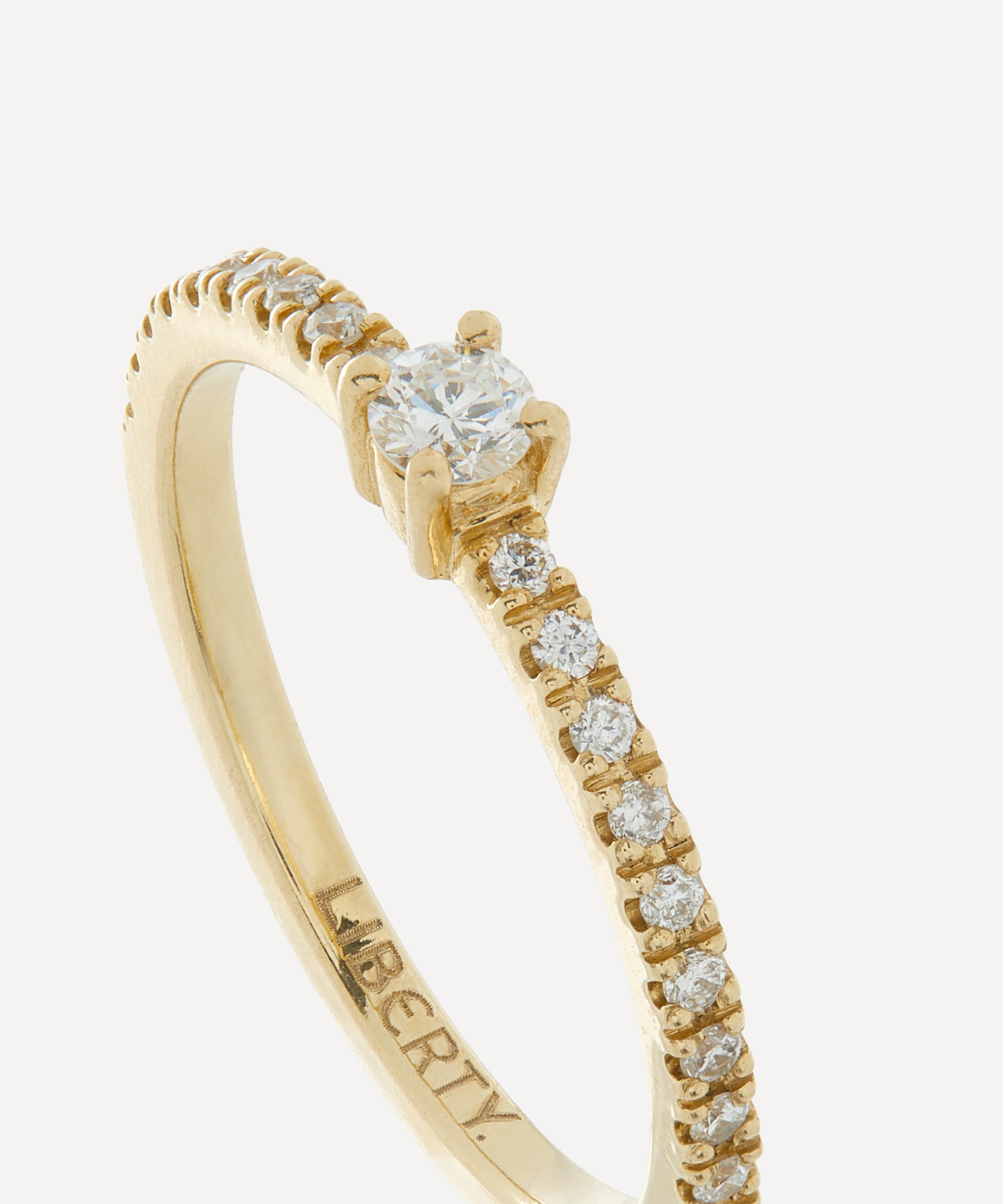 Encrusted with lab-grown diamonds around the band, this beautiful ring features a round, brilliant cut diamond that takes centre stage, accented by a high-polished finish and engraved Liberty logo on the inside band. Each ring is made in a small batch and is perfect as an engagement option, wedding band or anniversary gift.