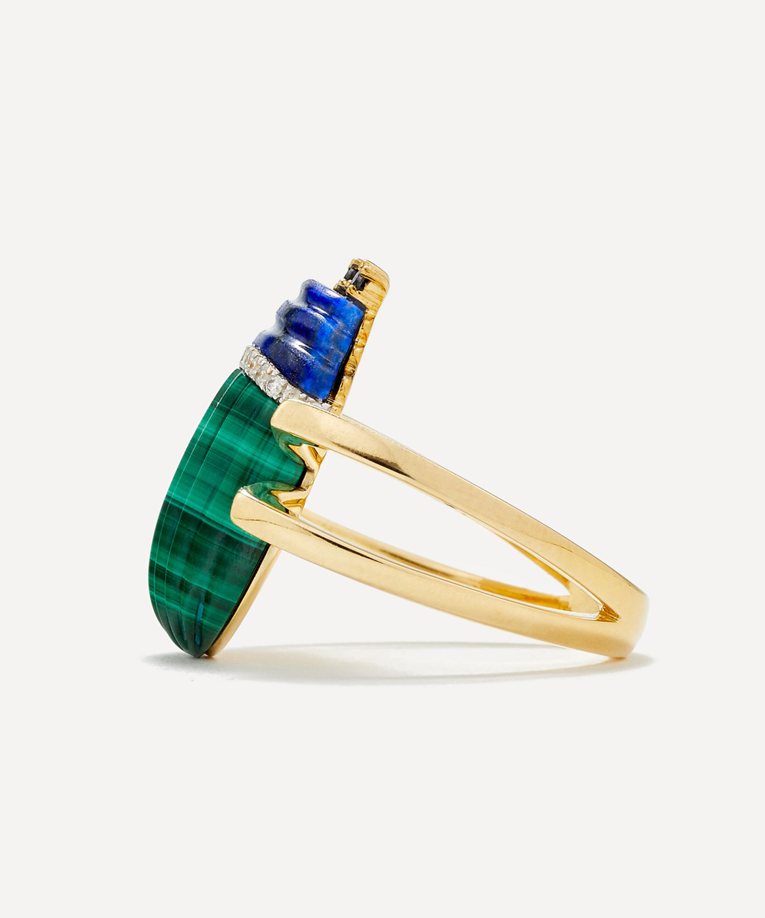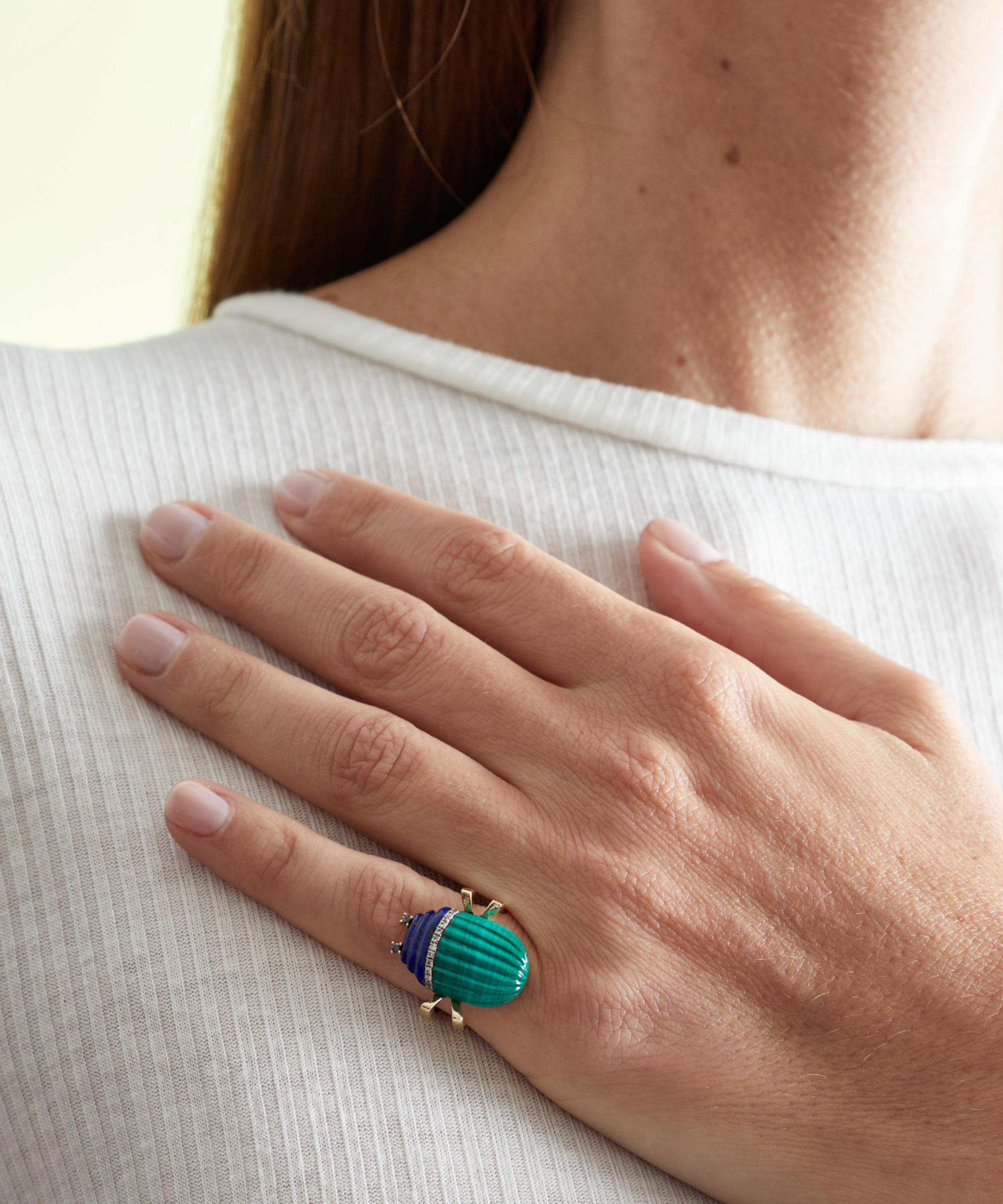 Delve into a world of vintage classics and tie your whole look together with this ring from Yvonne Léon. Crafted from 9ct gold, the designer beautifully unites vintage charm with a modern reinvention in this piece – featuring a sweet scarab design composed of malachite and lapis lazuli with grey and black diamonds. Wear it on its own, incorporate it into a stack, or mix and match with other pieces from the brand.