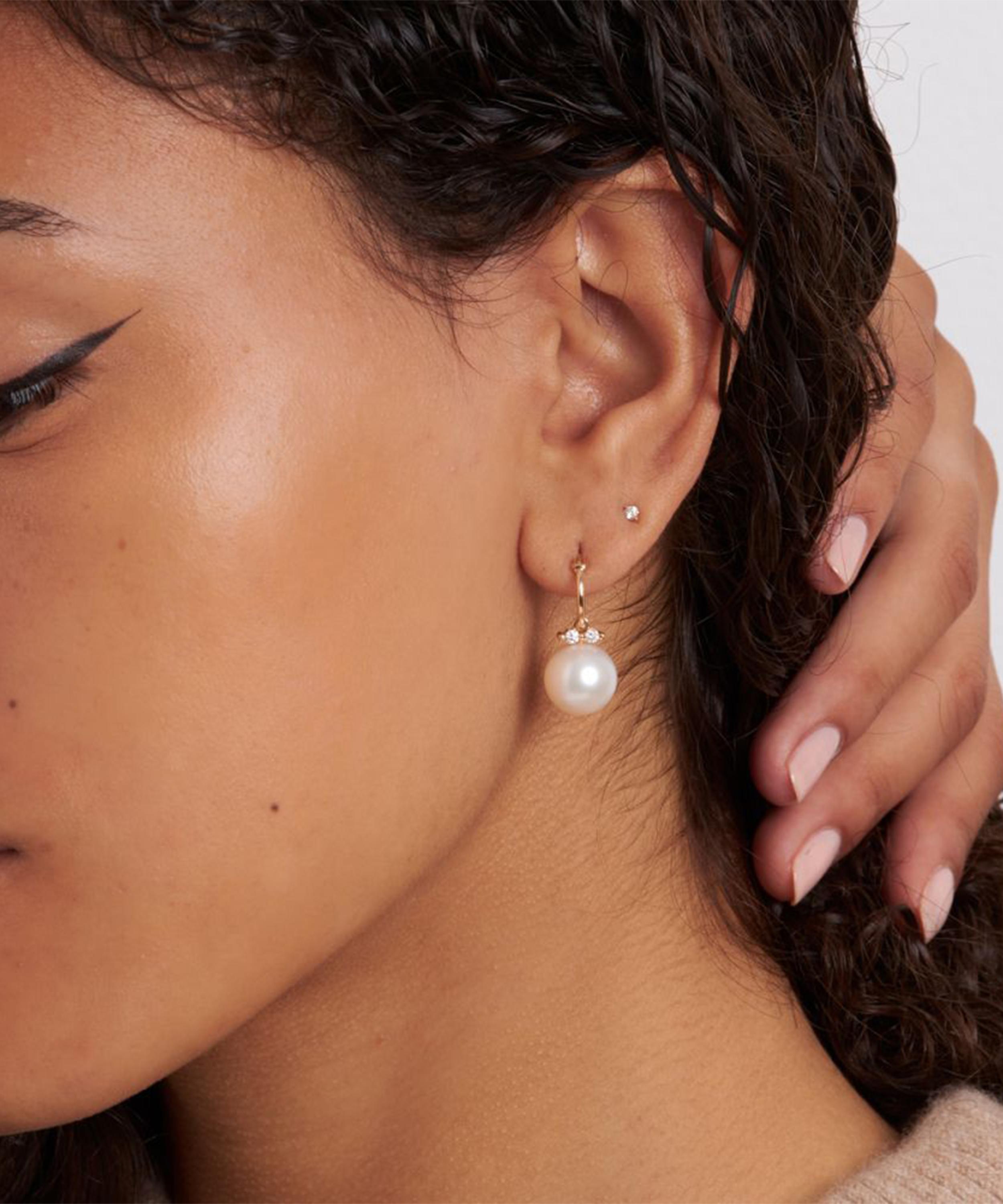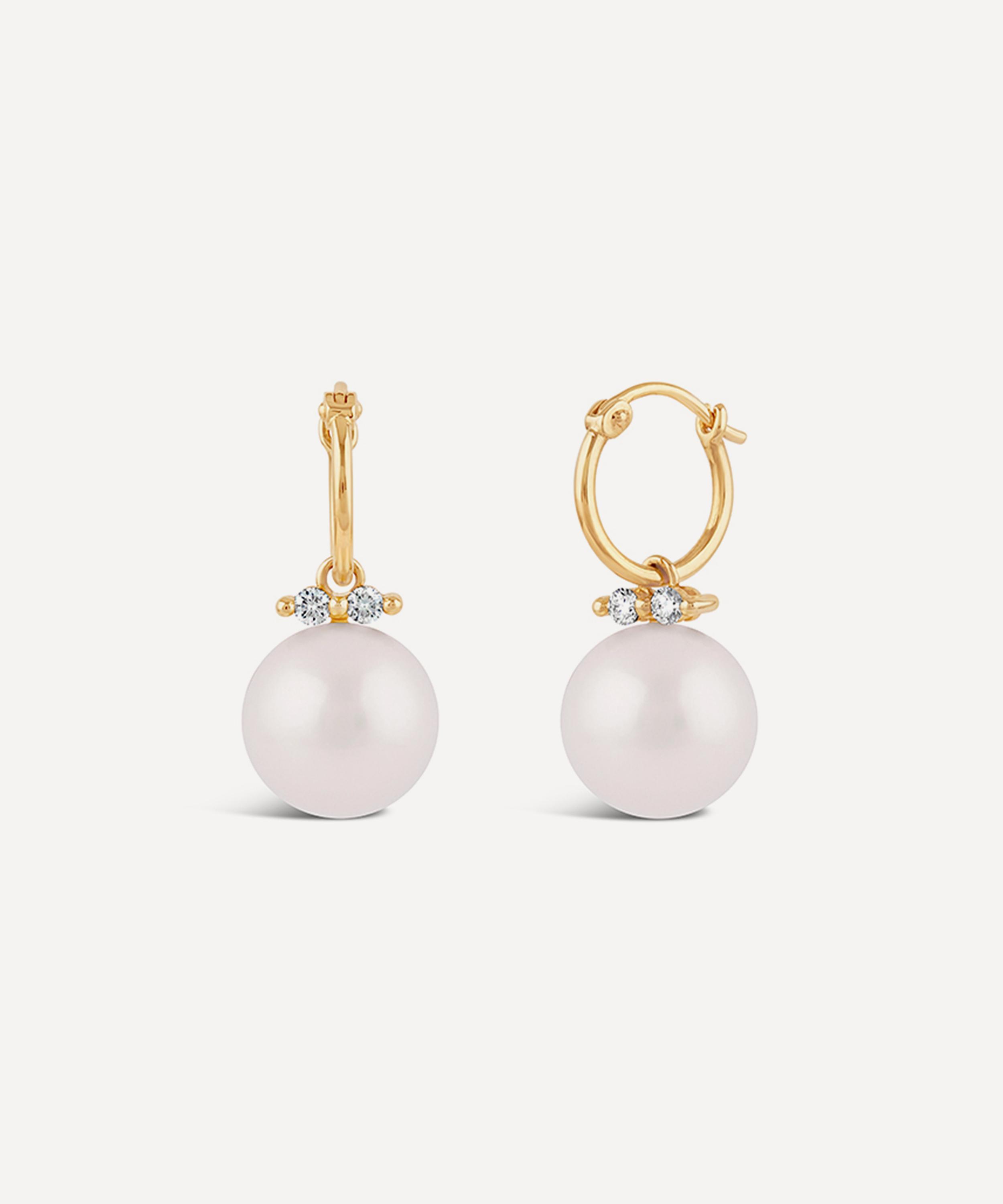Catching the light with a myriad of precious jewels, Dinny Hall's Shuga collection was originally inspired by traditional East Asian dancing costumes, covered with tiny brightly coloured mirrors. Crafted from solid 9 carat gold, each of these hoop earrings is adorned with a large freshwater pearl drop charm with two tiny white diamonds at the top. Style them alone for a minimal everyday look, or layer them with a pair of coordinating Shuga studs for the beginnings of a show-stopping evening curation.