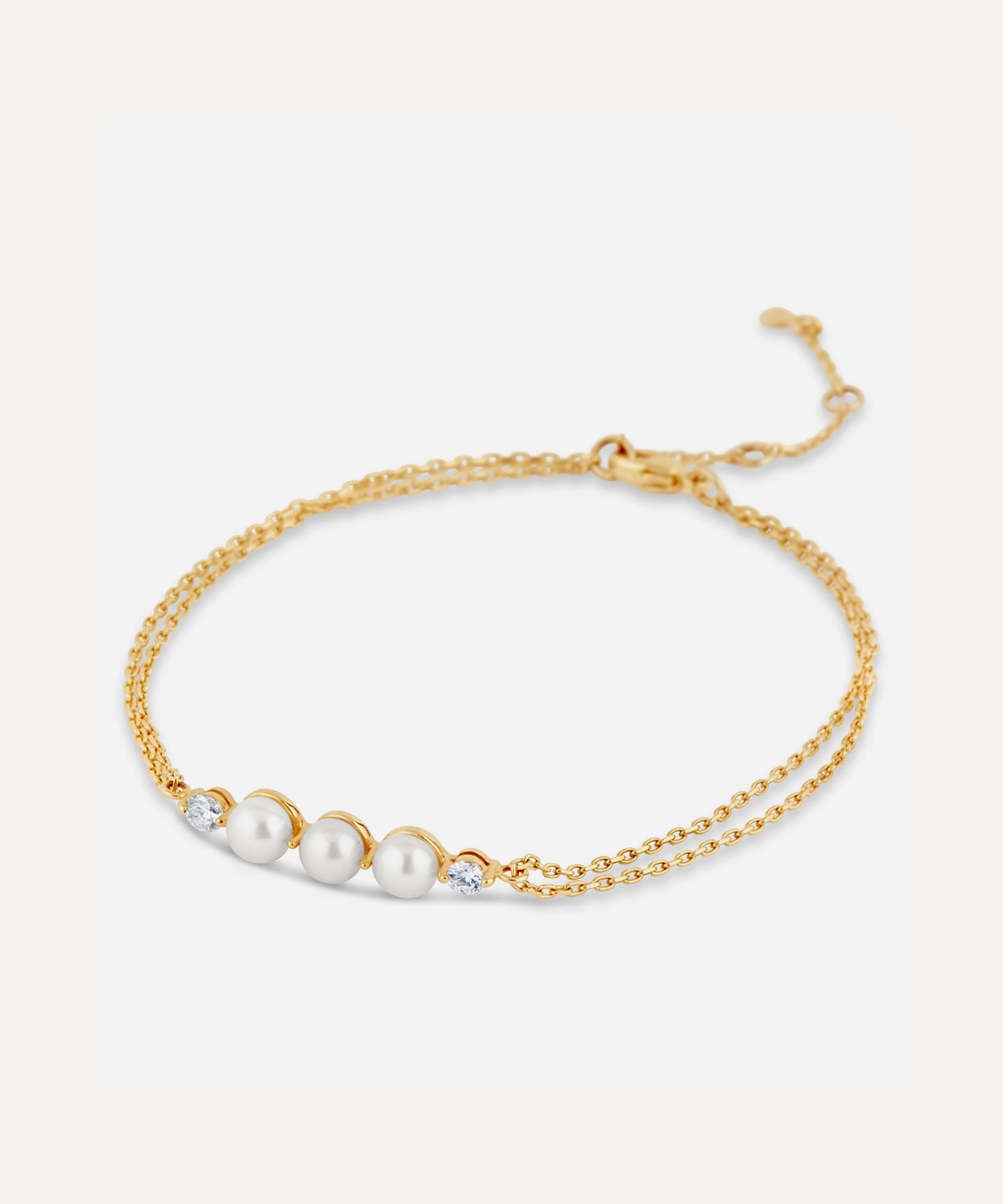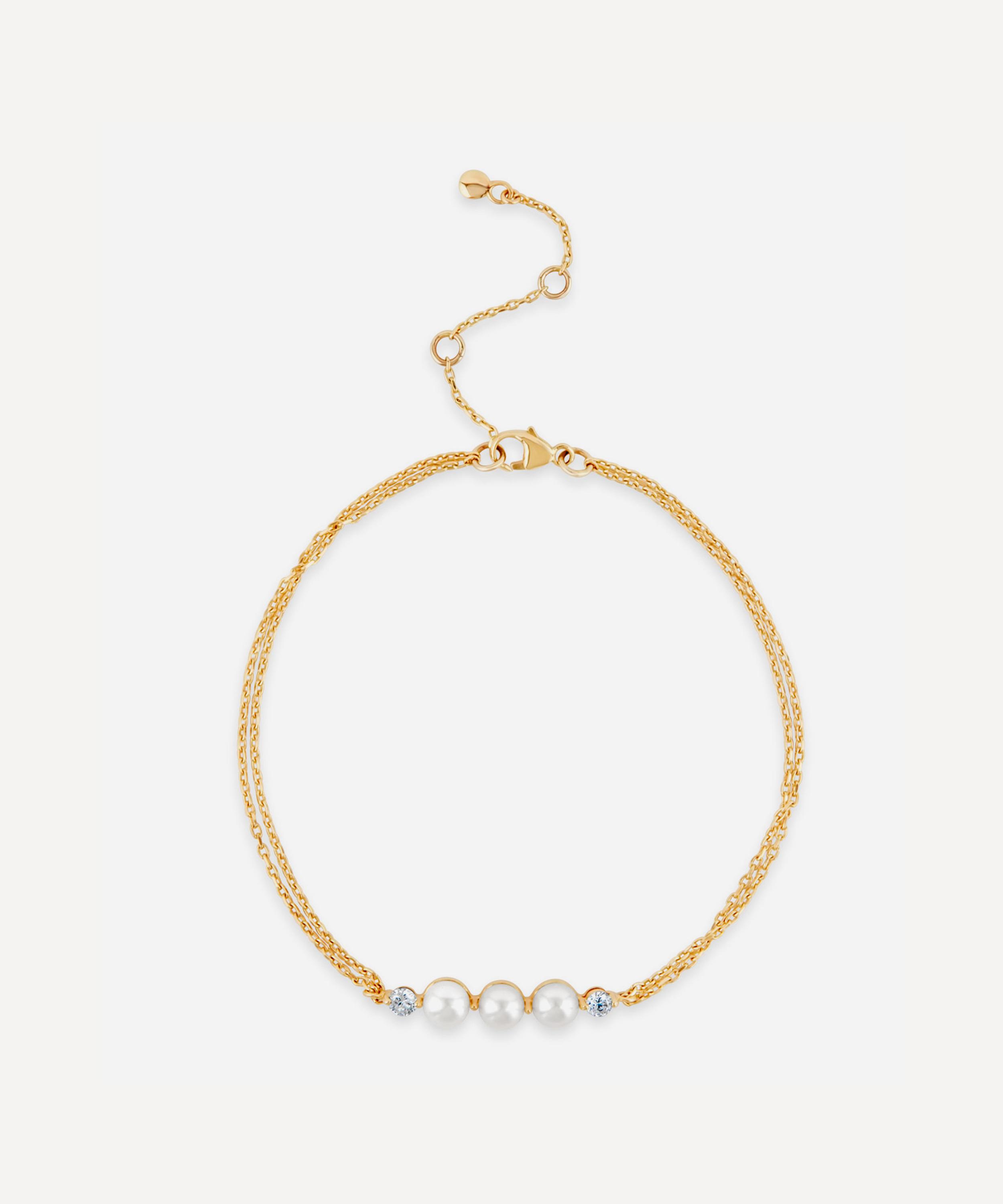 A play on the rhyme 'sugar and spice and all things nice', every piece in Dinny Hall's Shuga collection is dusted with a sprinkling of precious diamonds, coloured gems or lustrous pearls - like icing sugar on a cake. Crafted from solid 9 carat gold, this wristlet features a trio of lustrous freshwater pearls, flanked by two tiny round cut white diamonds on a double-layered, faceted trace chain. Gift it to a loved one as a thoughtful keepsake, or incorporate it into your own everyday bracelet stack for an effortlessly elegant finish.