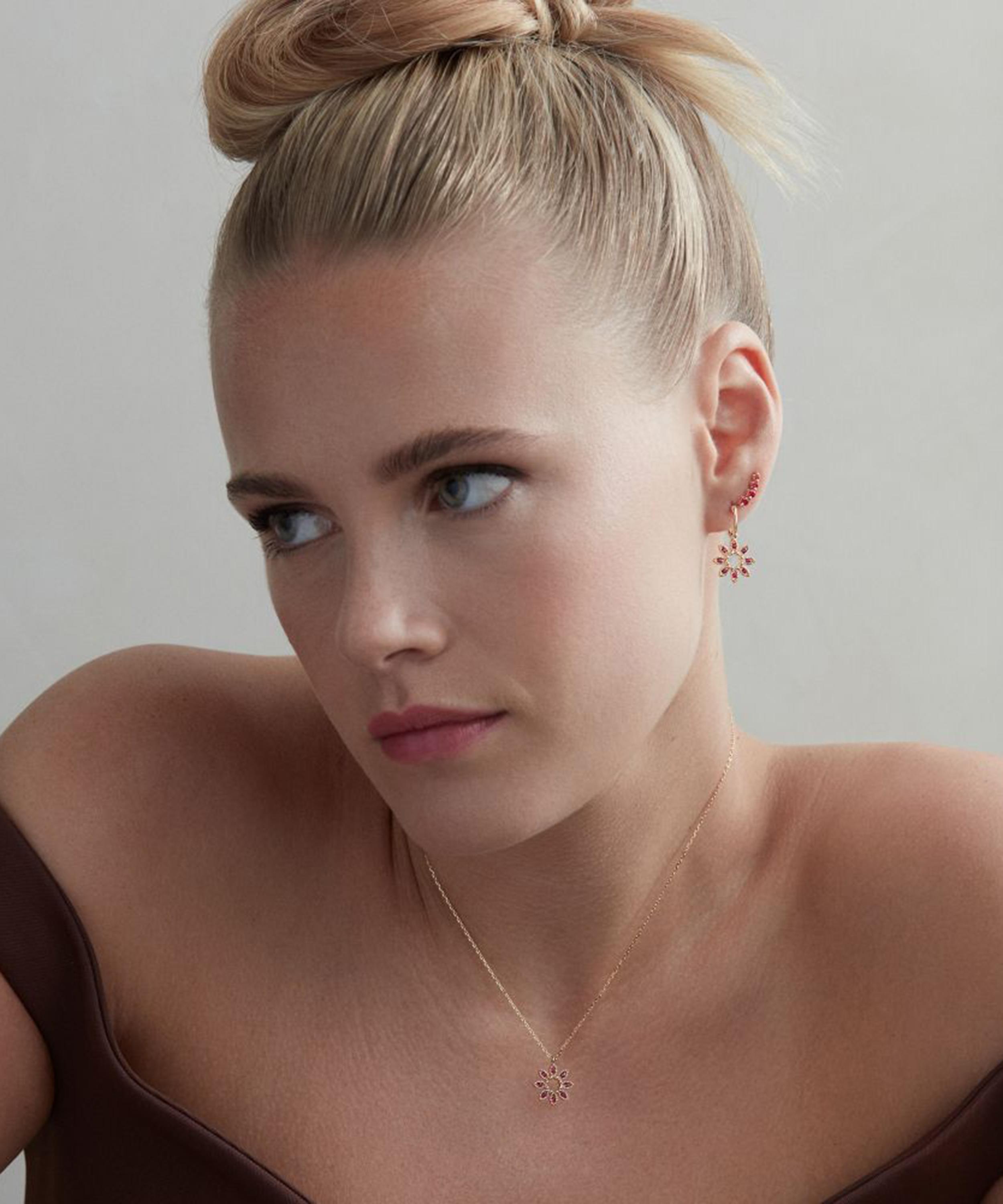 Crafted from solid 9ct gold, each earring features a crawler set with brilliant rubies, graduating in size and mounted in the brand’s delicate Shuga setting, designed to mirror the contour of the ear. Wear them solo, paired with the matching necklace, or incorporate into a stack for optimal impact.
