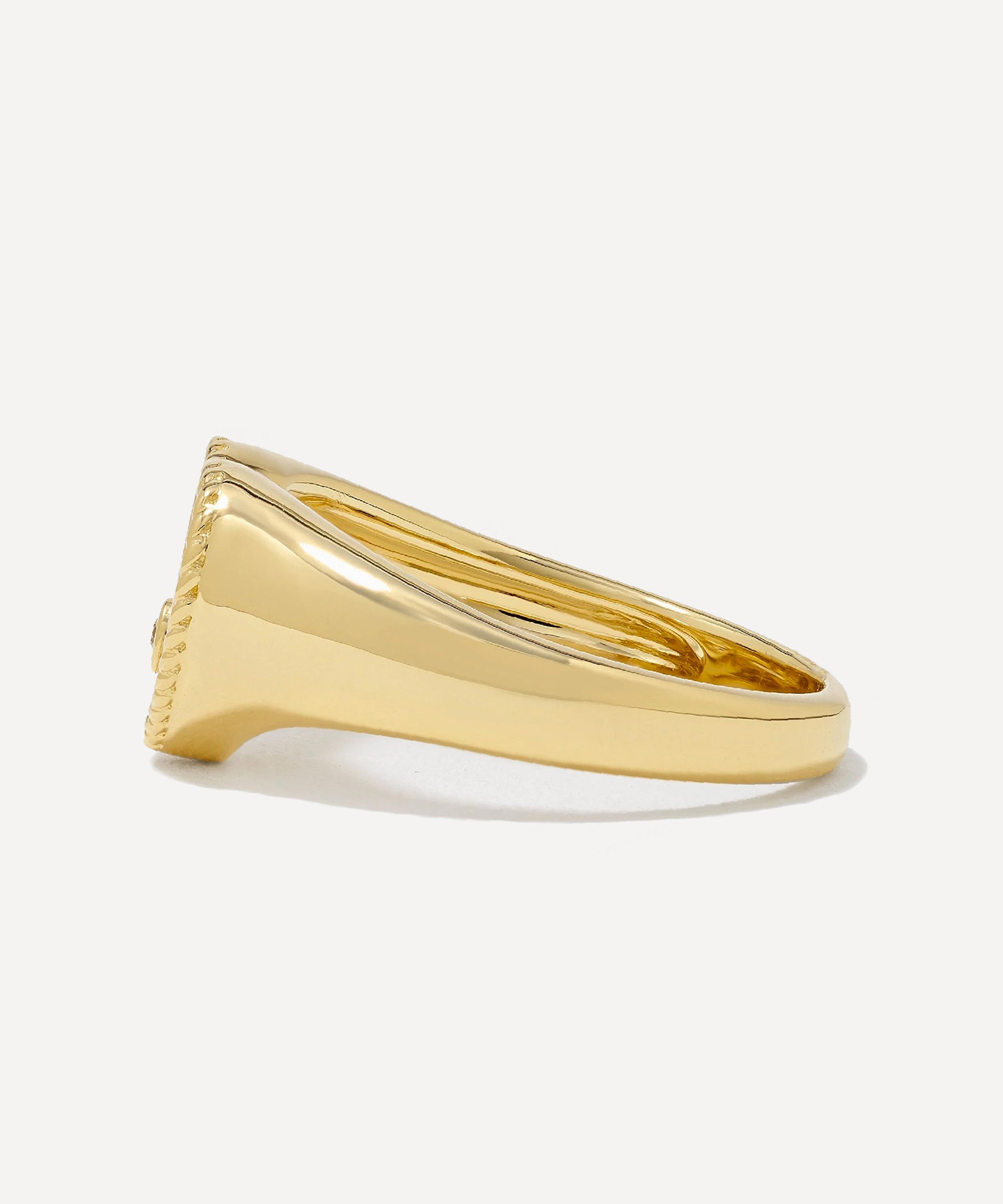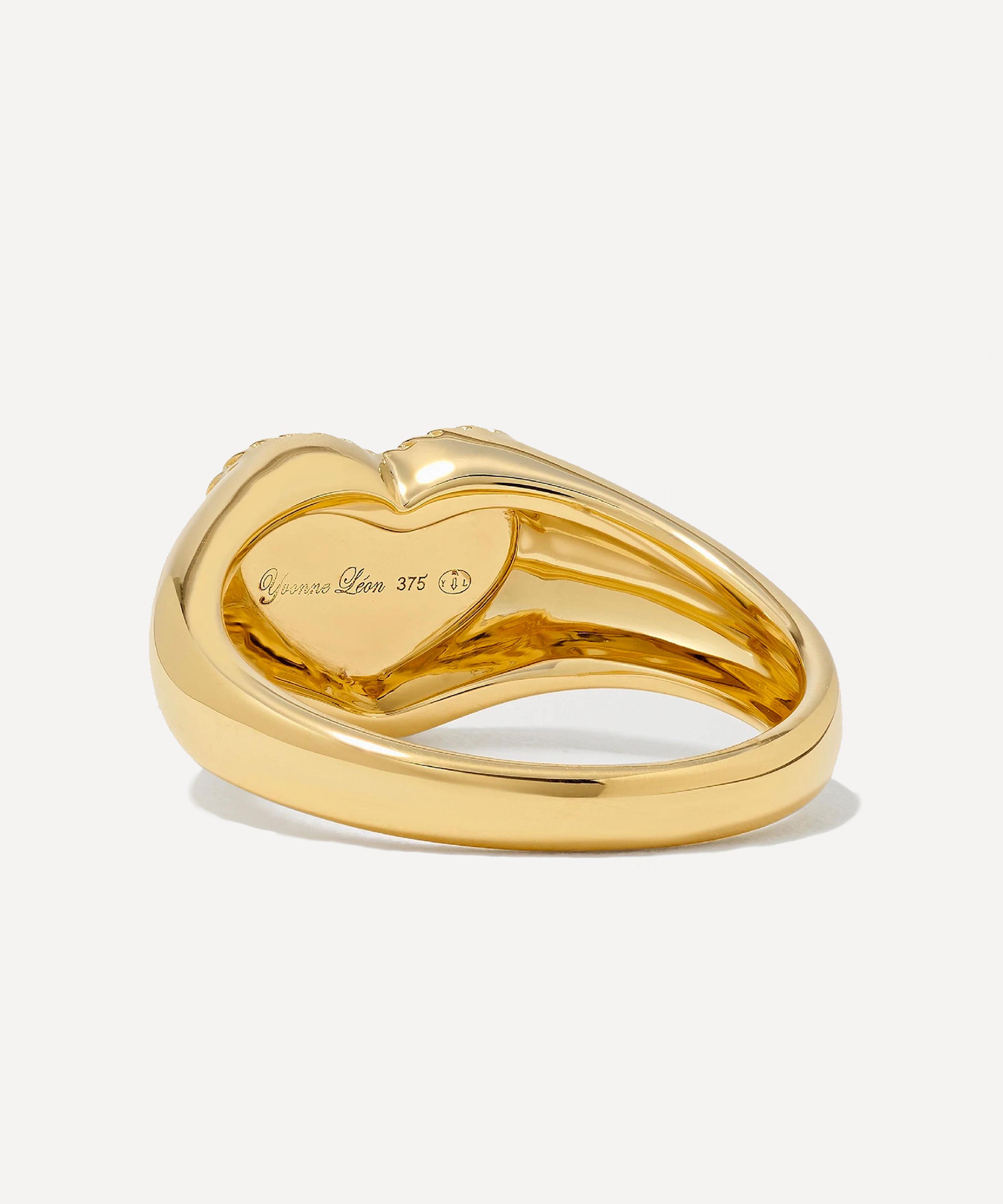 Delve into a world of vintage classics and tie your whole look together with this signet ring from Yvonne Léon. Crafted from 9ct gold, the designer beautifully unites vintage charm with a modern reinvention in this piece – featuring a heart-shaped tigers eye feature, embellished with twisted detailing around the edges, and a round cut, bezel set diamond. Wear it on its own or mix and match with other eccentric rings from the brand.