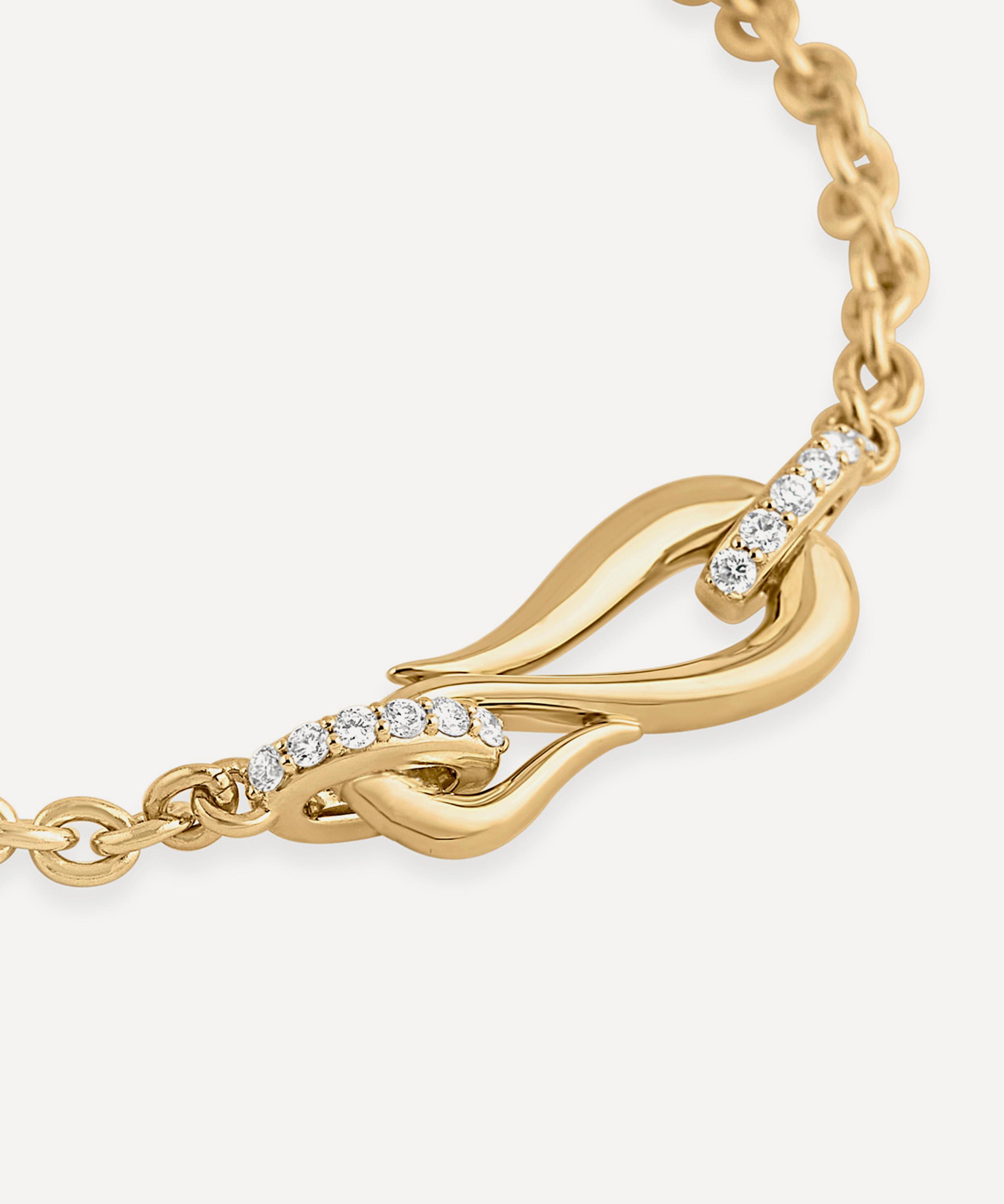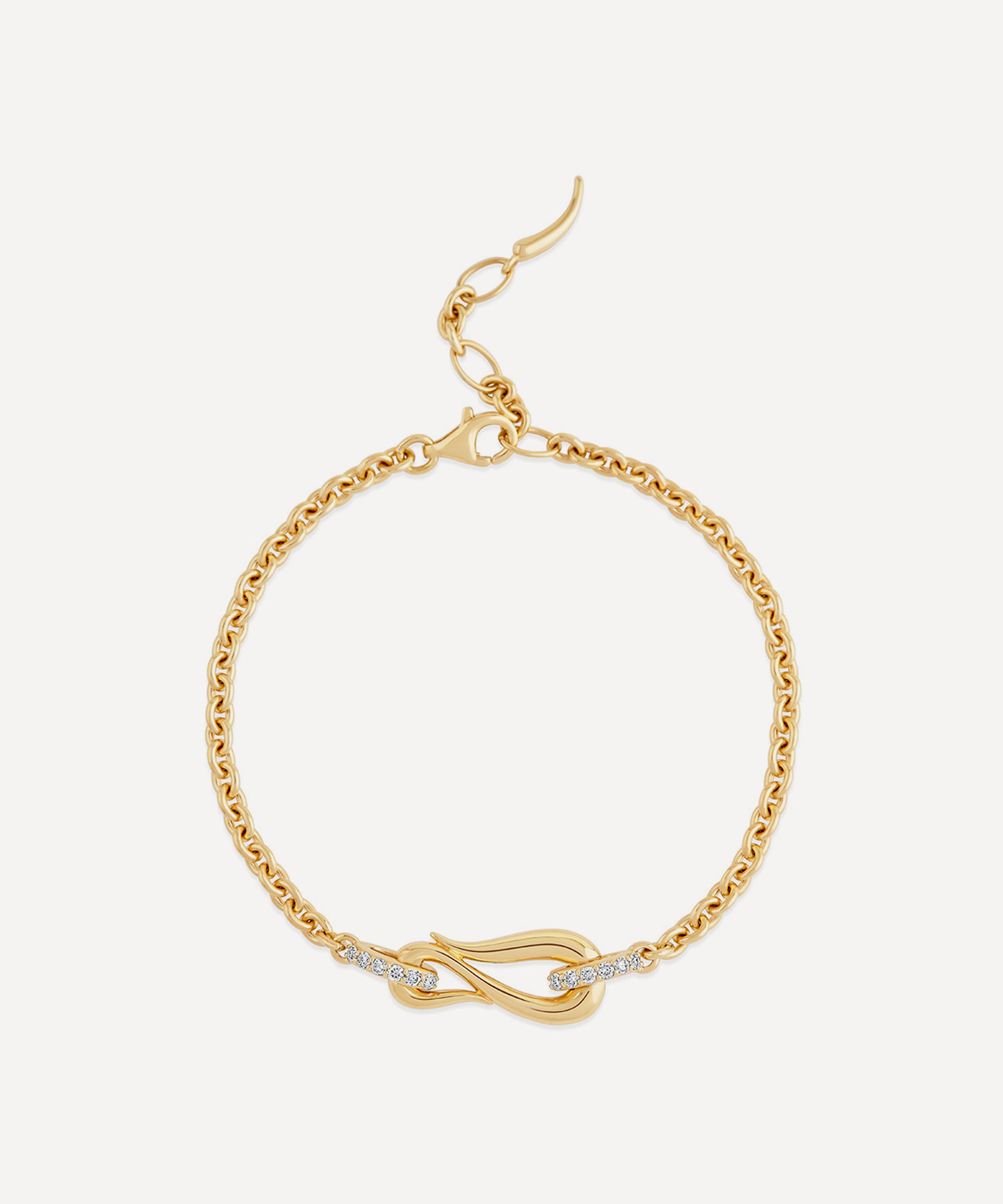 Empower your self-expression and unique style with Dinny Hall’s emblematic Toro Lasso diamond bracelet. Crafted from solid 9ct gold, this exceptional piece of jewellery features a lasso-inspired charm held in place by two diamond encrusted links on a timeless cable chain. A symbol of grace and movement, it’s perfect for gifting. Style it on its own, pair with matching pieces from the collection, or layer with another gold bracelets, chains and charm bracelets to add depth and dimension to your look.