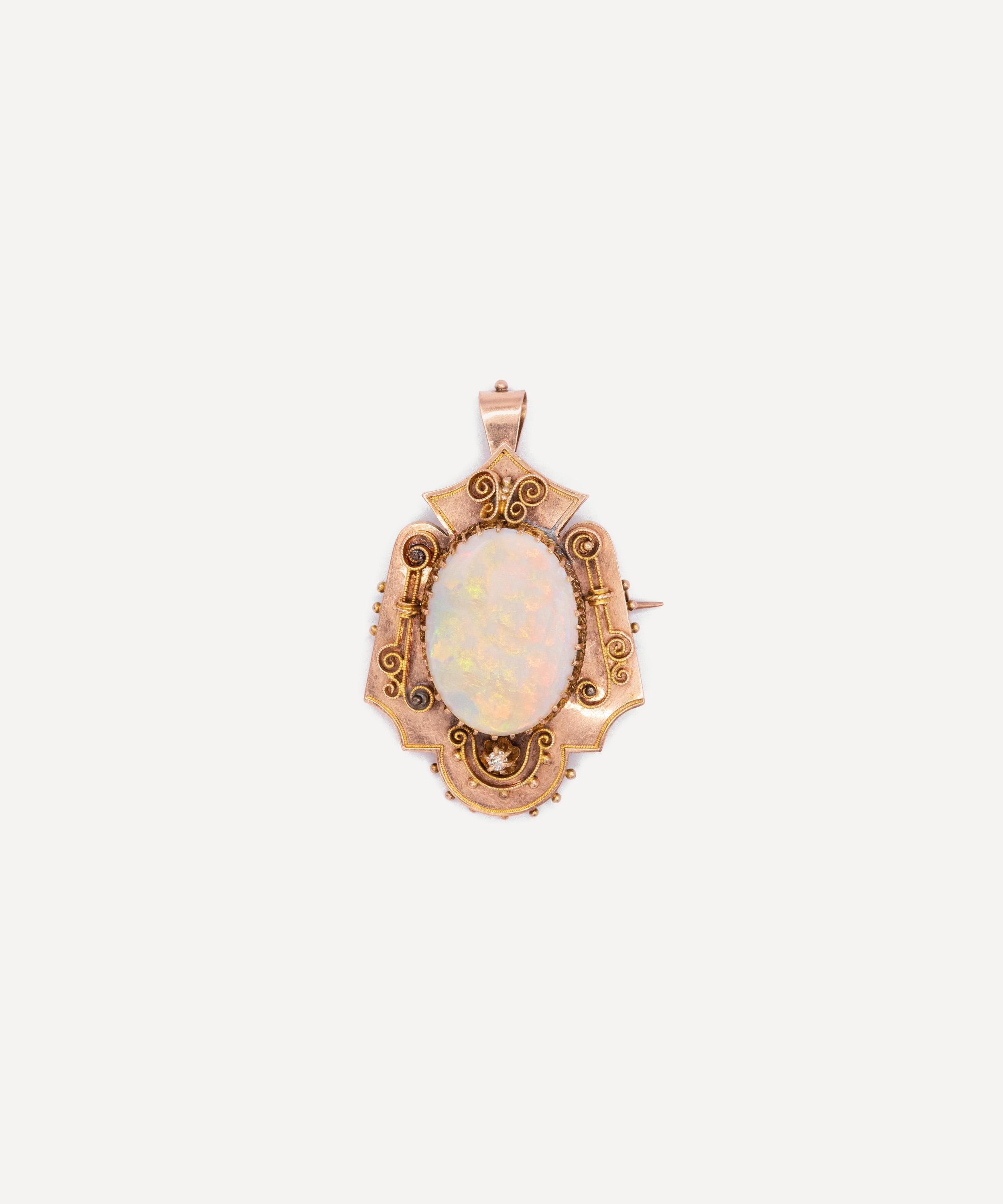 Brimming with character, this antique Victorian brooch boasts a standout piece from Kojis. Crafted from 9ct rose gold, it features an oval cabochon opal, claw set within a decorative plaque adorned with beaded and scroll motifs and a single old European cut diamond. Finished with a hook and pin fastening, it can be worn as a brooch or pendant. Style it on the lapels of your favourite blazer or blouse and try teaming it with several other artisanal brooches and pins for a maximalist take on traditional formalwear.