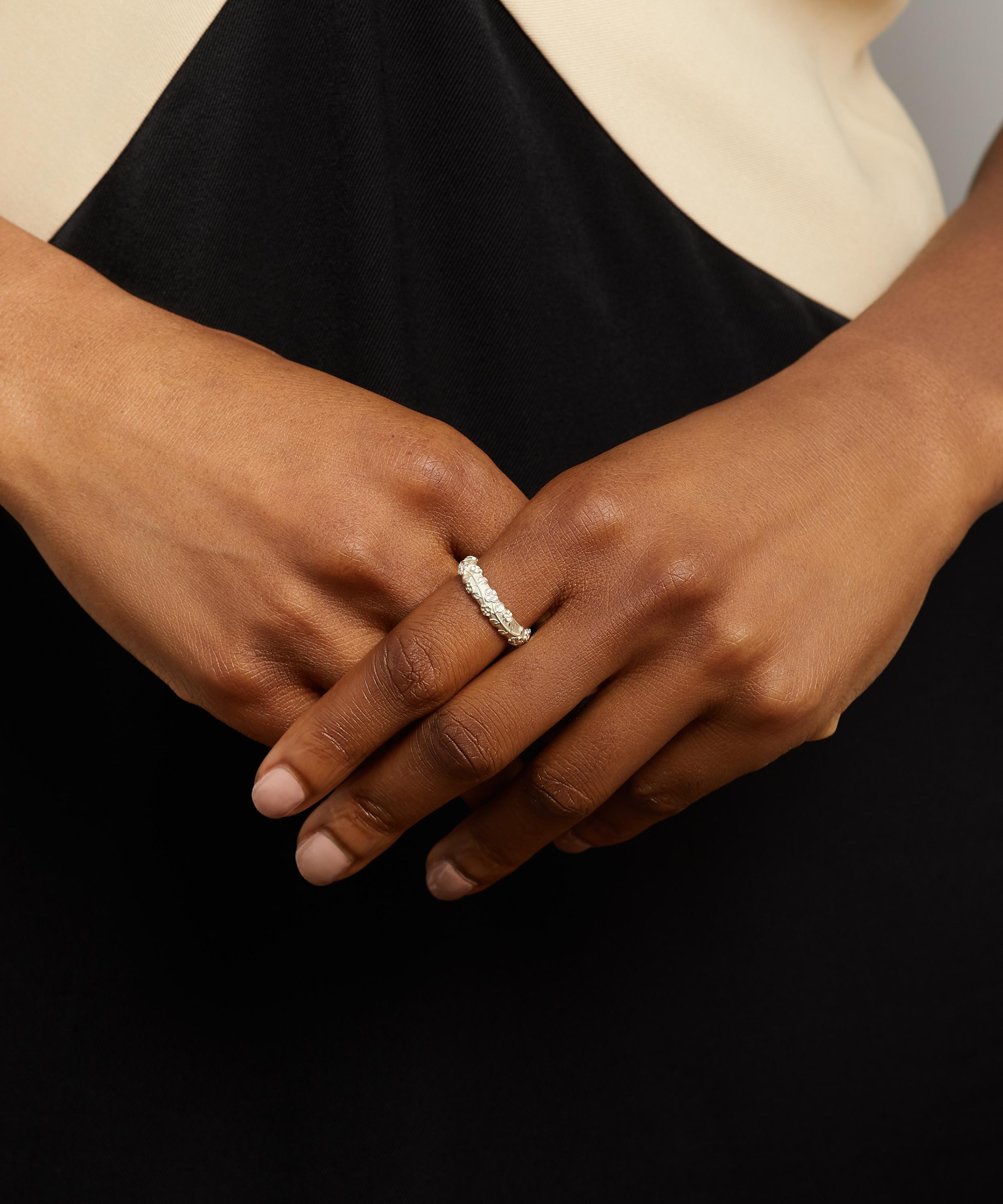 Liberty’s Blossom collection is a celebration of the vibrant floral motifs of the Arts & Crafts movement and the intricate wooden carvings of Tudor architecture. Studded with glittering white diamonds, this ring features an artfully engraved design of trailing gold florals that recall Japanese cherry blossoms and the floral carvings dotted throughout Liberty’s iconic flagship store. Mix and match with other contrasting metals and finishes from the Blossom collection to create an enchanting wearable garden of precious gold and silver.