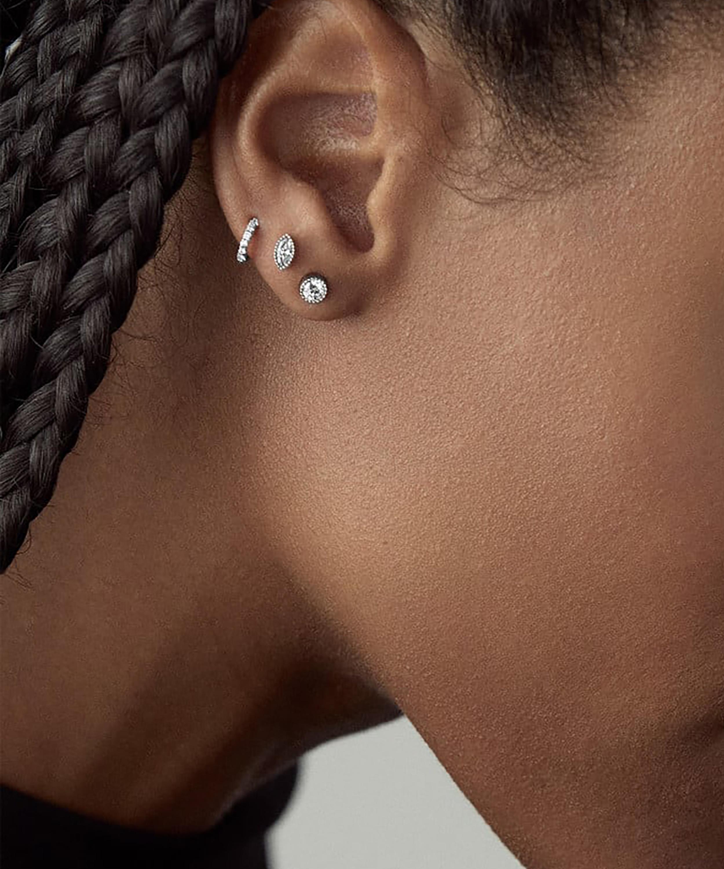 Crafted from solid 9ct white gold in a polished finish to a tiny hoop silhouette, each charming earring is adorned with a row of radiant lab-grown diamonds – catching the light from every angle. This timeless pair boast a jewellery box mainstay that are best suited for an upper lobe piercing. Wear alone, or style with other studs and hoops for a sparkling ear curation.