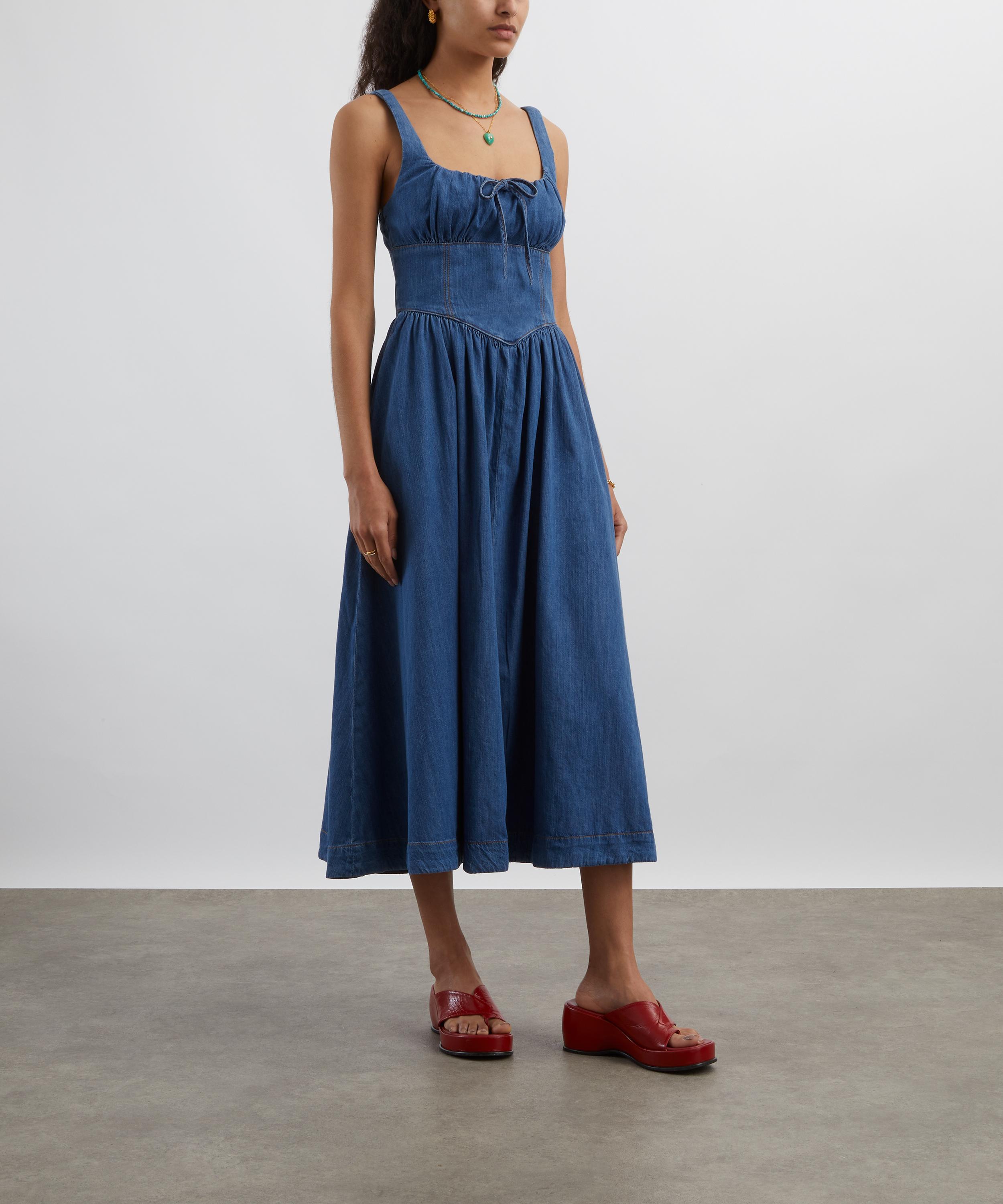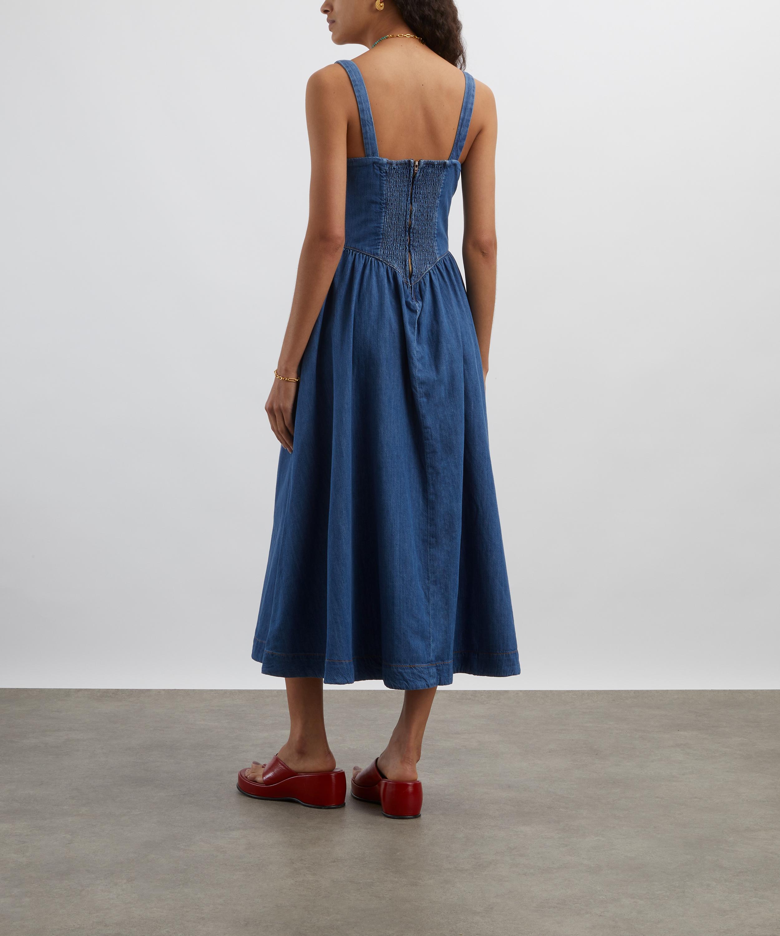 Crafted from non-stretch denim twill, the Balia dress exudes effortless elegance. Designed with a scoop neckline, gathered bodice, and smocked back, its fitted empire waist falls into a softly swaying A-line skirt for a romantic, feminine silhouette.