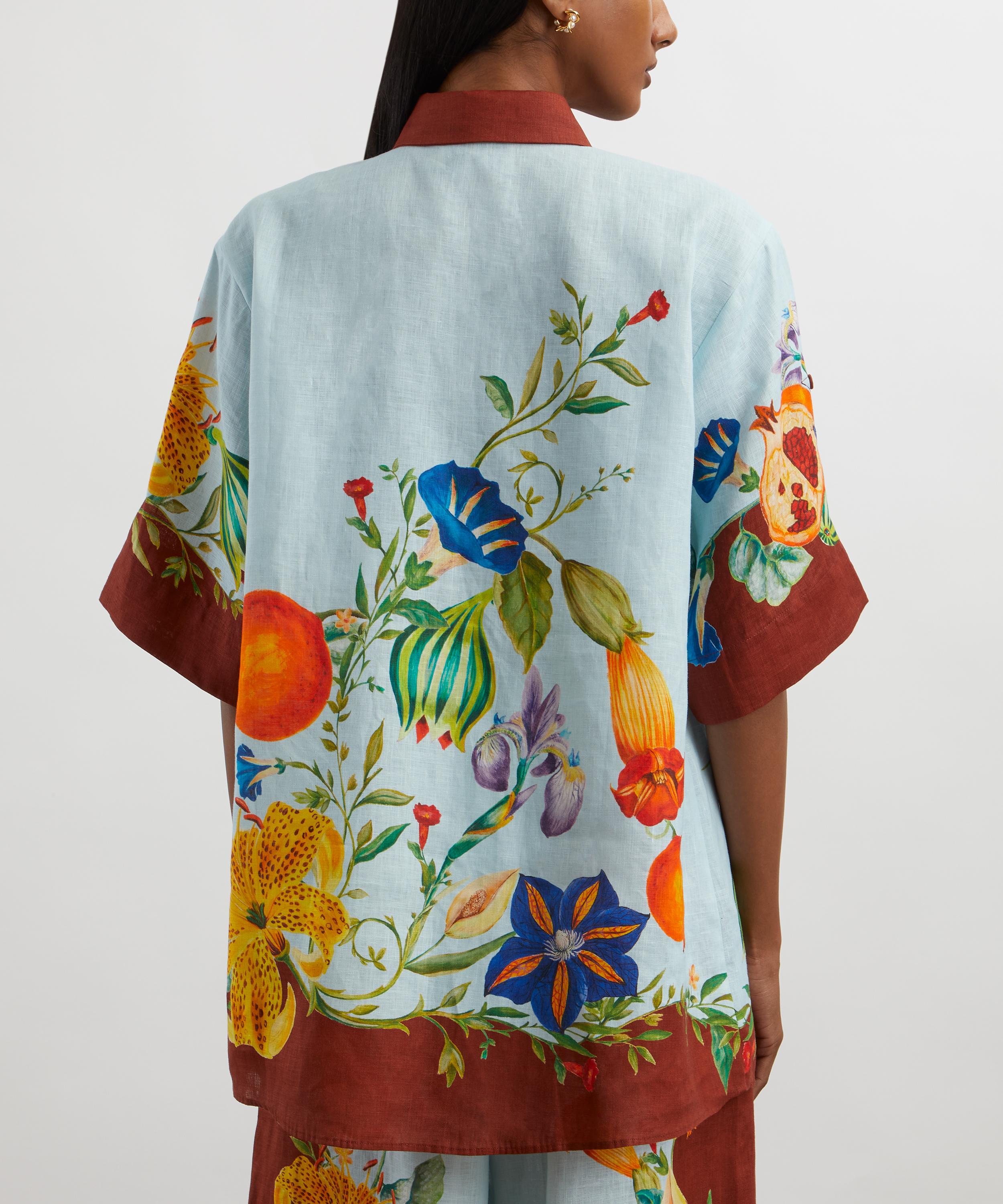 Constructed from lightweight linen, this relaxed-fit shirt features a vibrant fruit and flower pattern and bold, contrasting borders. Complete with dropped shoulders, short rolled sleeves secured with adjustable button tabs, and a minimalist concealed button placket, it is ideal for both casual outings and lounging at home.