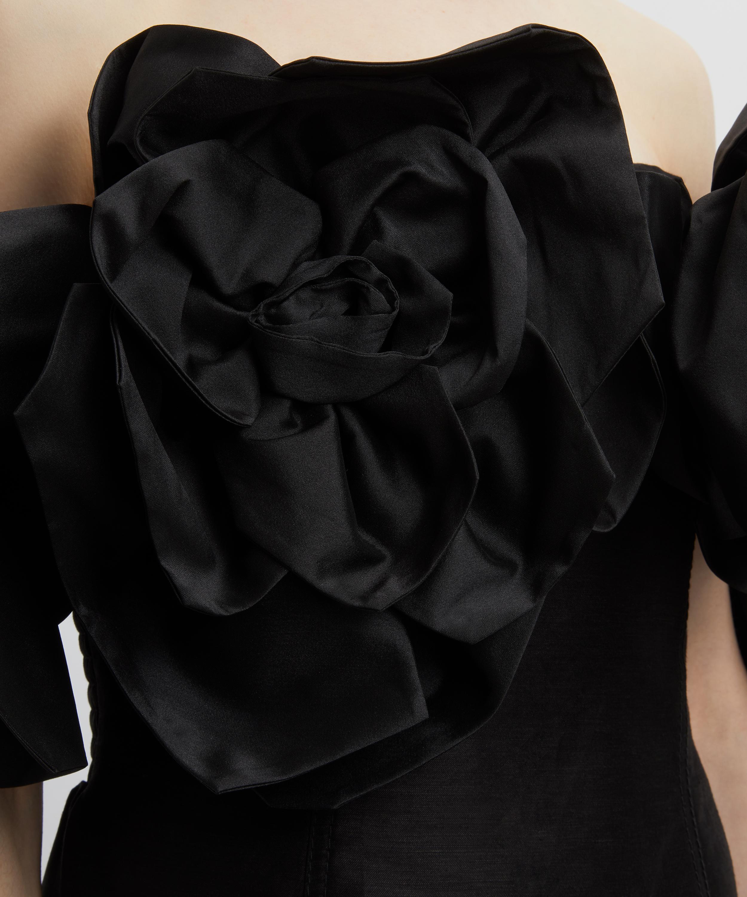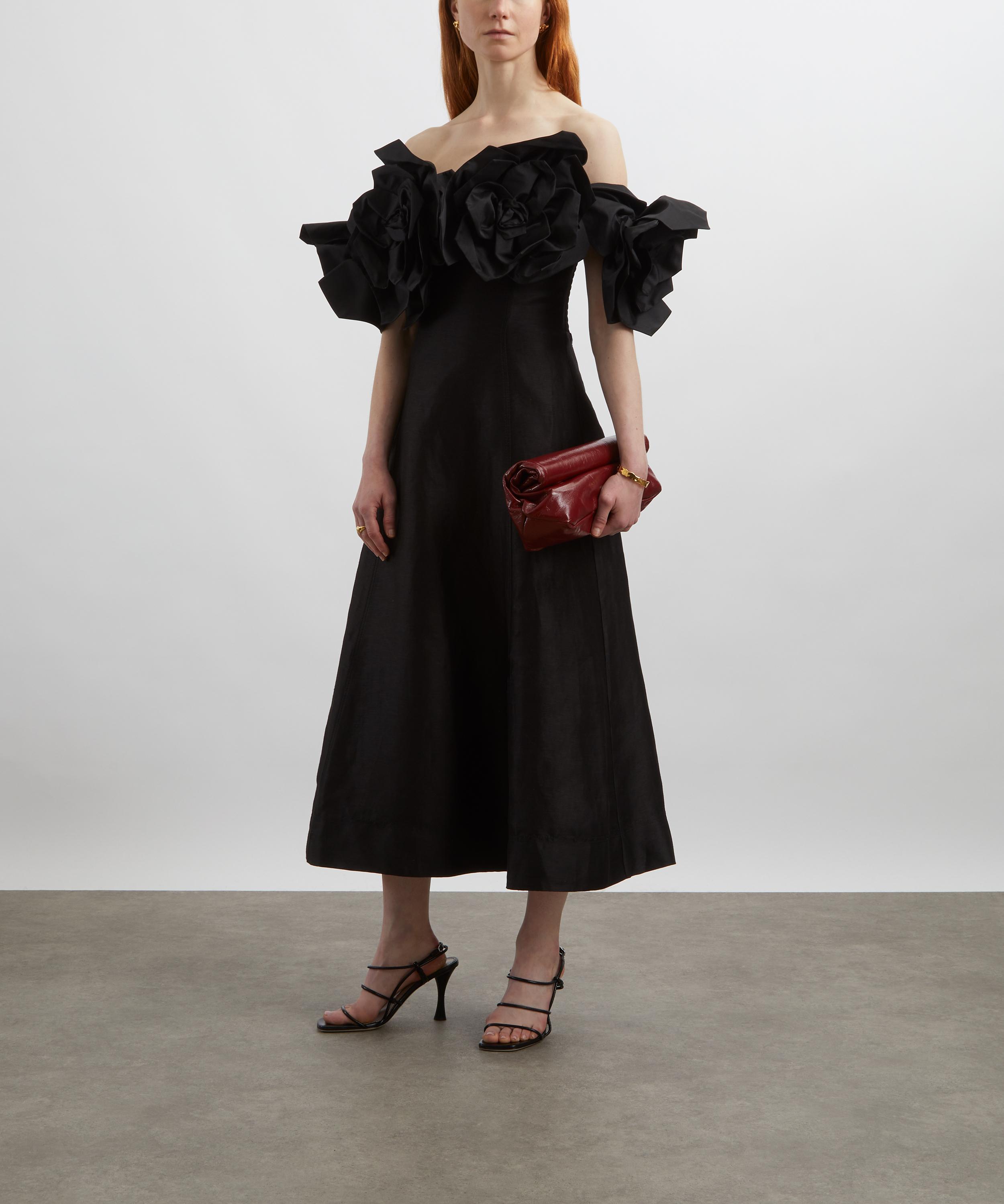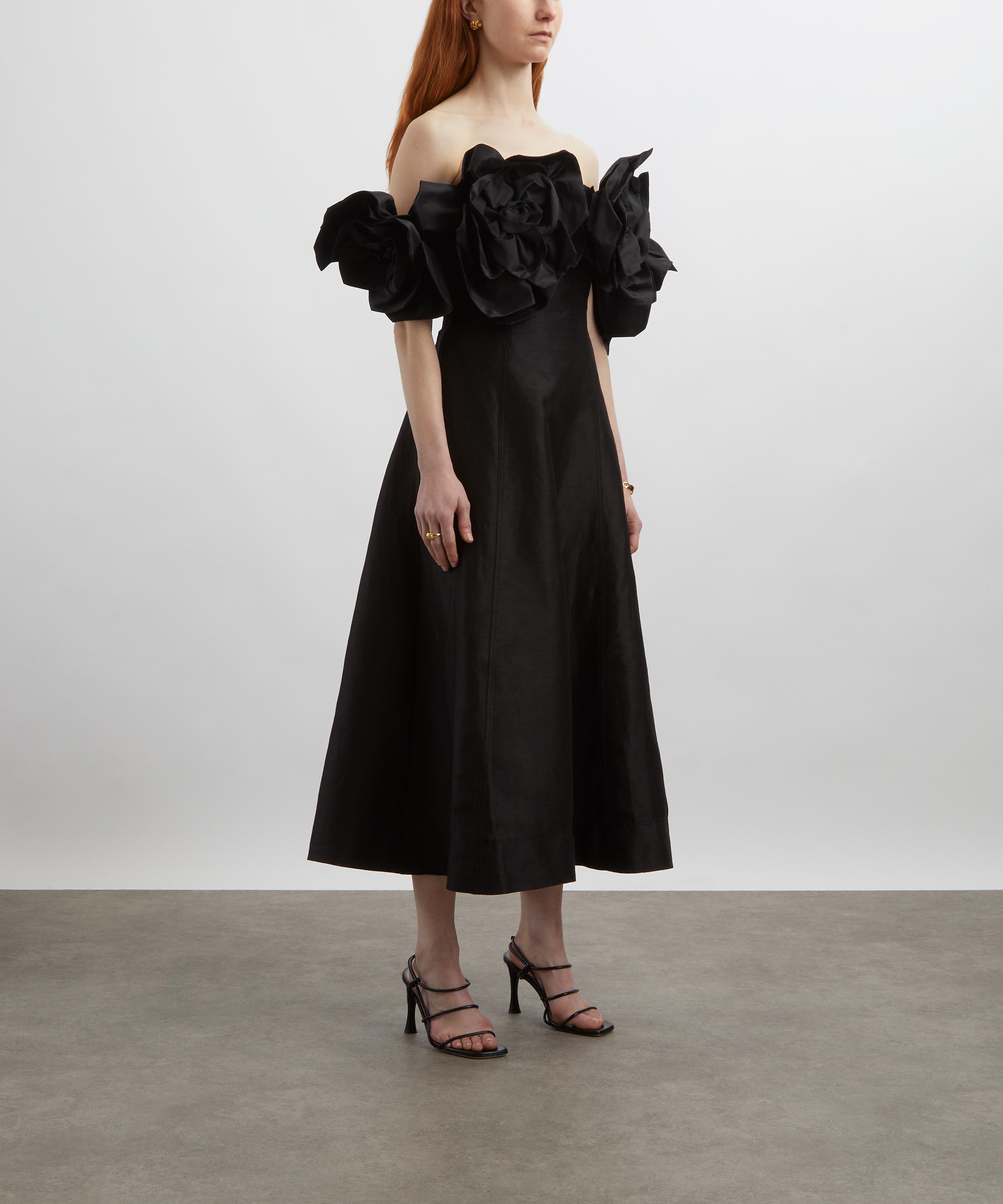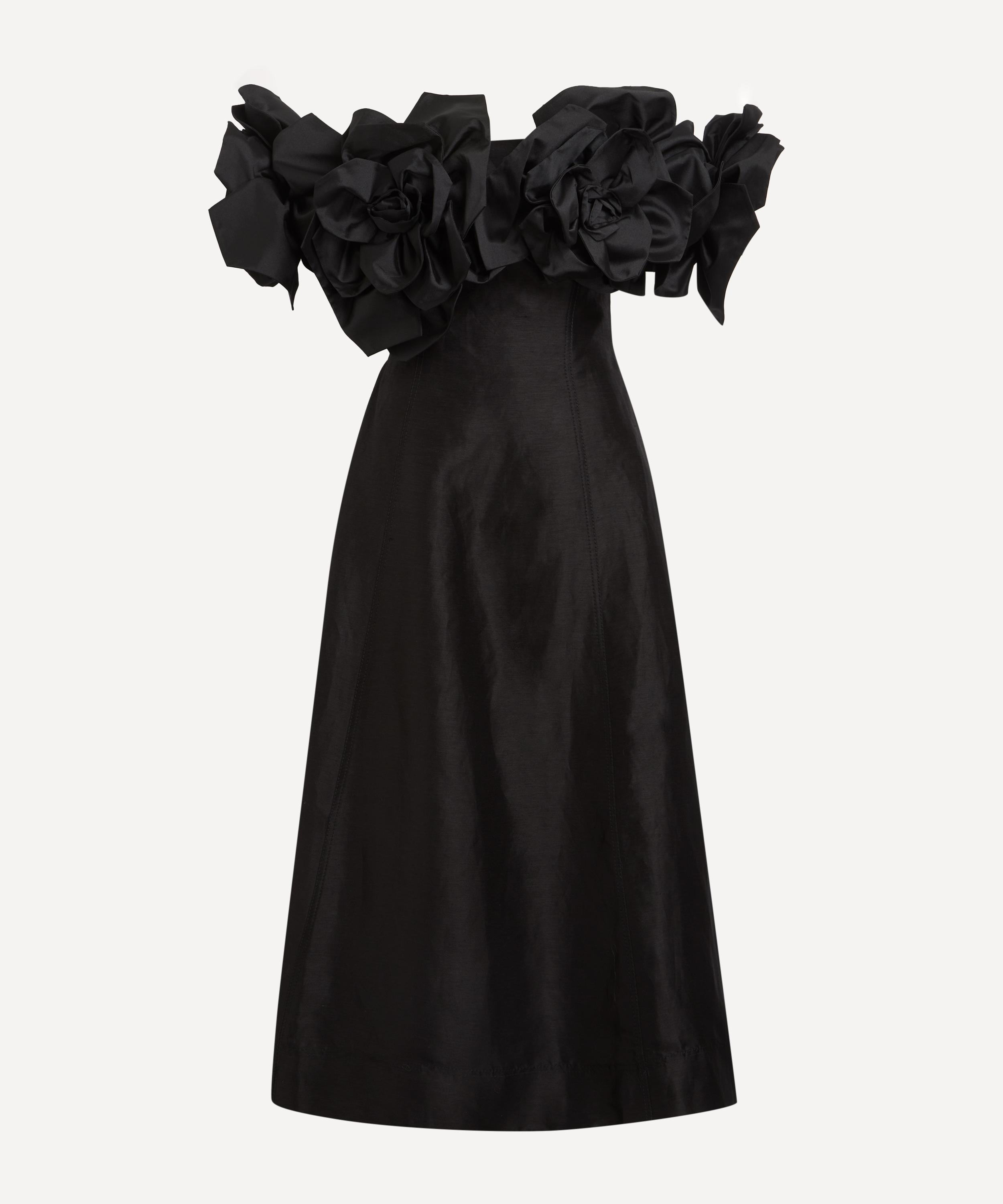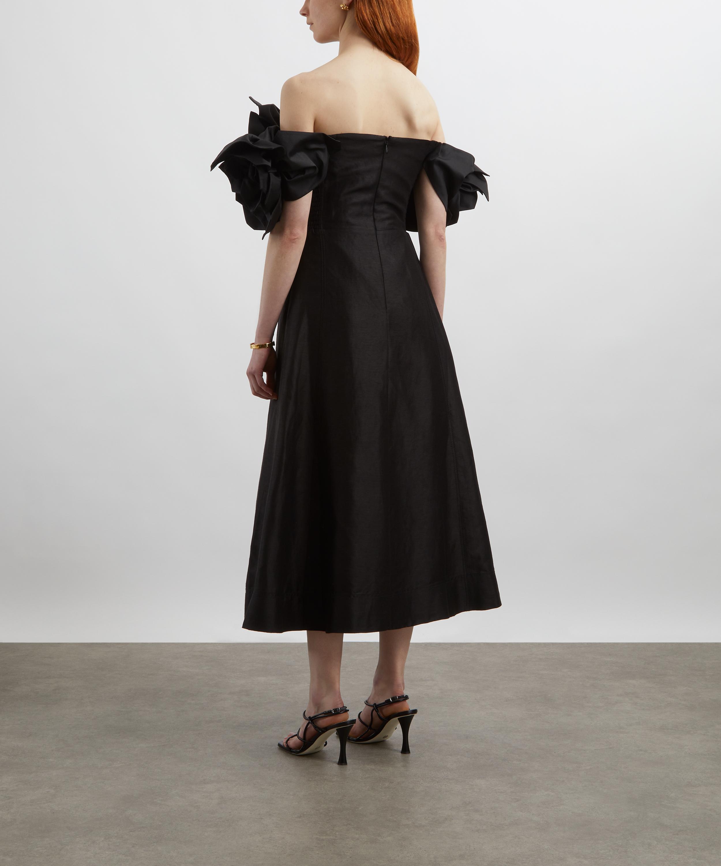 With its flattering fit-and-flare silhouette and off-the-shoulder neckline, the Etta midi dress makes a bold and unforgettable statement. Crafted from a premium linen and viscose blend, the black gown is beautifully finished with a decorative floral detailing across the bodice for an added touch of sophistication.