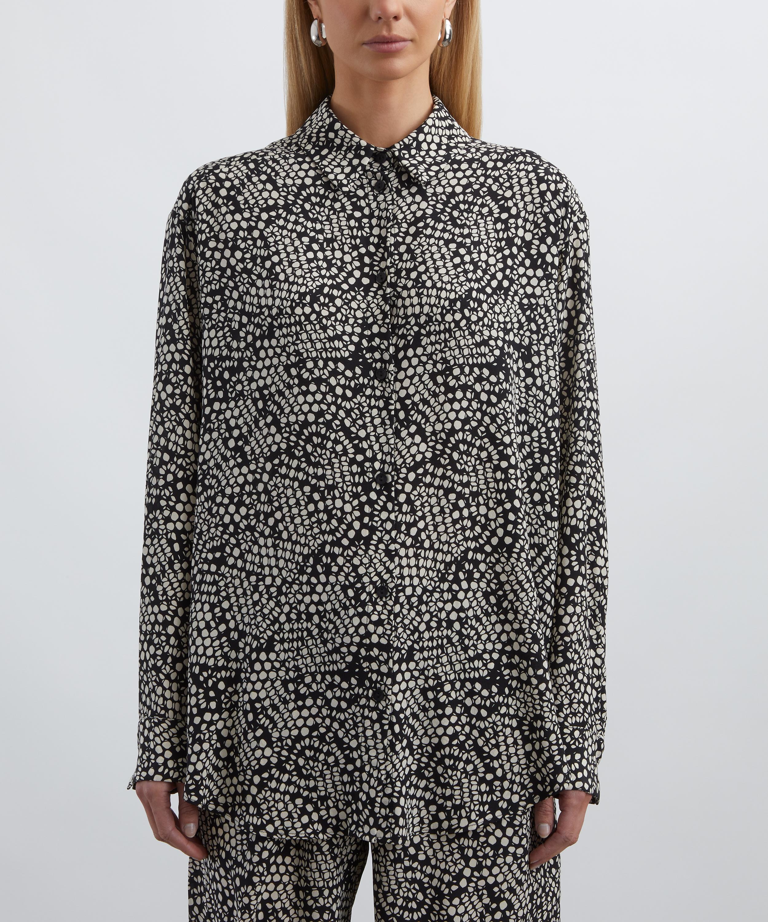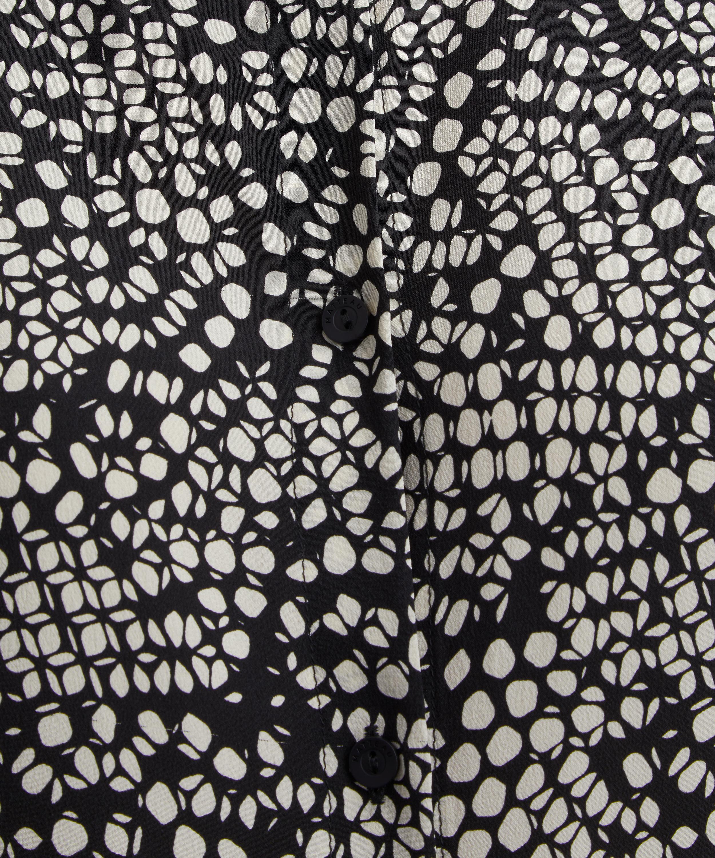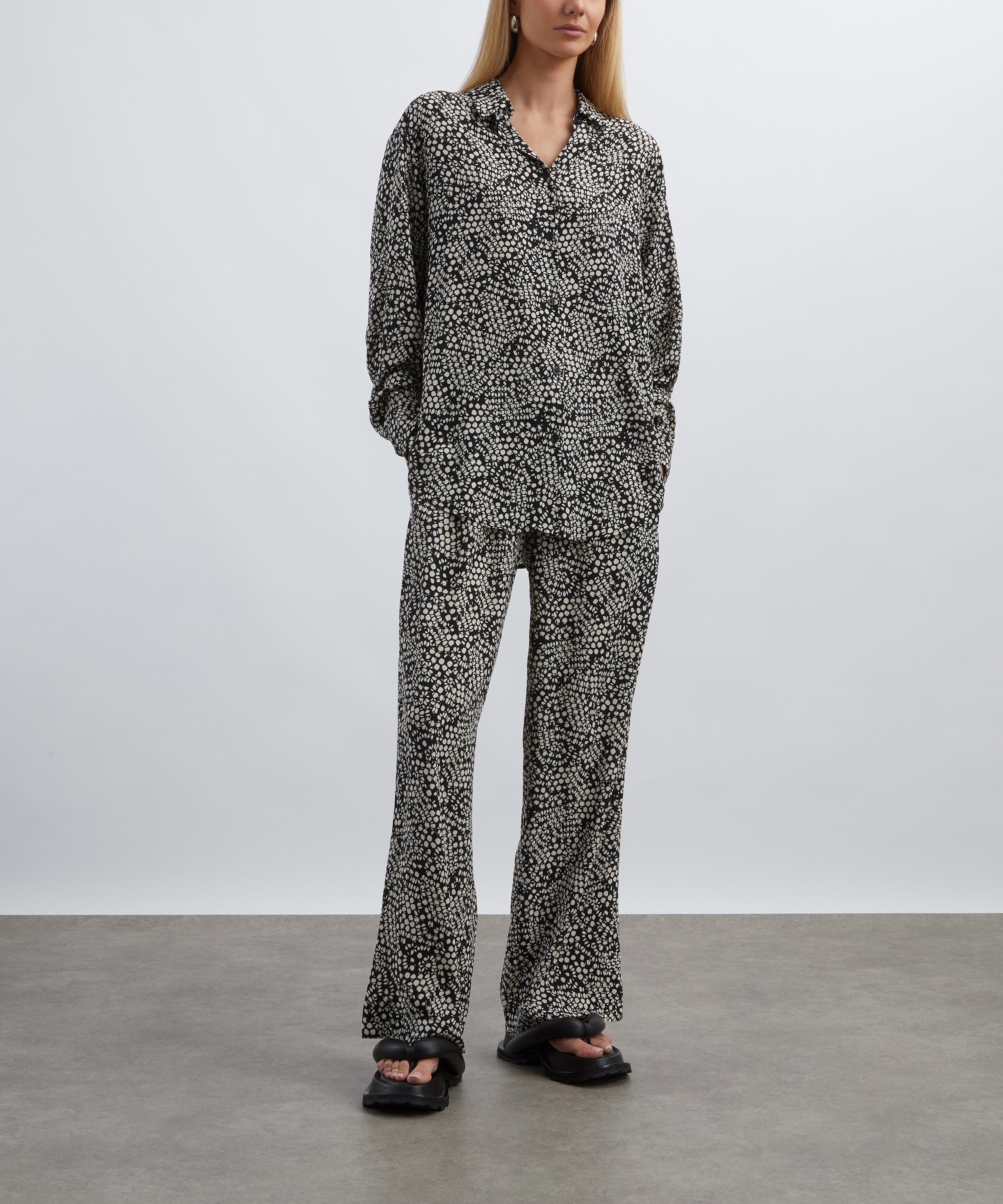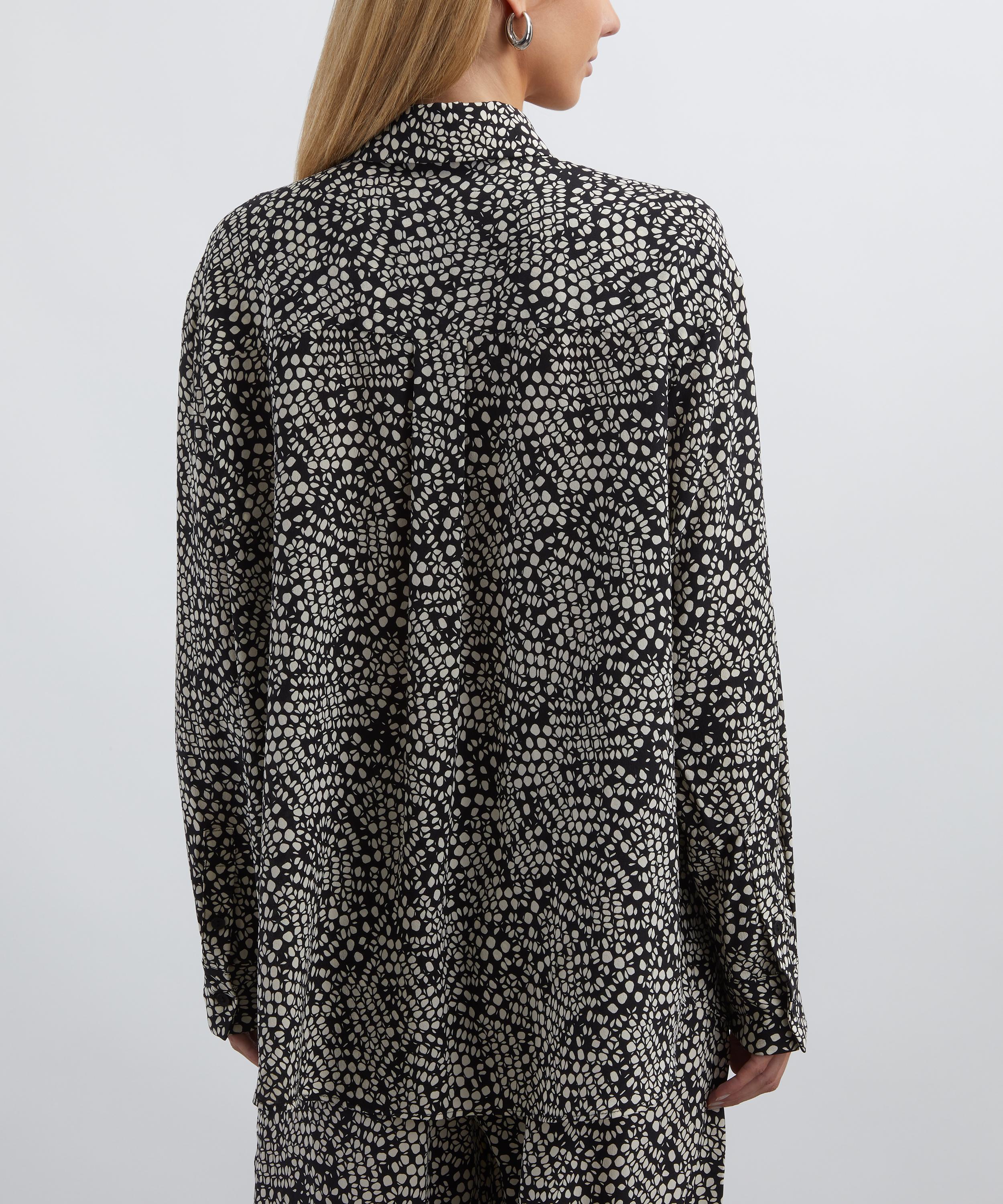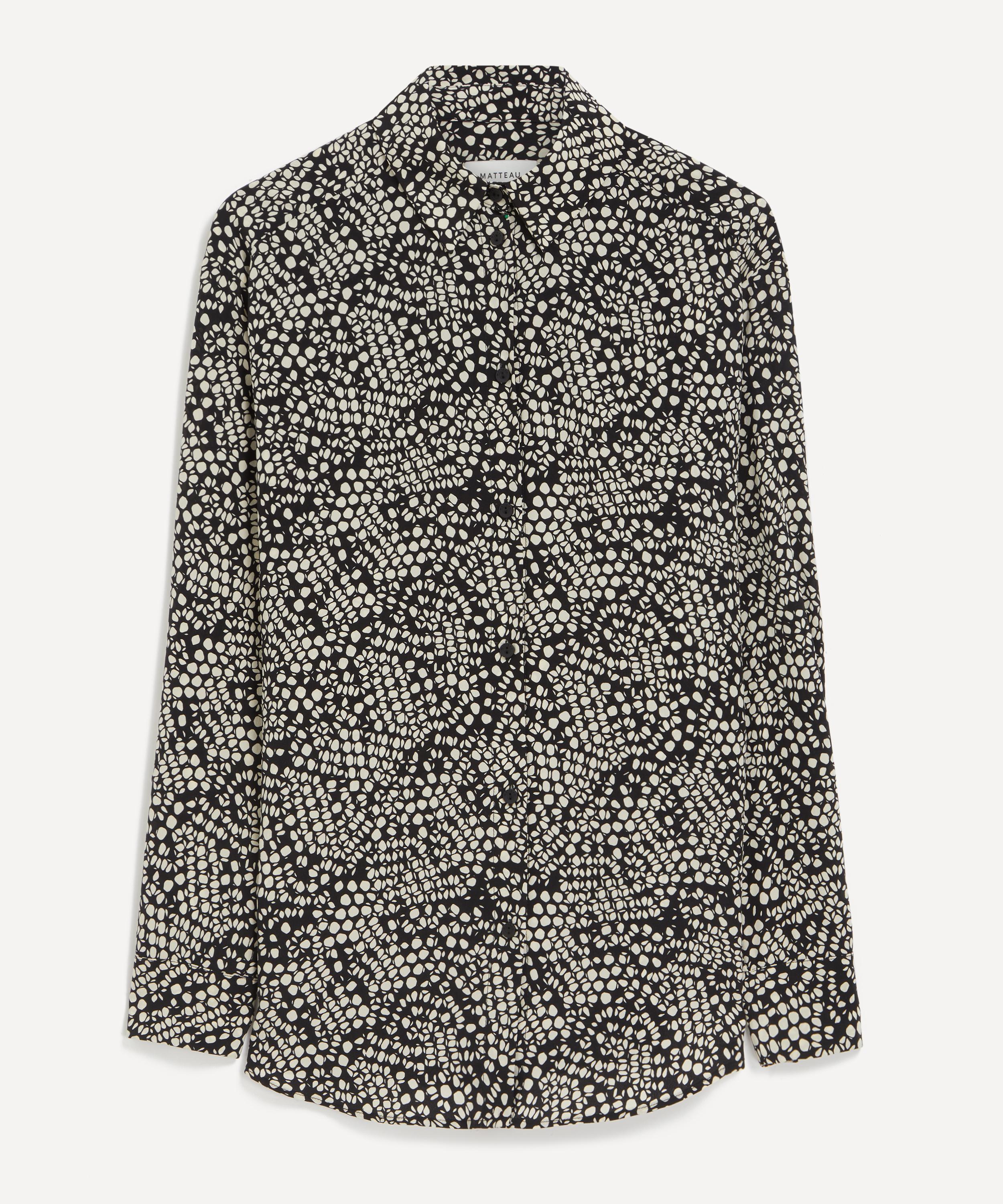 Crafted from lightweight silk crepe de chine adorned with a bold monochrome print, this vintage-inspired shirt exudes effortless refinement. Designed for an oversized fit with long slides, it has an exposed button placket and side splits. Pair it with the matching Drawstring Trousers for an elevated evening look.